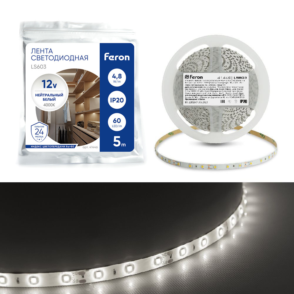 Лента светодиодная 12V FERON LS603, 60*SMD2835, 4,8W/m, IP20, 4000К (нейтральный белый), Кратность резки мм 50мм, 5000 *8 *1.22мм