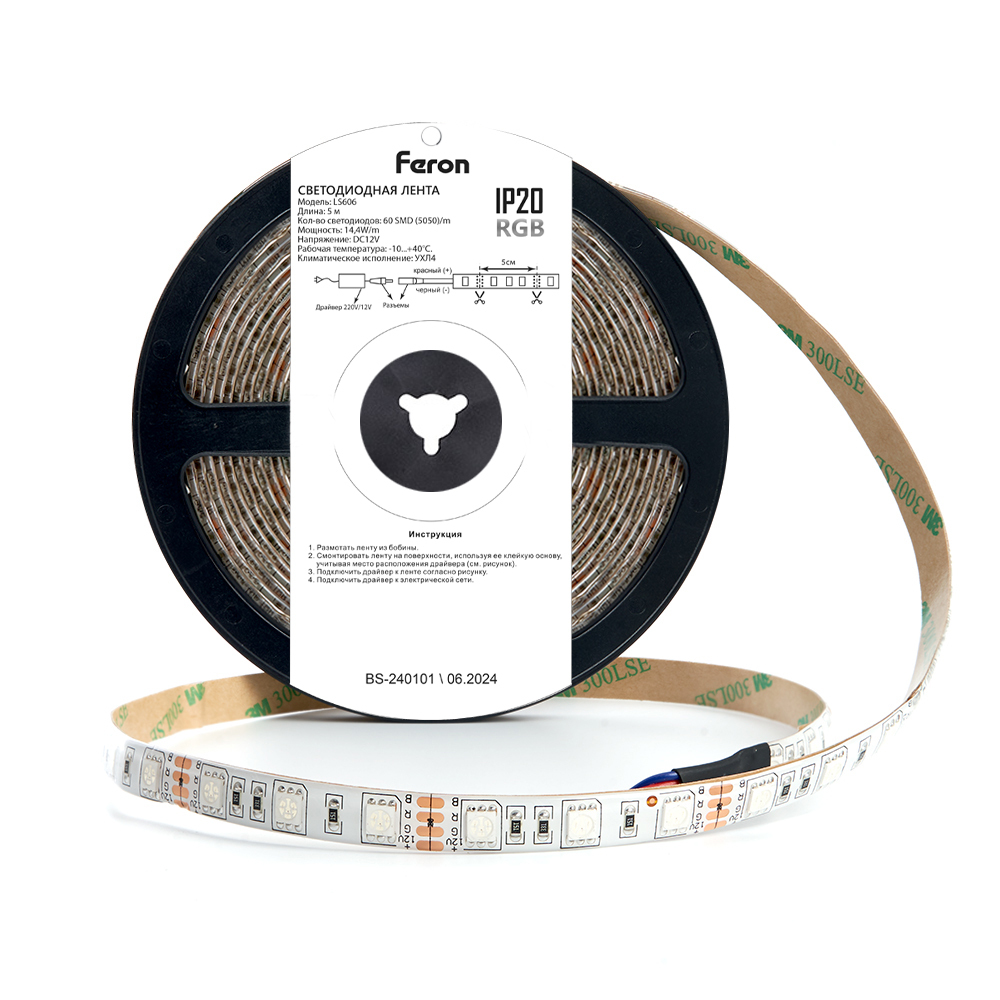 Лента светодиодная 12V в комплекте с драйвером FERON LS606, 60*SMD5050, 14,4W/m, IP20, (RGB), в комплекте коннектор "мама", контроллер, выключатель, драйвер 60W, Кратность резки мм 50мм, 3000*10*2,32мм