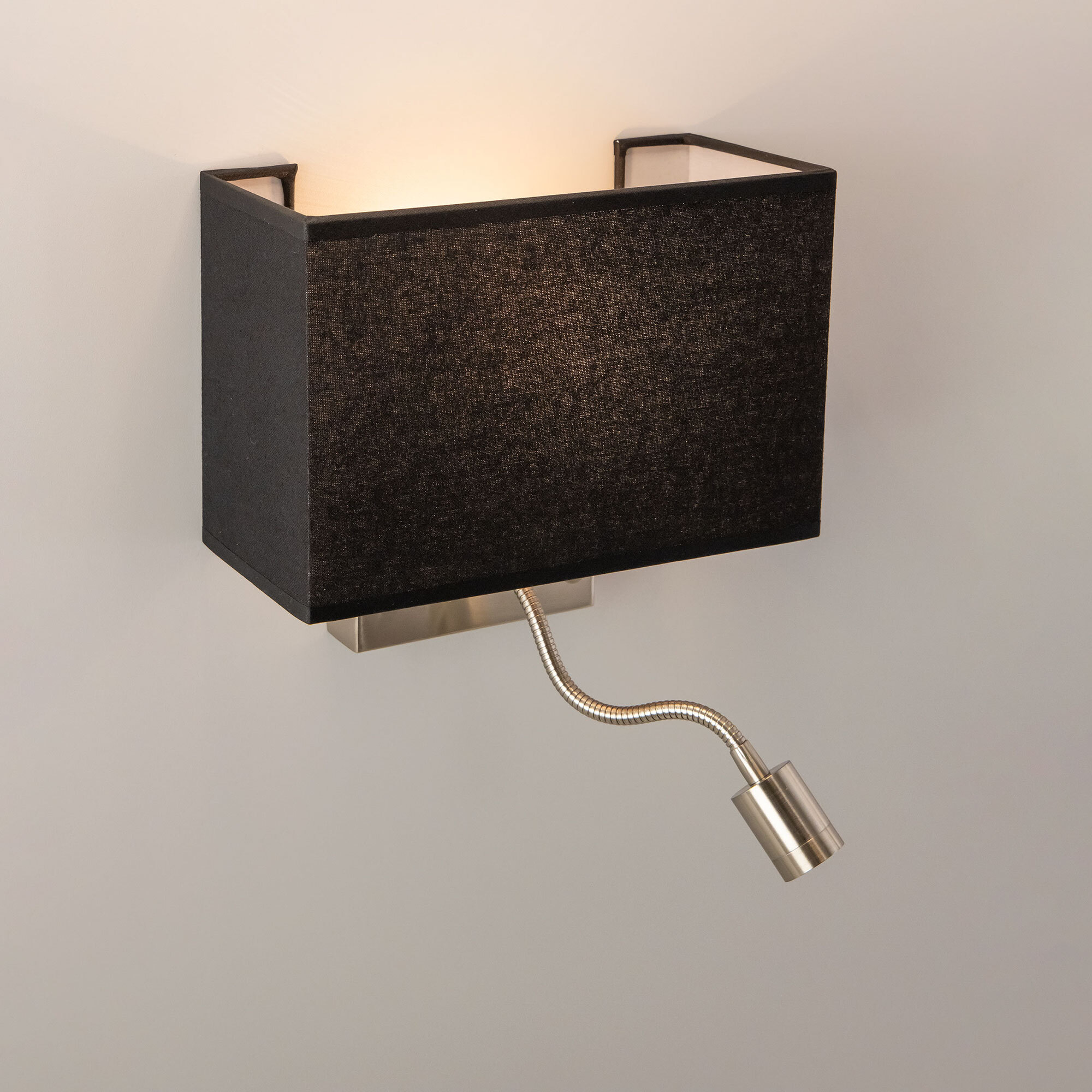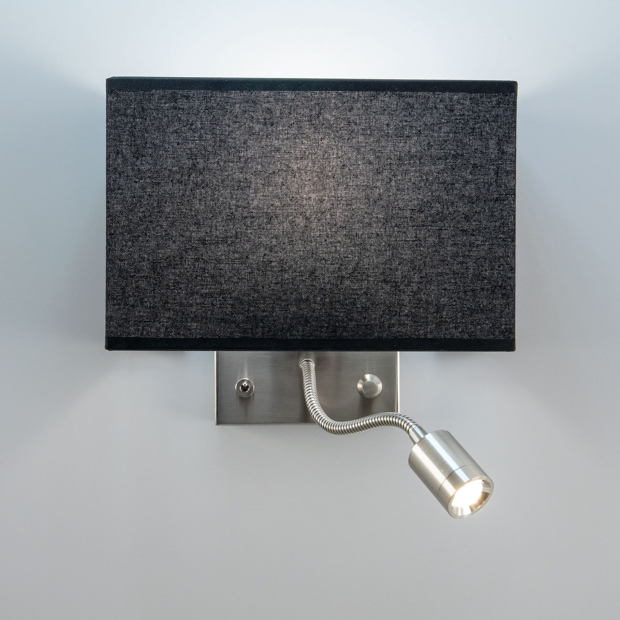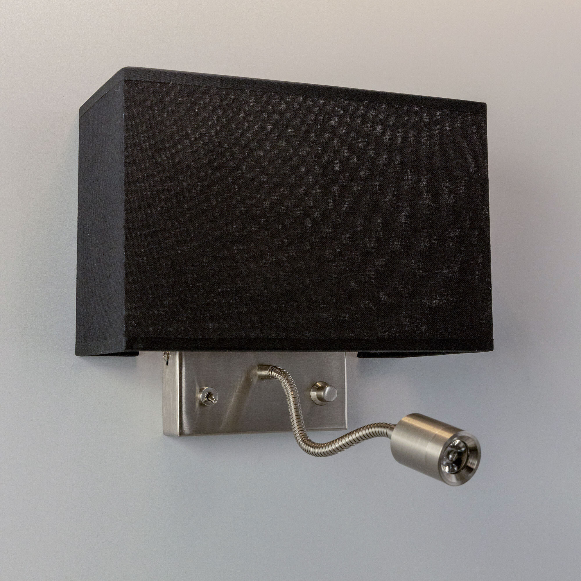 Настенный светильник с чёрным абажуром Citilux Декарт CL704301, с дополнительной подсветкой для чтения, на гибкой ножке. В модели два источника света, каждый включается индивидуально. Управление основным светом осуществляется плавным регулятором яркости (диммер) со встроенным выключателем. В качестве источника света используется лампа с цоколем Е14 и мощностью до 60Вт для ламп накаливания или светодиодные (LED) диммируемые лампы с плавной регулировкой ВАЖНО! Обычные светодиодные лампы или лампы со ступенчатым диммером не подходят. Подсветка поворотная, со встроенным светодиодом для акцентного, направленного освещения мощностью 3Вт с выключателем. Основание светильника металлическое, квадратной формы, цвет матовый хром. Тип крепления – планка. Абажур тканевый прямоугольный, текстура материала «рогожка», цвет чёрный. Великолепный вариант для размещения в изголовье кровати или над диваном.Citilux CL70430 DEKART: Вдохновение в каждом луче.