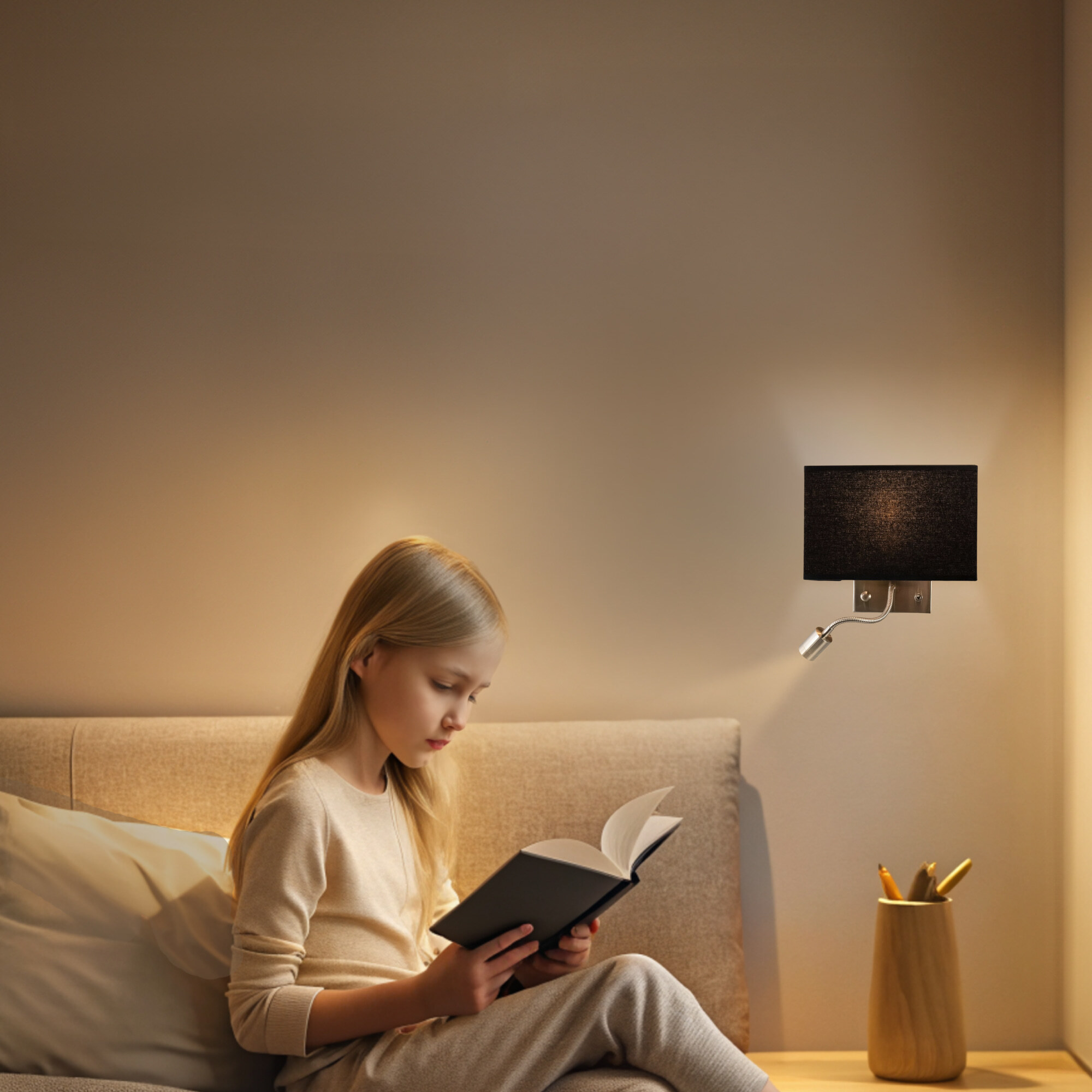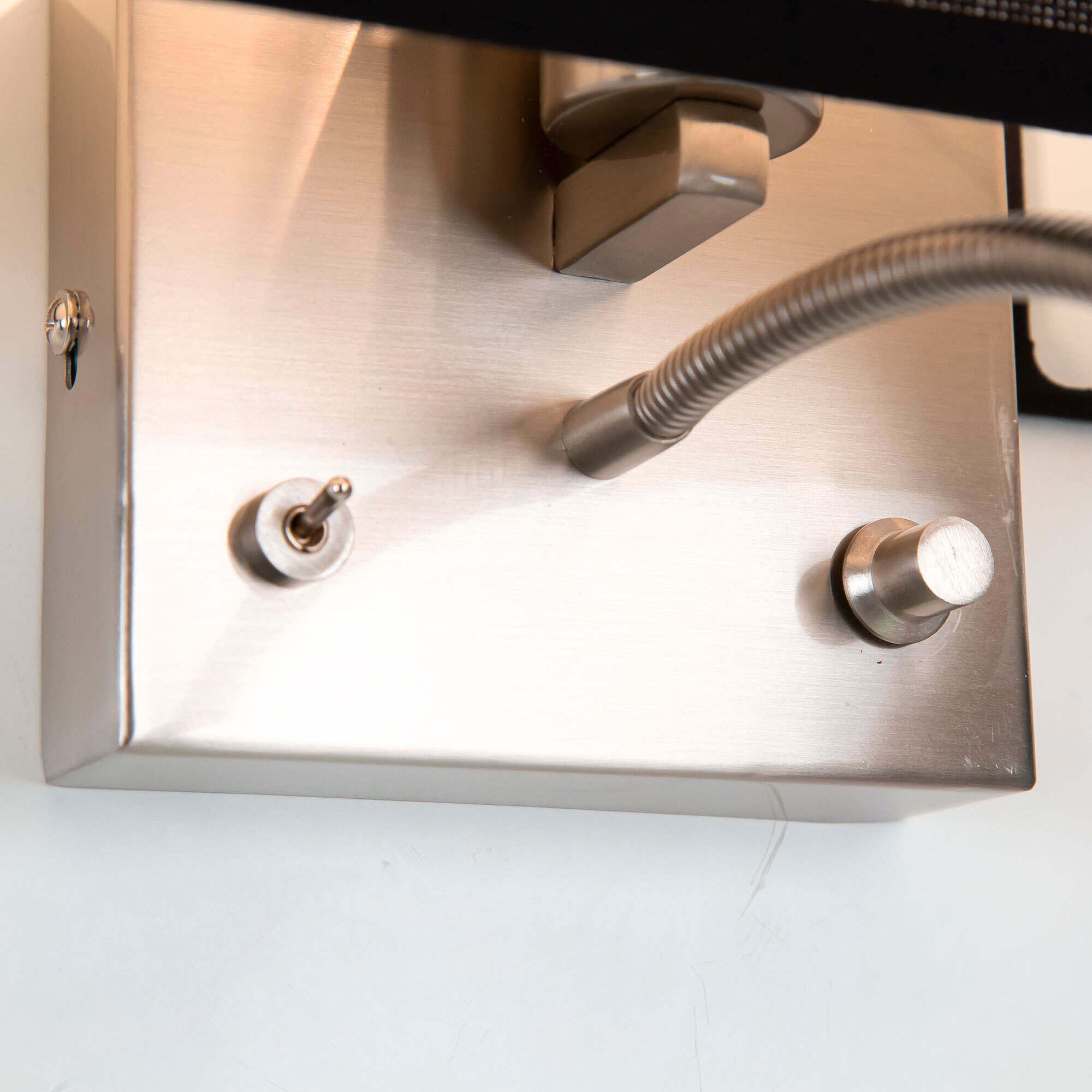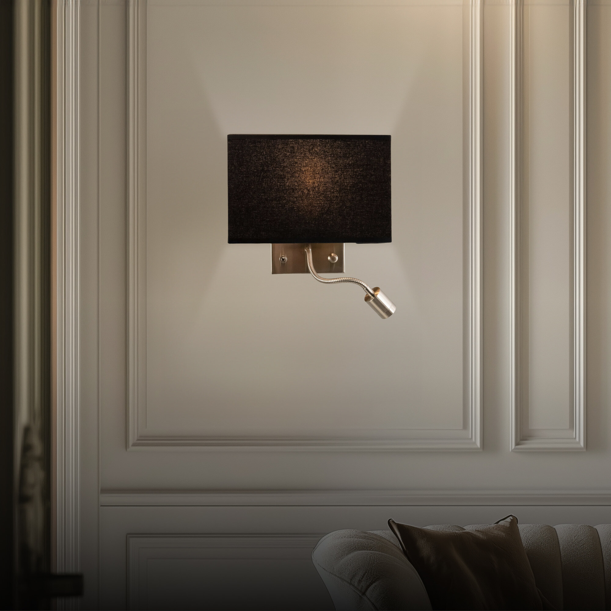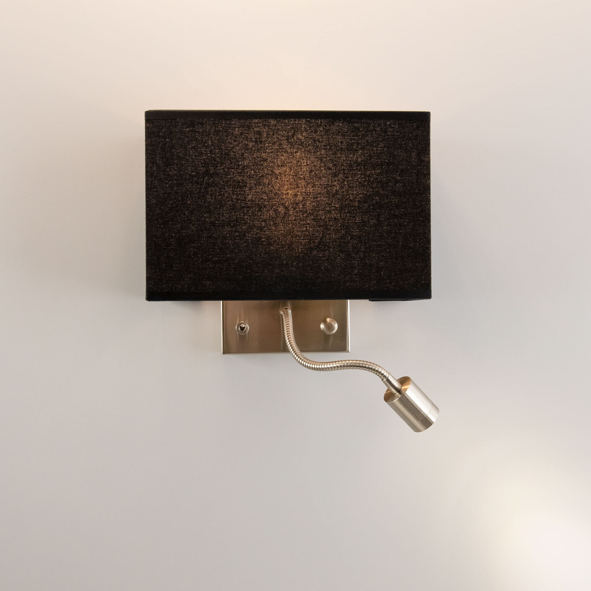 Настенный светильник с чёрным абажуром Citilux Декарт CL704301, с дополнительной подсветкой для чтения, на гибкой ножке. В модели два источника света, каждый включается индивидуально. Управление основным светом осуществляется плавным регулятором яркости (диммер) со встроенным выключателем. В качестве источника света используется лампа с цоколем Е14 и мощностью до 60Вт для ламп накаливания или светодиодные (LED) диммируемые лампы с плавной регулировкой ВАЖНО! Обычные светодиодные лампы или лампы со ступенчатым диммером не подходят. Подсветка поворотная, со встроенным светодиодом для акцентного, направленного освещения мощностью 3Вт с выключателем. Основание светильника металлическое, квадратной формы, цвет матовый хром. Тип крепления – планка. Абажур тканевый прямоугольный, текстура материала «рогожка», цвет чёрный. Великолепный вариант для размещения в изголовье кровати или над диваном.Citilux CL70430 DEKART: Вдохновение в каждом луче.