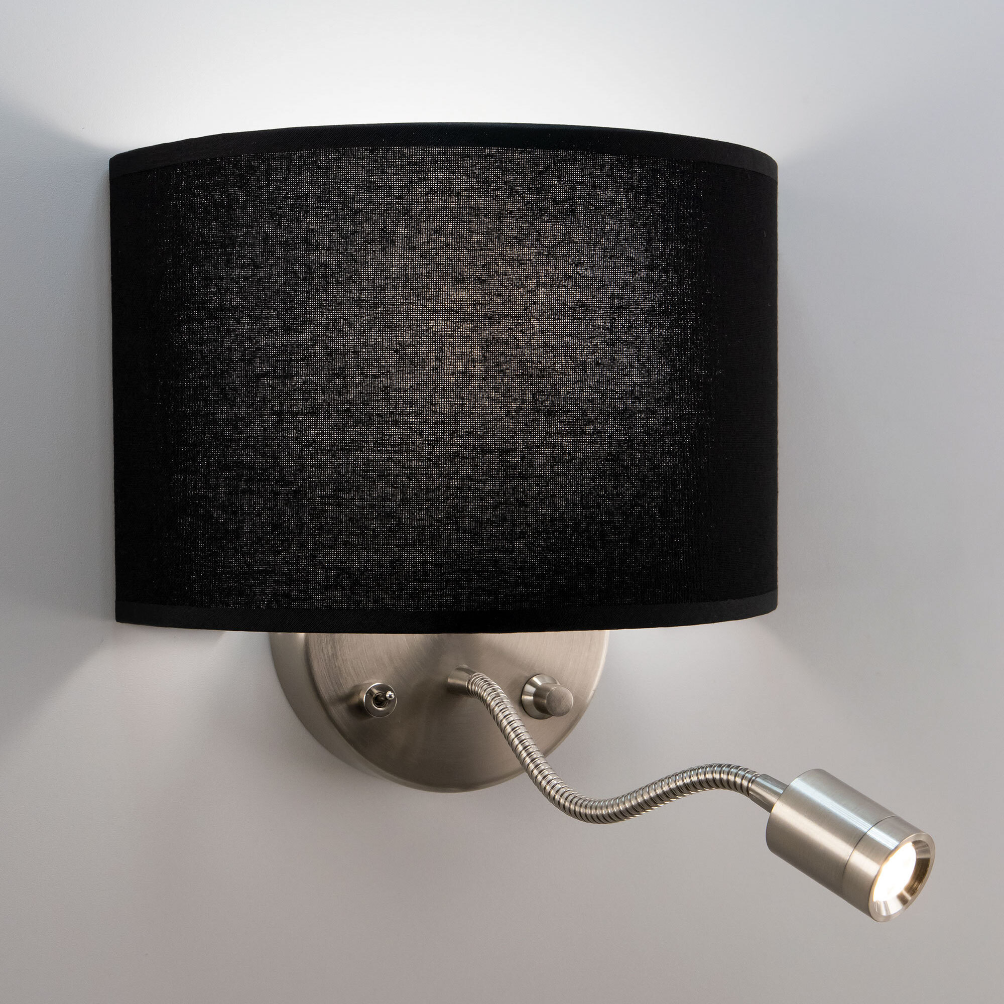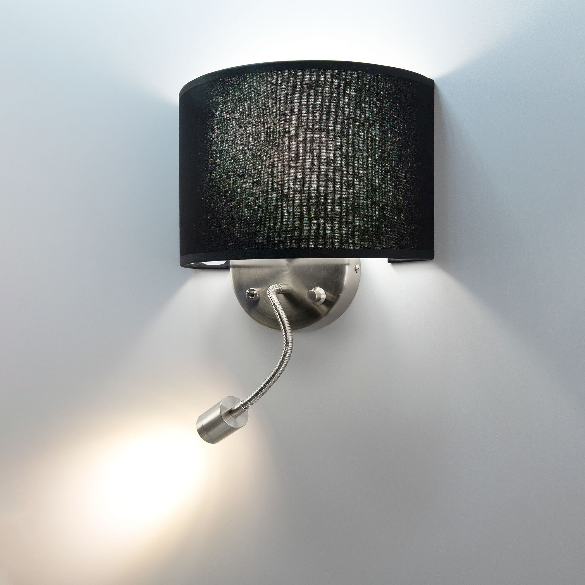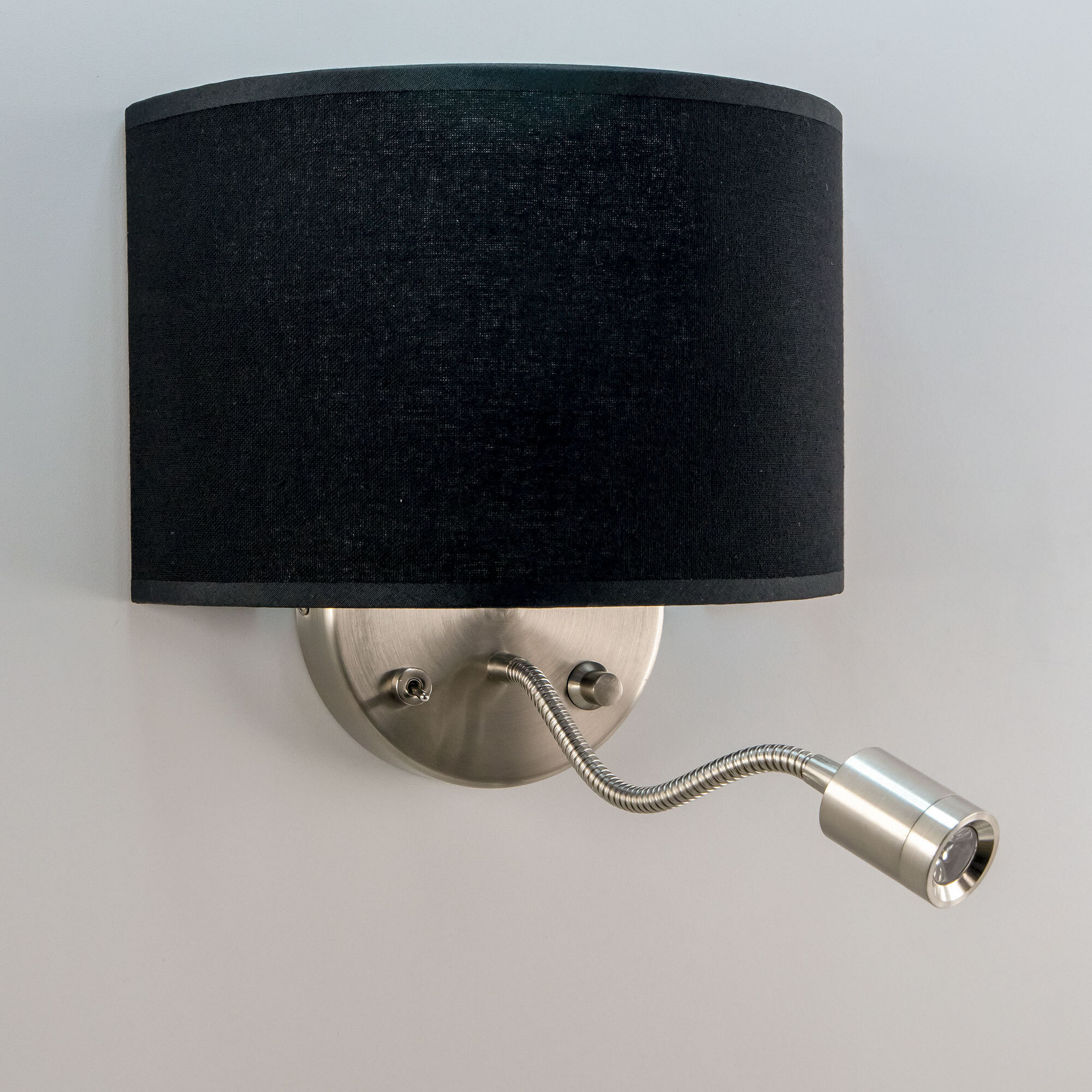Настенный светильник с абажуром Citilux Декарт CL704305, с дополнительной подсветкой для чтения на гибкой ножке. В модели два источника света, каждый включается индивидуально. Управление основным светом осуществляется плавным регулятором яркости (диммер) со встроенным выключателем. В качестве источника света используется лампа с цоколем Е14 и мощностью до 60Вт для ламп накаливания или светодиодные (LED) диммируемые лампы с плавной регулировкой (ВАЖНО! Обычные светодиодные лампы или лампы со ступенчатым диммером не подходят). Подсветка поворотная со встроенным светодиодом для акцентного, направленного освещения мощностью 3Вт с выключателем. Основание светильника металлическое, круглой формы, цвет матовый хром. Тип крепления – планка. Абажур тканевый полукруглый, текстура материала «рогожка», цвет черный.Citilux CL70430 DEKART: Вдохновение в каждом луче.