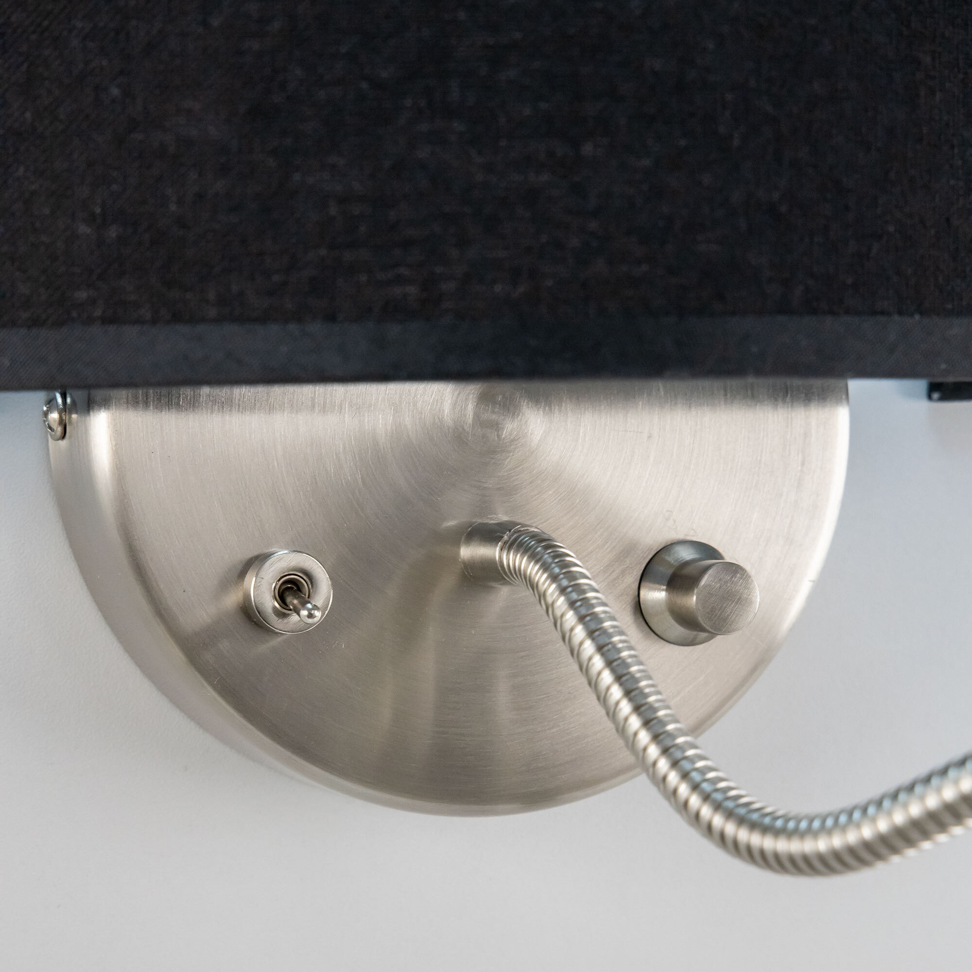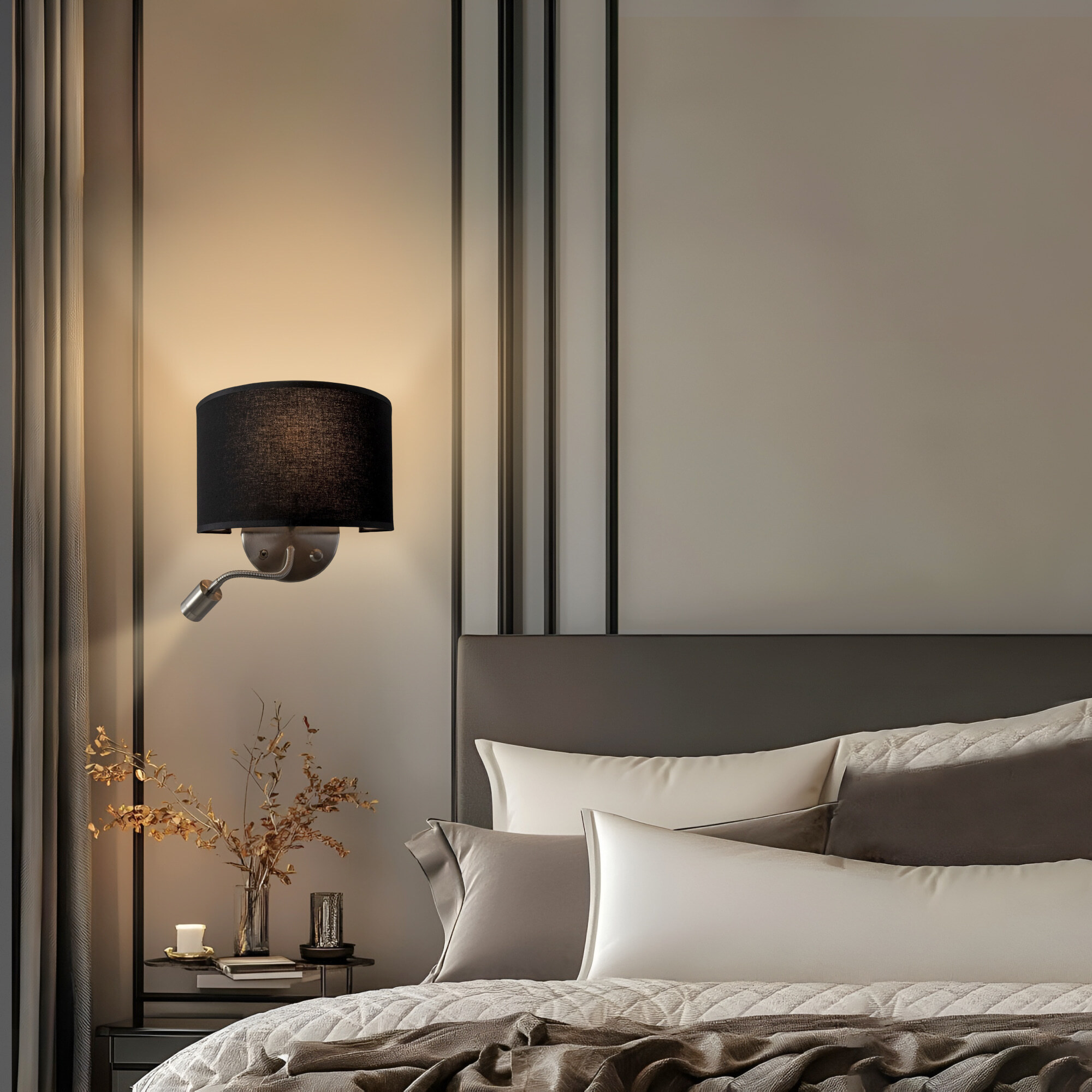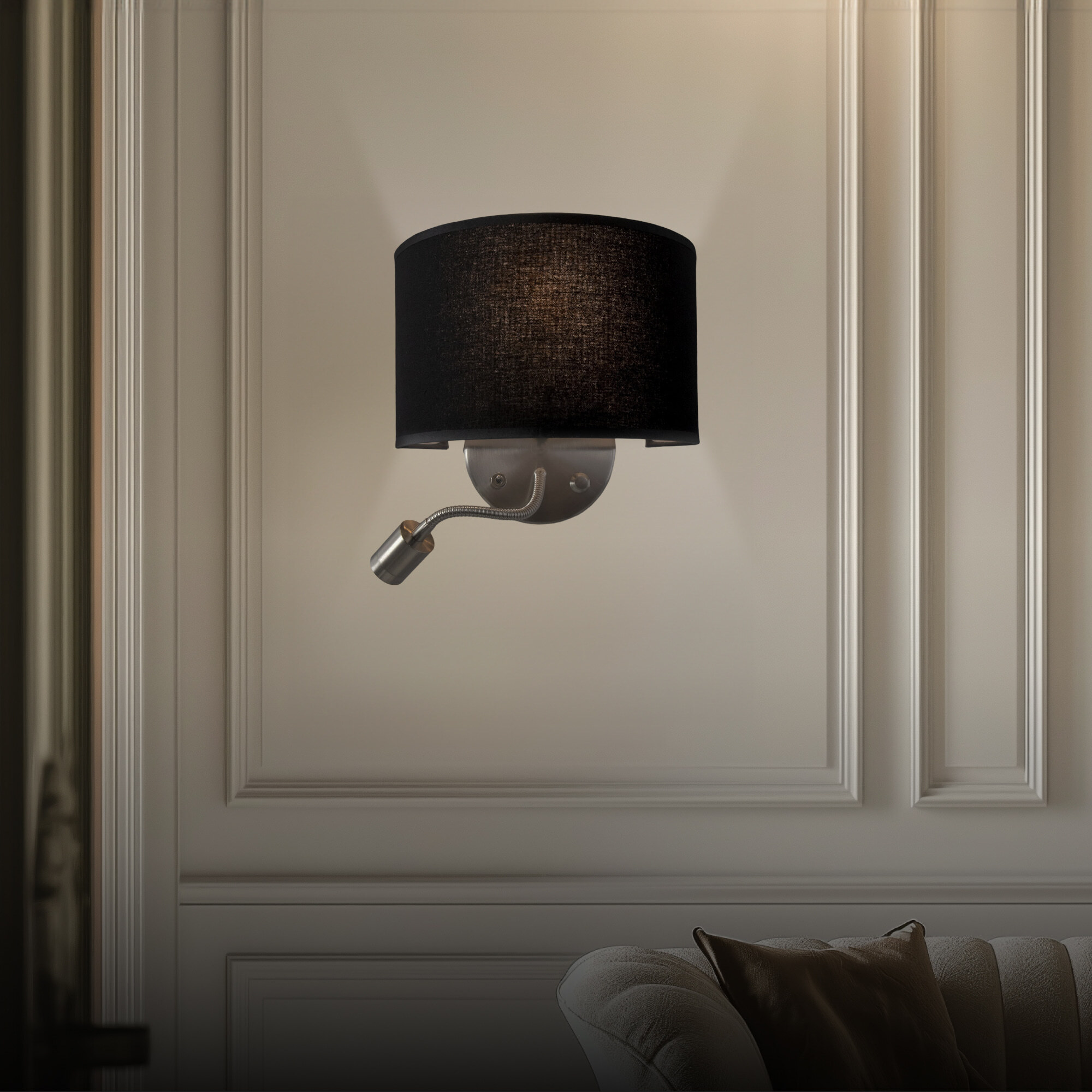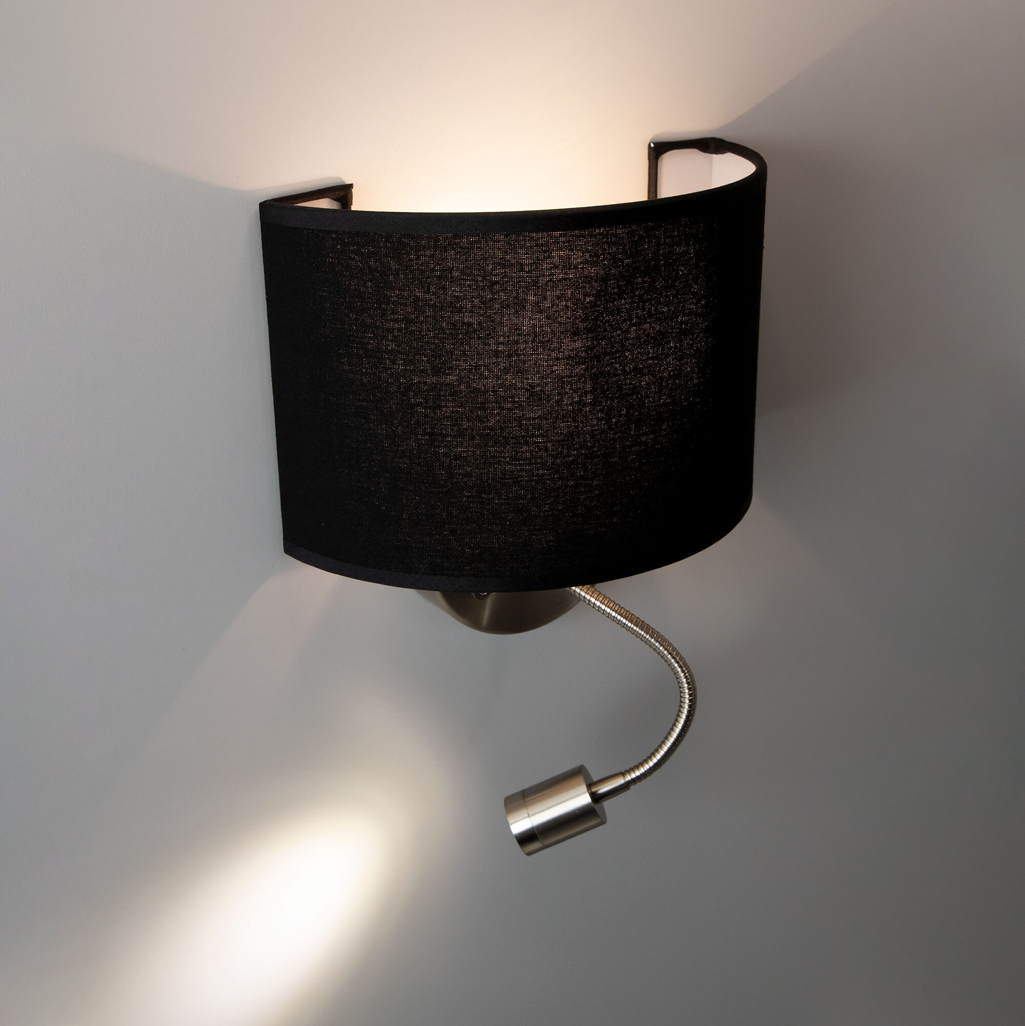 Настенный светильник с абажуром Citilux Декарт CL704305, с дополнительной подсветкой для чтения на гибкой ножке. В модели два источника света, каждый включается индивидуально. Управление основным светом осуществляется плавным регулятором яркости (диммер) со встроенным выключателем. В качестве источника света используется лампа с цоколем Е14 и мощностью до 60Вт для ламп накаливания или светодиодные (LED) диммируемые лампы с плавной регулировкой (ВАЖНО! Обычные светодиодные лампы или лампы со ступенчатым диммером не подходят). Подсветка поворотная со встроенным светодиодом для акцентного, направленного освещения мощностью 3Вт с выключателем. Основание светильника металлическое, круглой формы, цвет матовый хром. Тип крепления – планка. Абажур тканевый полукруглый, текстура материала «рогожка», цвет черный.Citilux CL70430 DEKART: Вдохновение в каждом луче.
