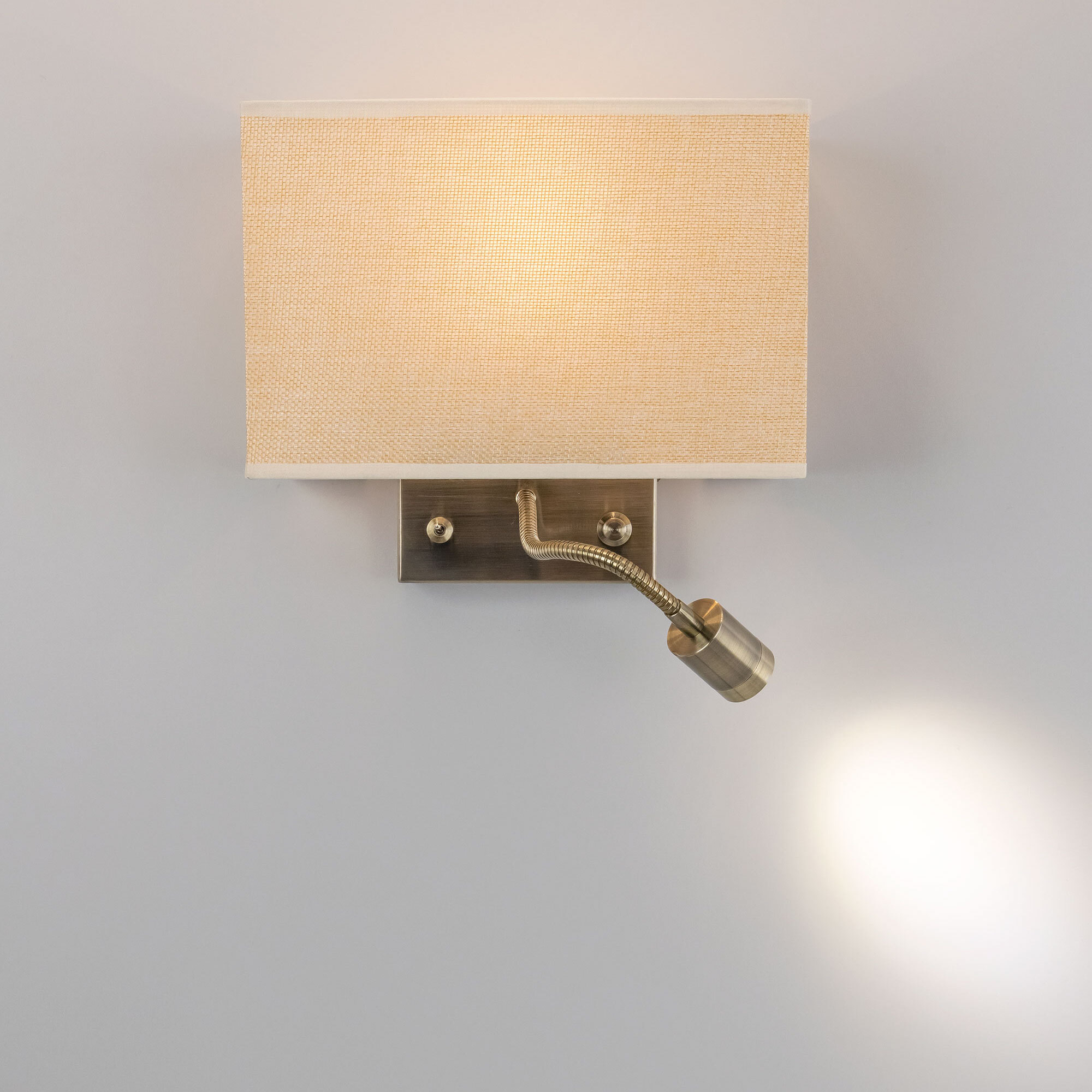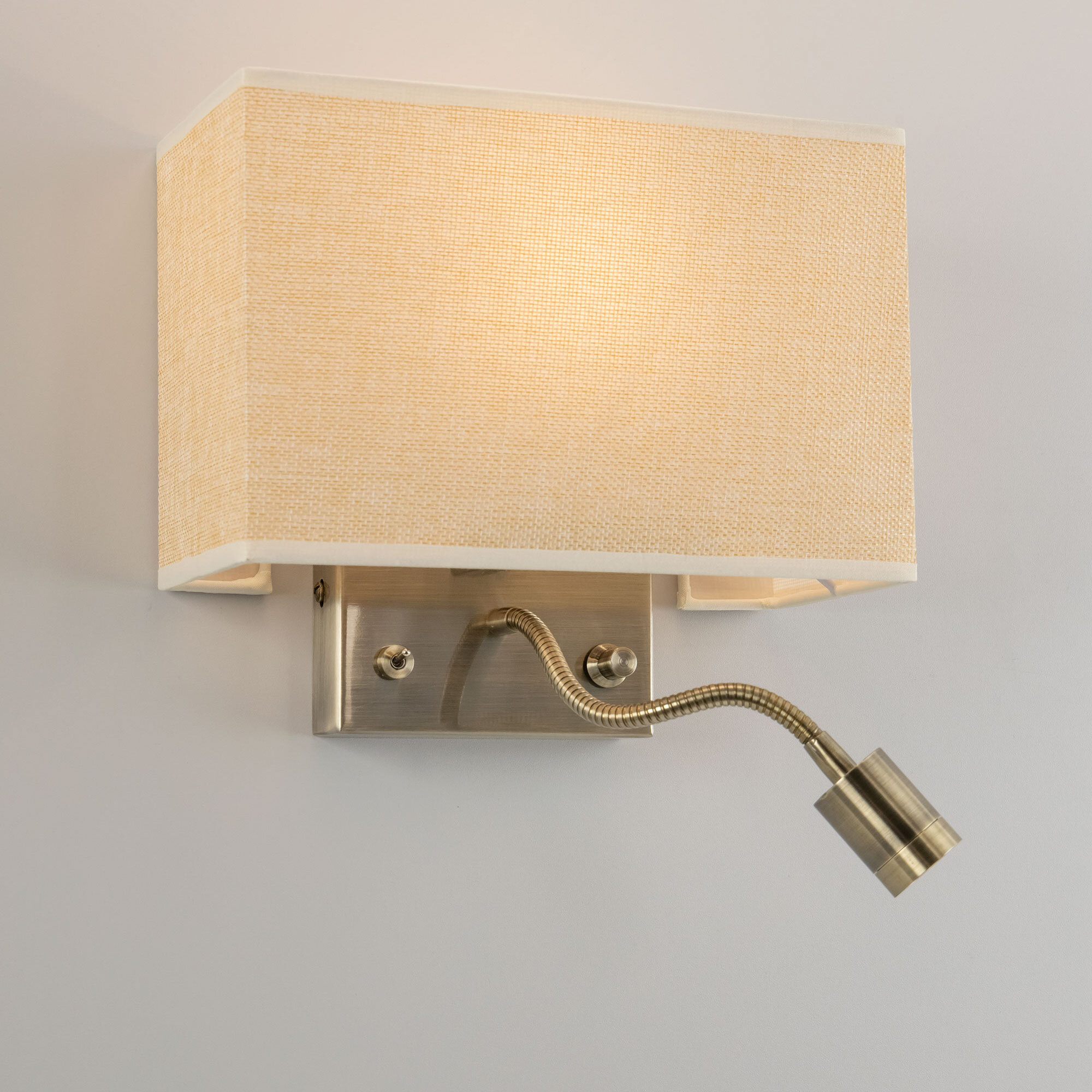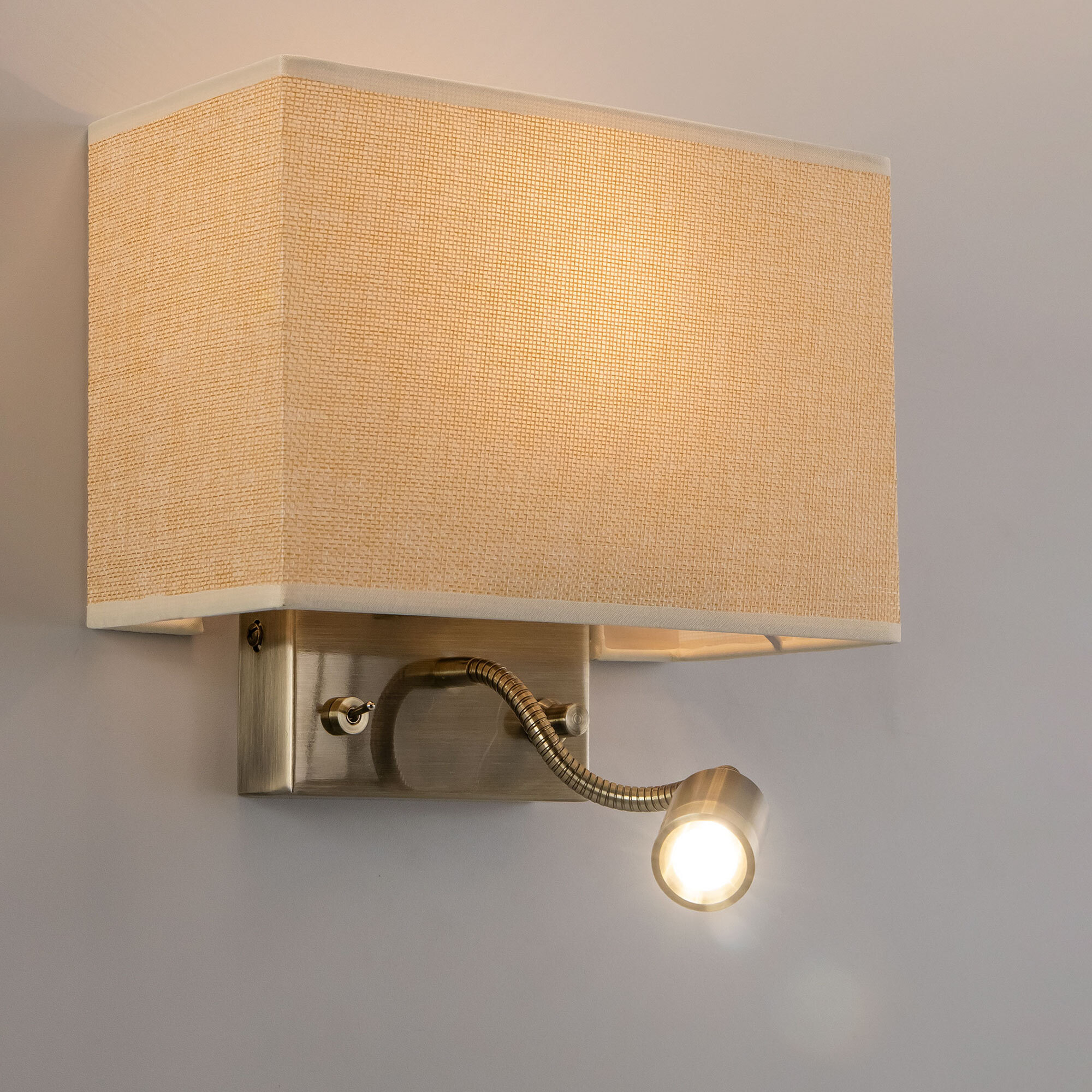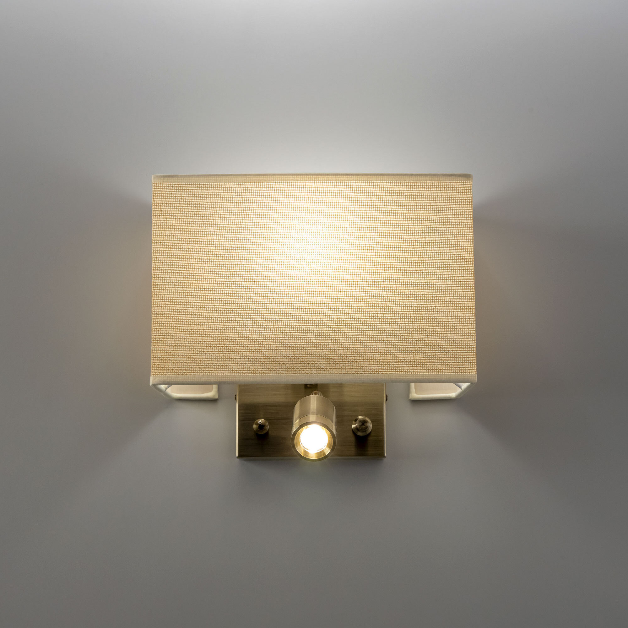 Настенный светильник с бежевым абажуром Citilux Декарт CL704303, с дополнительной подсветкой для чтения, на гибкой ножке. В модели два источника света, каждый включается индивидуально. Управление основным светом осуществляется плавным регулятором яркости (диммер) со встроенным выключателем. В качестве источника света используется лампа с цоколем Е14 и мощностью до 60Вт для ламп накаливания или светодиодные (LED) диммируемые лампы с плавной регулировкой ВАЖНО! Обычные светодиодные лампы или лампы со ступенчатым диммером не подходят. Подсветка поворотная, со встроенным светодиодом для акцентного, направленного освещения мощностью 3Вт с выключателем. Основание светильника металлическое, квадратной формы, цвет бронза. Тип крепления – планка. Абажур тканевый прямоугольный, текстура материала «рогожка», цвет бежевый (песочный). Великолепный вариант для размещения в изголовье кровати или над диваном.