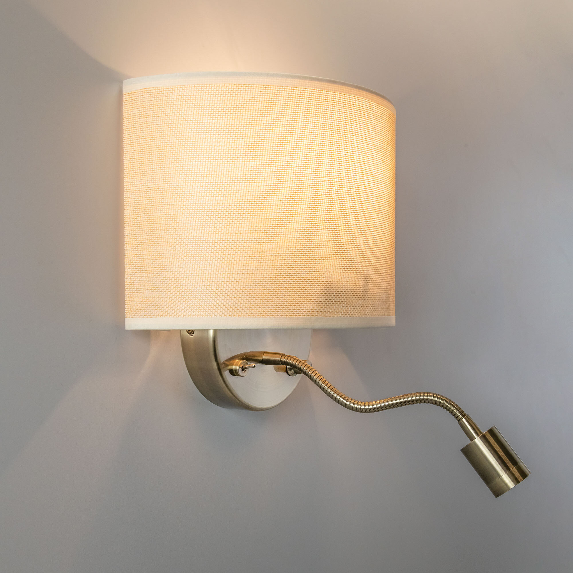 Настенный светильник с абажуром Citilux Декарт CL704306, с дополнительной подсветкой для чтения на гибкой ножке. В модели два источника света, каждый включается индивидуально. Управление основным светом осуществляется плавным регулятором яркости (диммер) со встроенным выключателем. В качестве источника света используется лампа с цоколем Е14 и мощностью до 60Вт для ламп накаливания или светодиодные (LED) диммируемые лампы с плавной регулировкой (ВАЖНО! Обычные светодиодные лампы или лампы со ступенчатым диммером не подходят.) Подсветка поворотная со встроенным светодиодом для акцентного, направленного освещения мощностью 3Вт с выключателем. Основание светильника металлическое, круглой формы, цвет бронза. Тип крепления – планка. Абажур тканевый полукруглый, текстура материала «рогожка», цвет песочный.