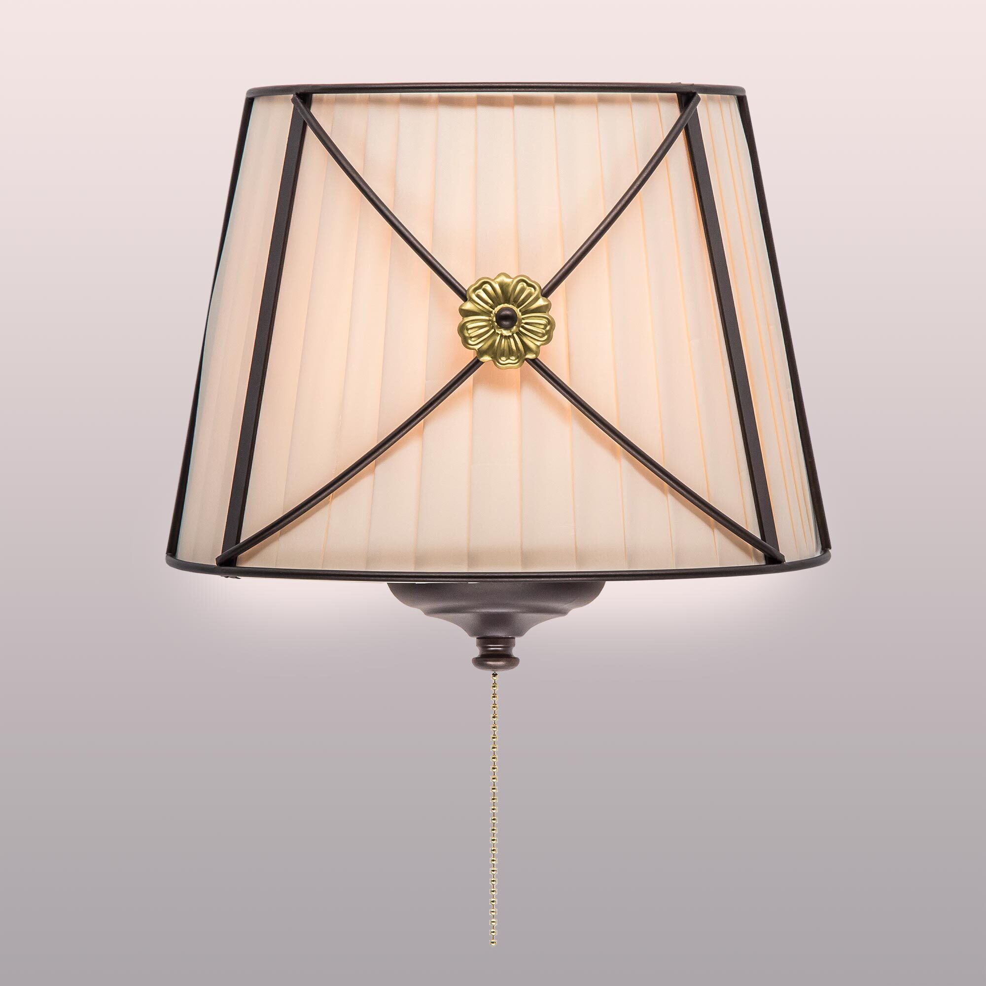 Каркас изделия — металлический, модного кофейного оттенка. Абажур традиционной формы изготовлен из плиссированной ткани стильного бежевого цвета, украшен винтажным металлическим декором.