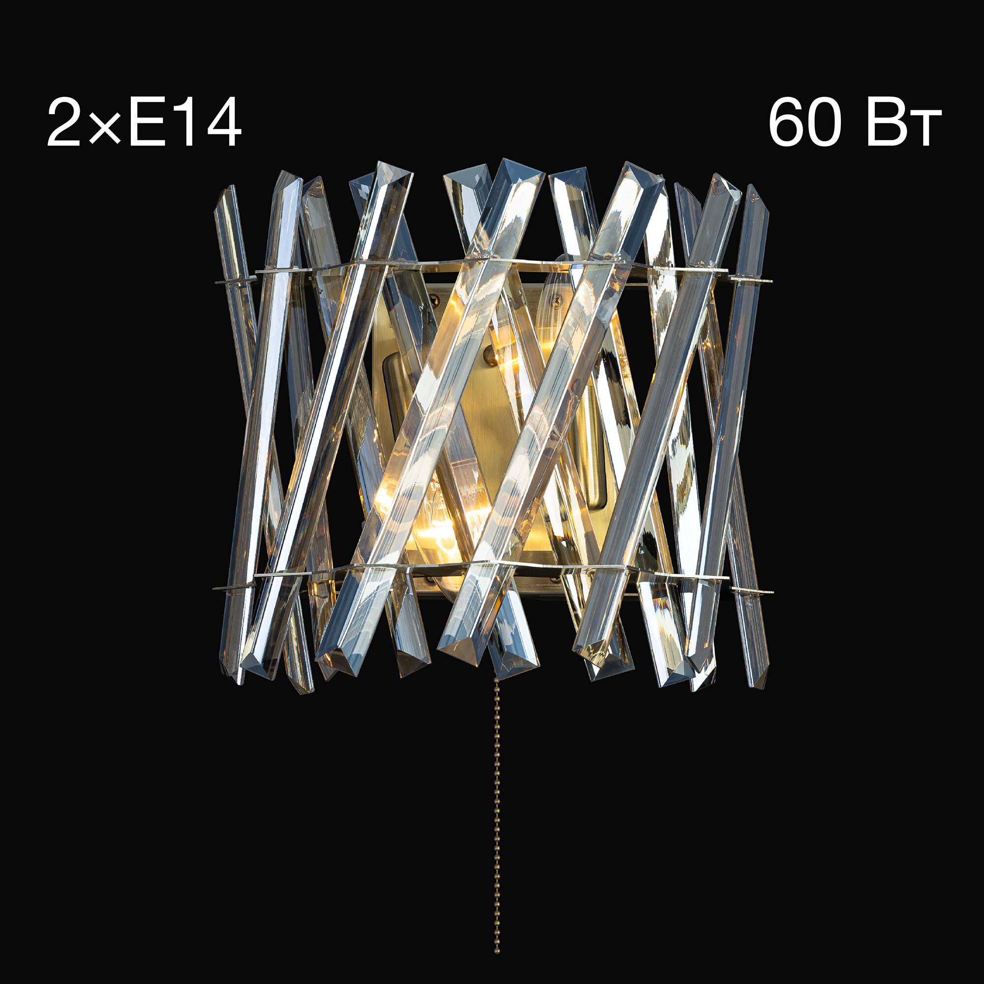 В изделии 2 лампы с цоколем Е14 максимальной мощностью для ламп накаливания 60Вт (в комплект не входят, приобретаются отдельно), на корпусе расположен удобный выключатель. Высота модели 25см, ширина 27см, глубина 15см.