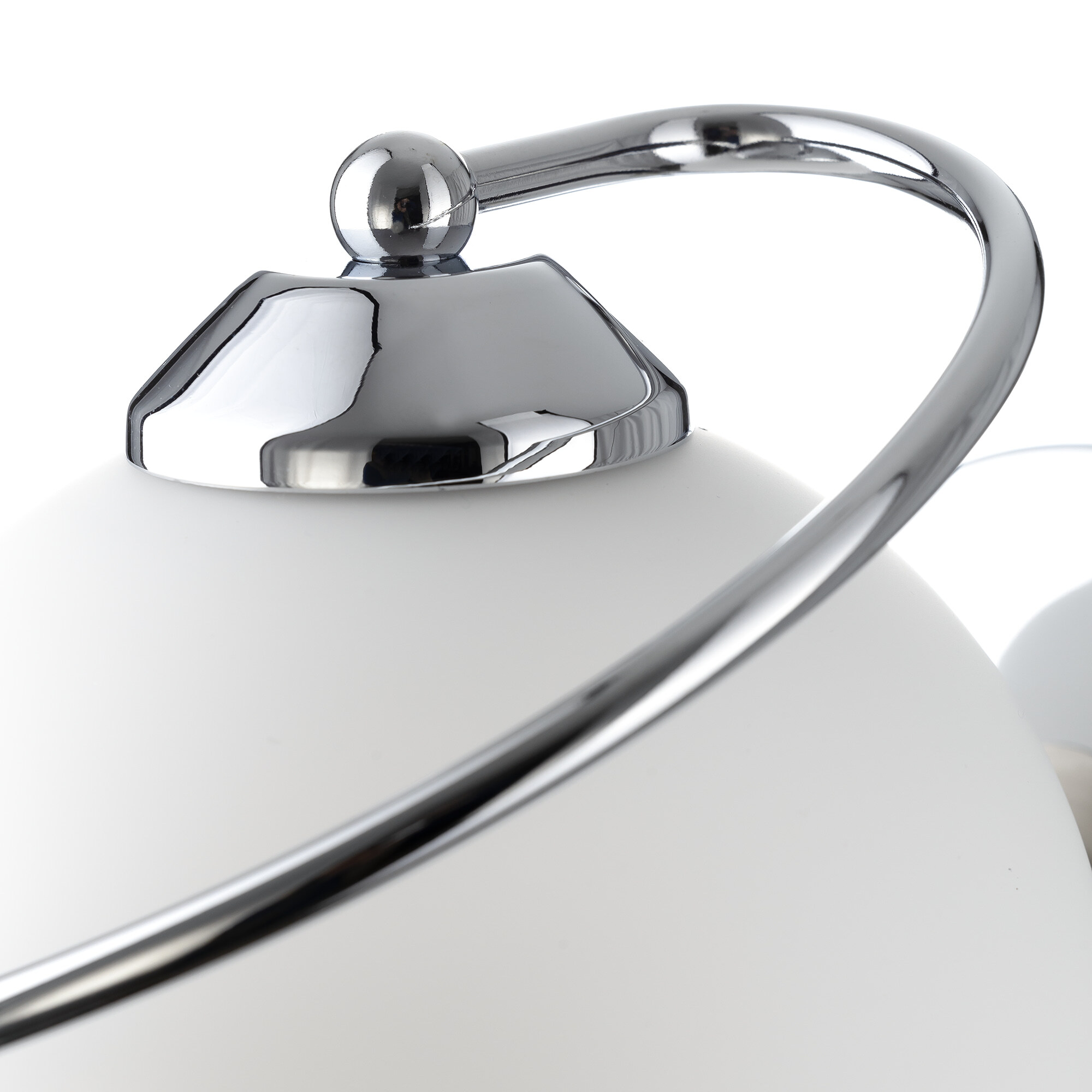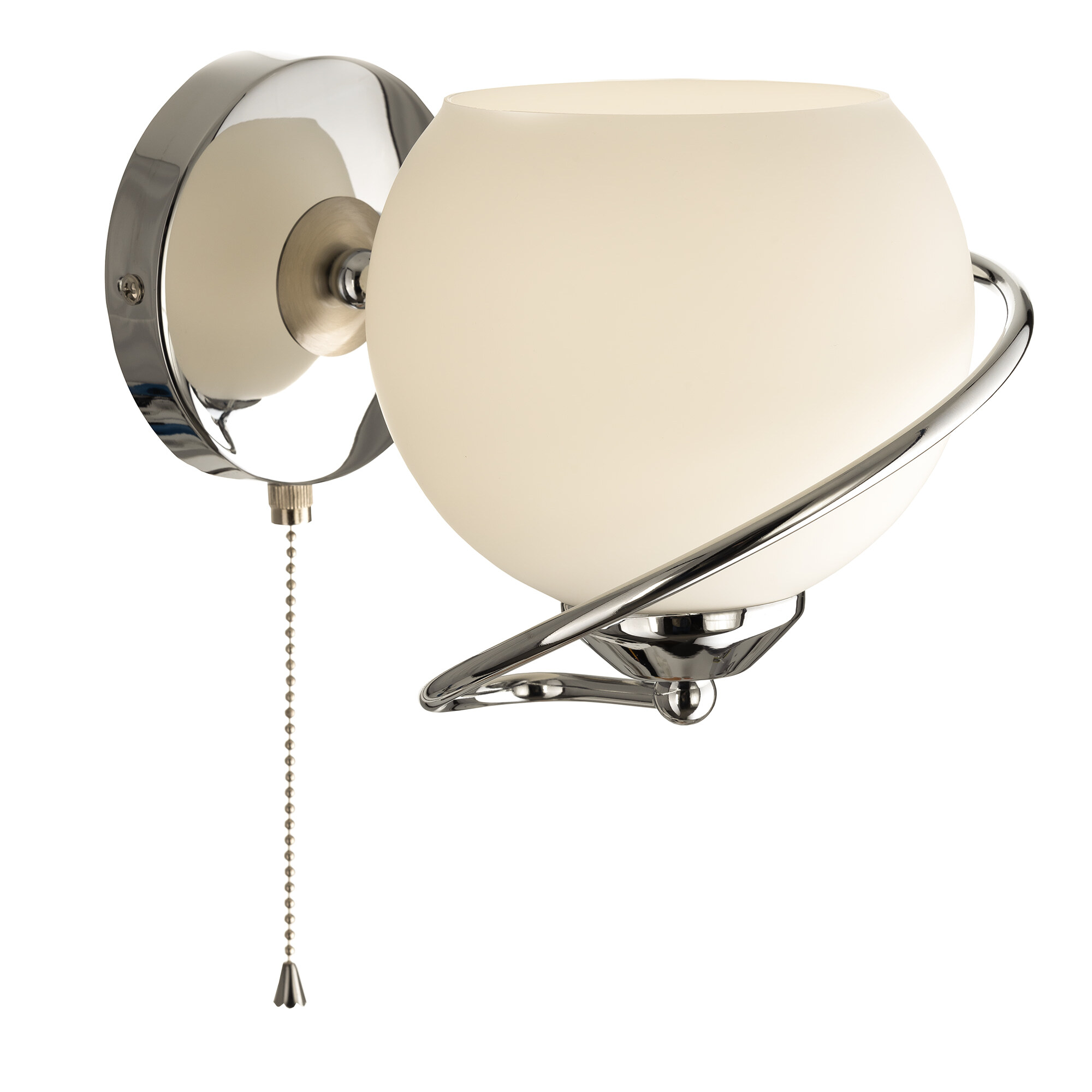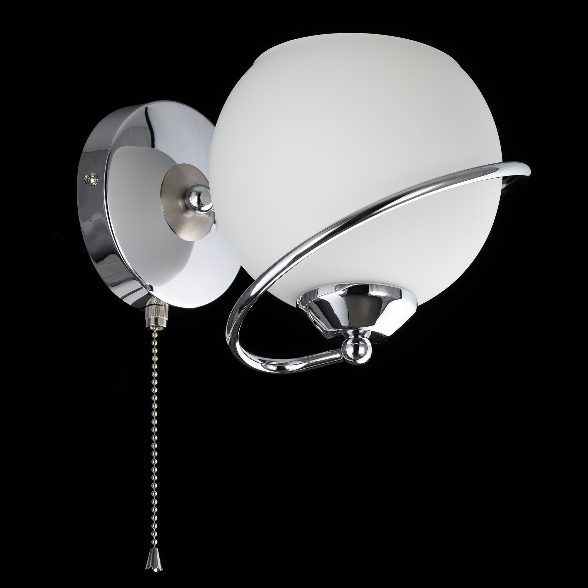 Бра с выключателем Citilux Layma CL155311 в современном стиле. Корпус светильника металлический, оттенка хром, витая, причудливо изгибающаяся арматура. Плафон — из белоснежного выдувного стекла, в форме усеченной сферы.