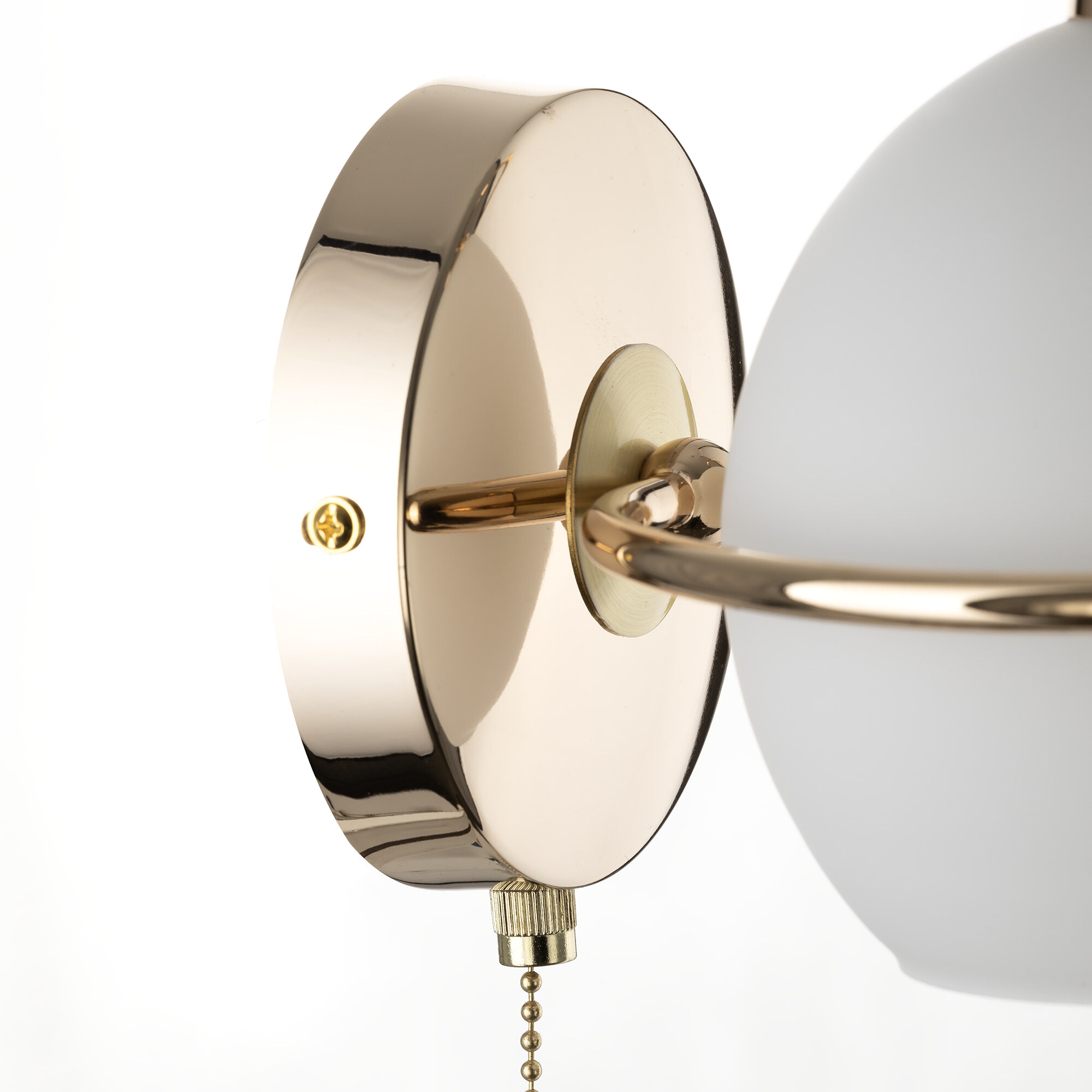 Бра с выключателем Citilux Layma CL155312 в современном стиле. Корпус светильника металлический, золотистого оттенка, витая, причудливо изгибающаяся арматура. Плафон — из белоснежного выдувного стекла, в форме усеченной сферы.