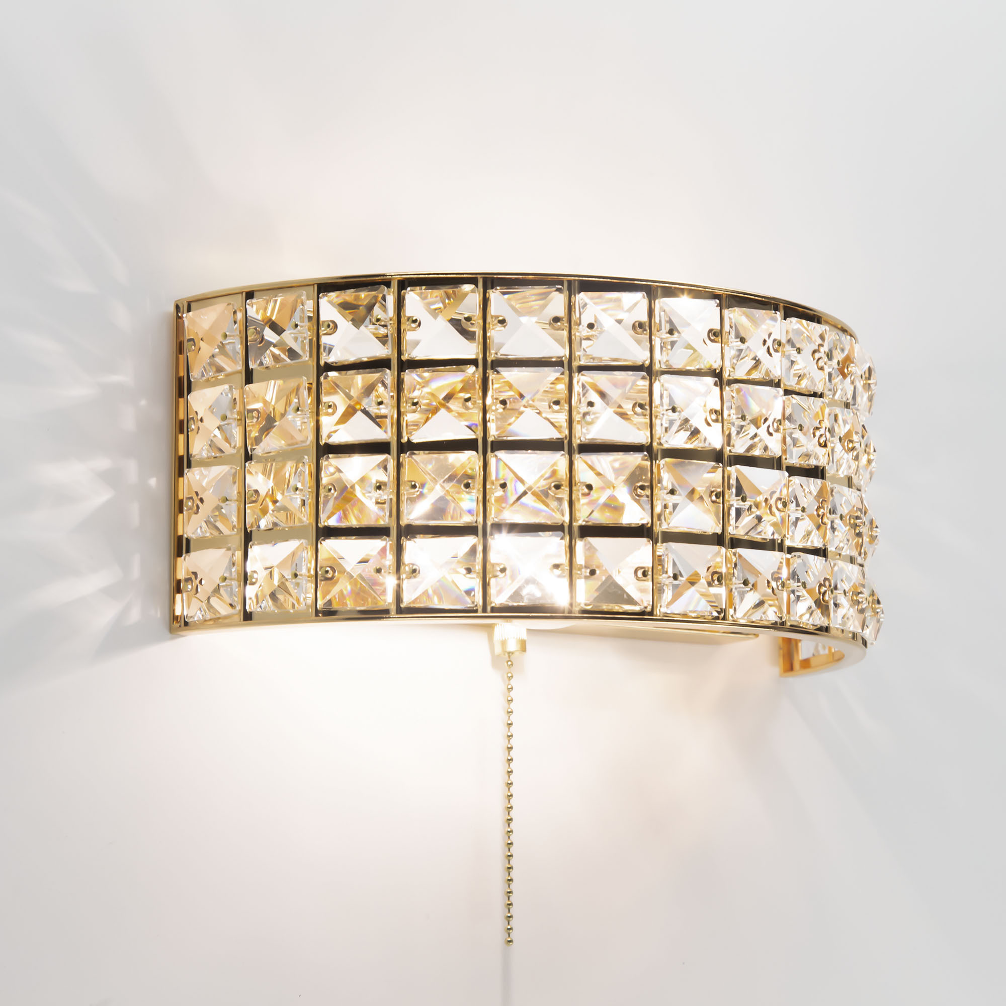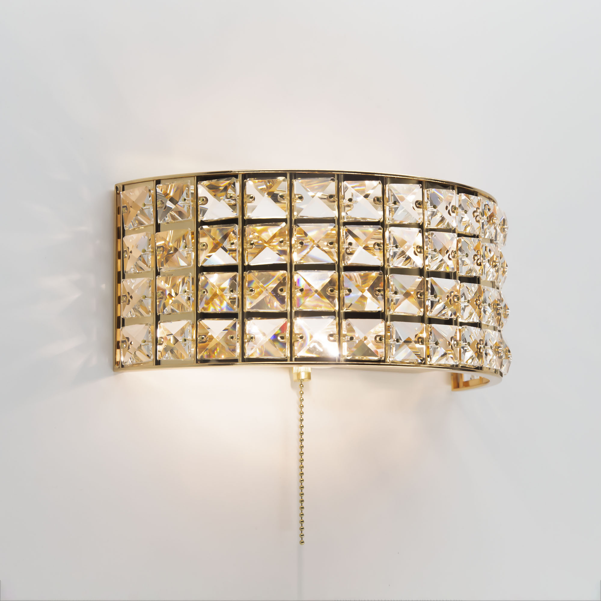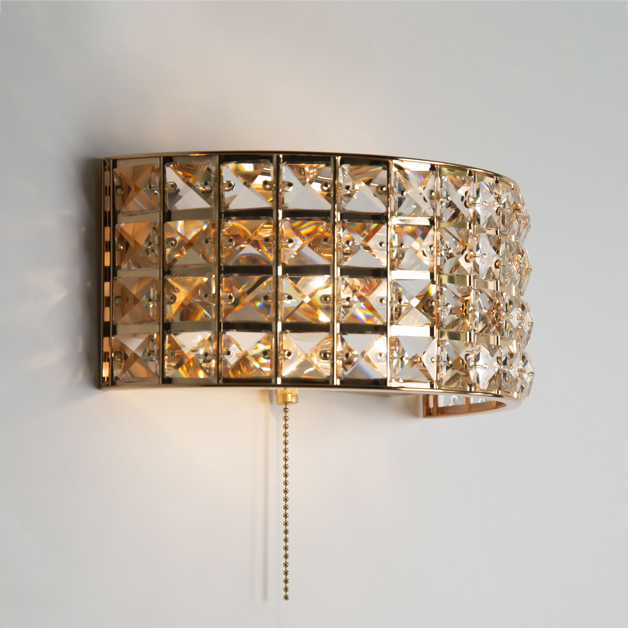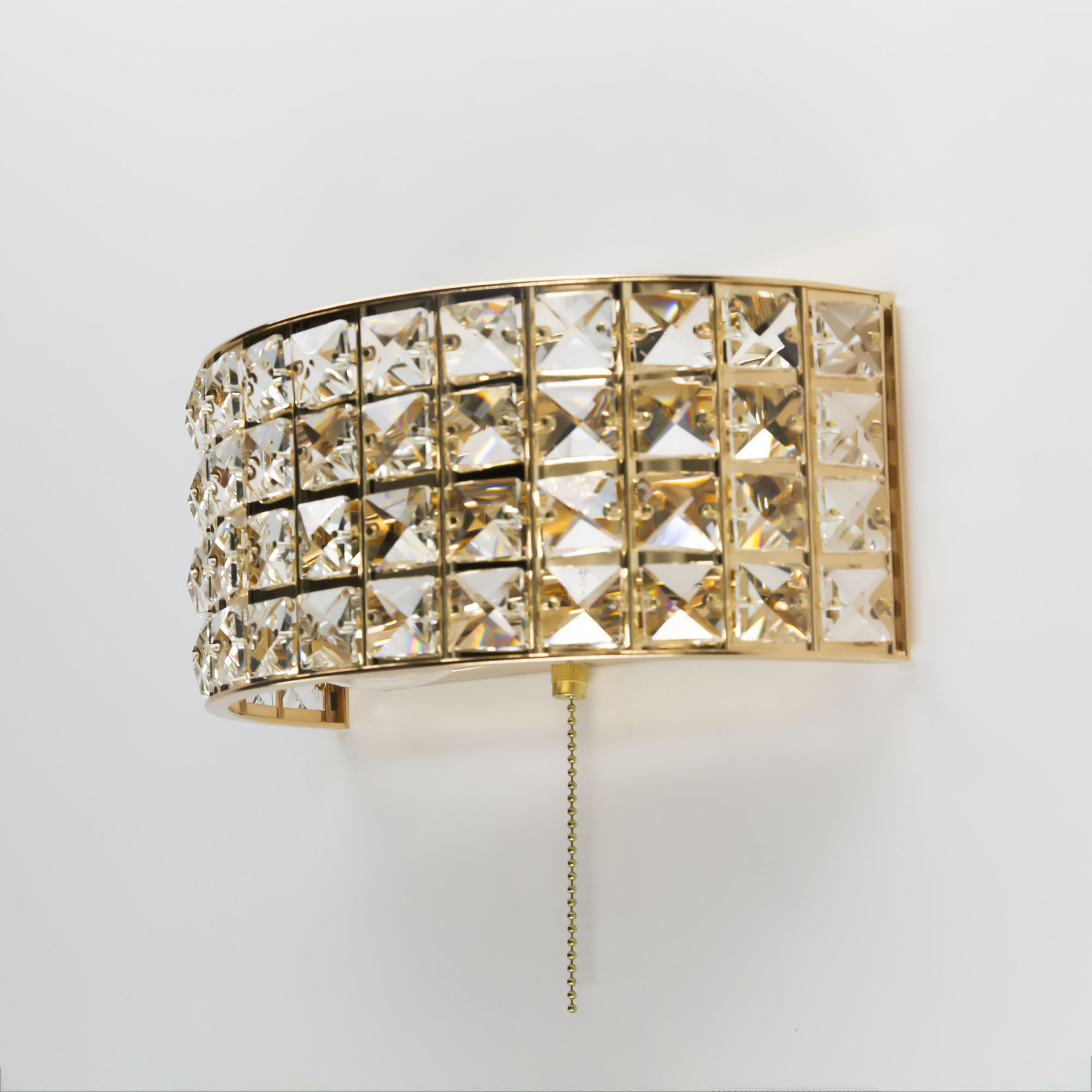 Шикарные бра из коллекции Портал станут изящным дополнением в интерьере ваших спален, гостиных, прихожих комнат или рабочих кабинетов. Стильное основание, сияющее ослепительным золотом, украшено хрустальными камнями знаменитой марки Asfour, которые способны преломлять световой поток, придавая ему неповторимые, волшебные оттенки. Светильник оснащён двумя термостойкими патронами, позволяющими использовать лампы накаливания до 60 Ватт. Если же, вы предпочитаете современные светодиодные лампы, то ограничения по мощности отсутствуют вовсе. При этом для того, чтобы хрусталь в полной мере раскрыл свои качества, желательно использовать исключительно прозрачные лампочки. Для удобства в эксплуатации в модель встроен собственный выключатель в виде золотой цепочки, в цвет самого изделия.