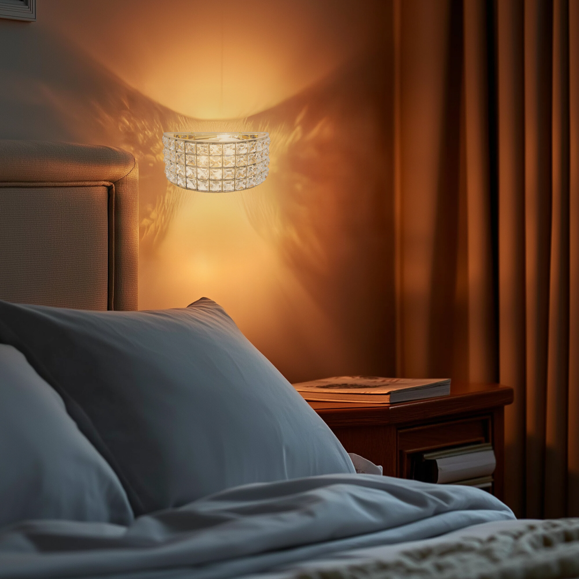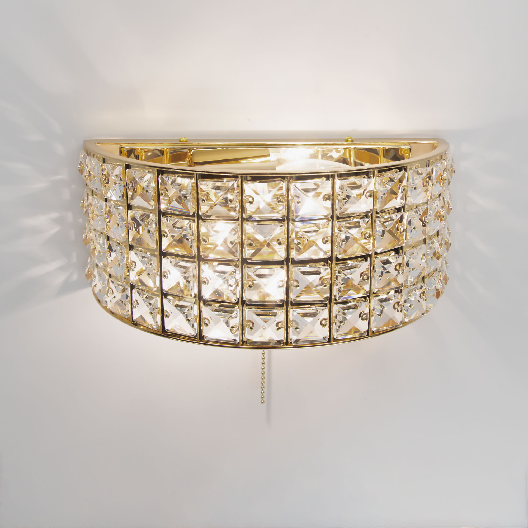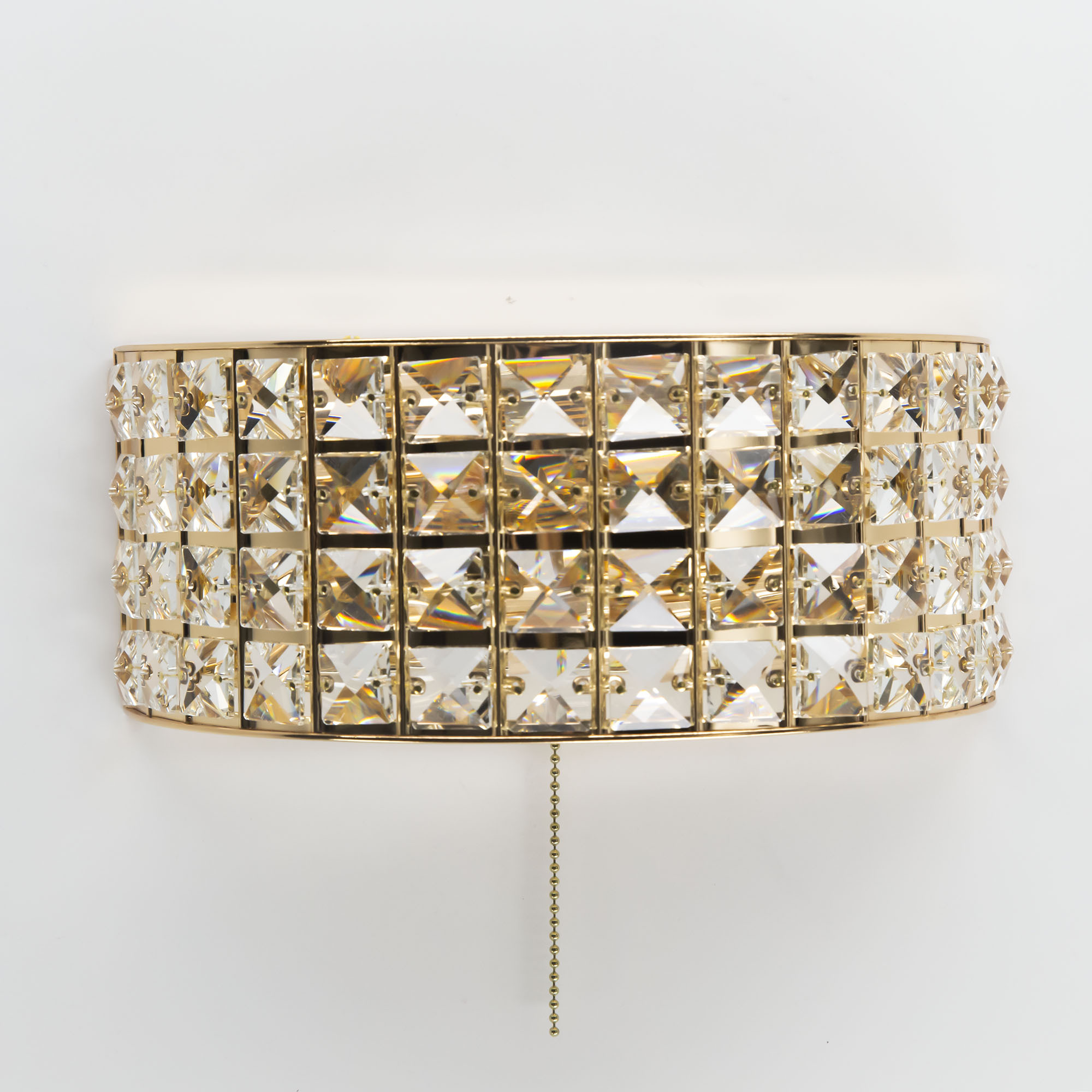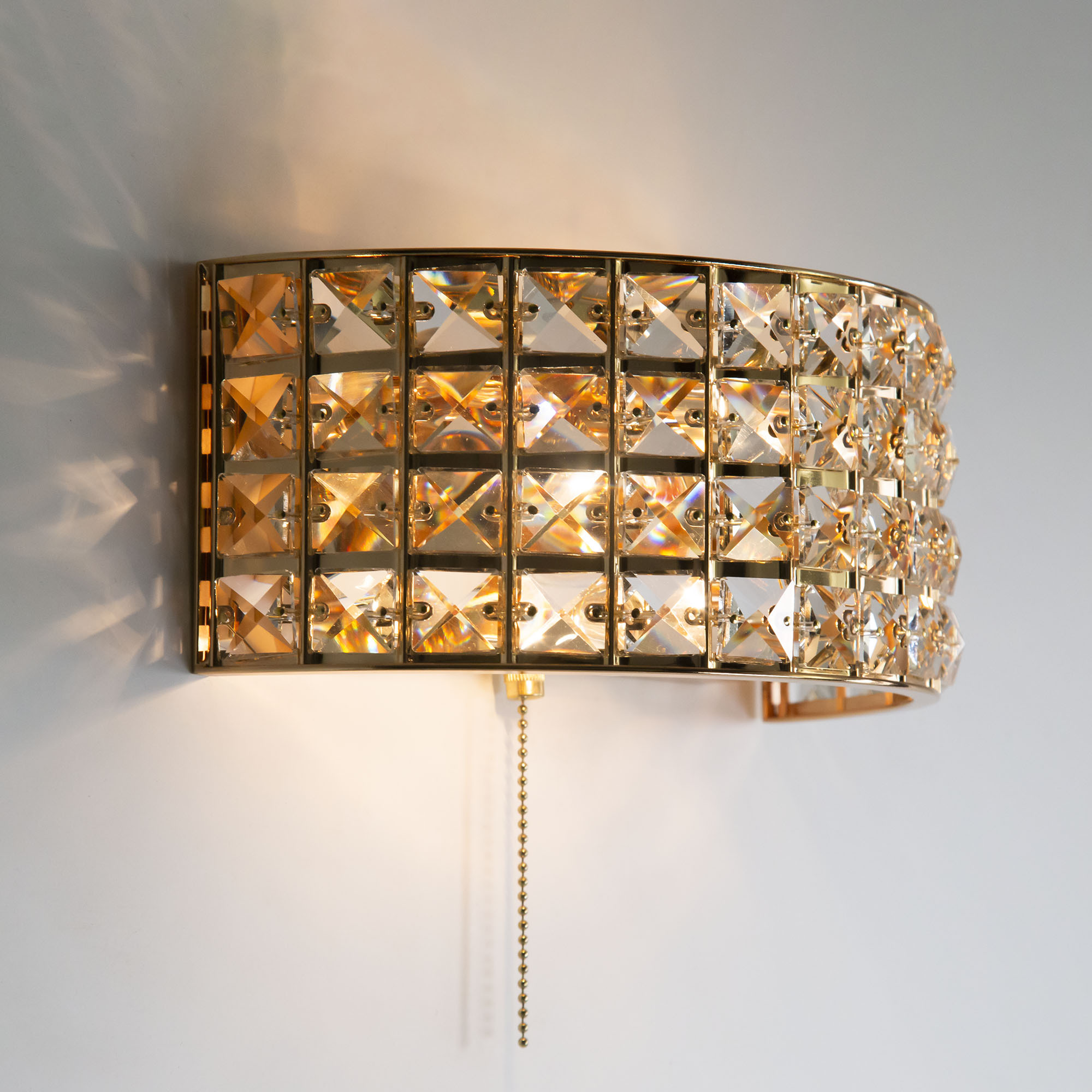 Шикарные бра из коллекции Портал станут изящным дополнением в интерьере ваших спален, гостиных, прихожих комнат или рабочих кабинетов. Стильное основание, сияющее ослепительным золотом, украшено хрустальными камнями знаменитой марки Asfour, которые способны преломлять световой поток, придавая ему неповторимые, волшебные оттенки. Светильник оснащён двумя термостойкими патронами, позволяющими использовать лампы накаливания до 60 Ватт. Если же, вы предпочитаете современные светодиодные лампы, то ограничения по мощности отсутствуют вовсе. При этом для того, чтобы хрусталь в полной мере раскрыл свои качества, желательно использовать исключительно прозрачные лампочки. Для удобства в эксплуатации в модель встроен собственный выключатель в виде золотой цепочки, в цвет самого изделия.