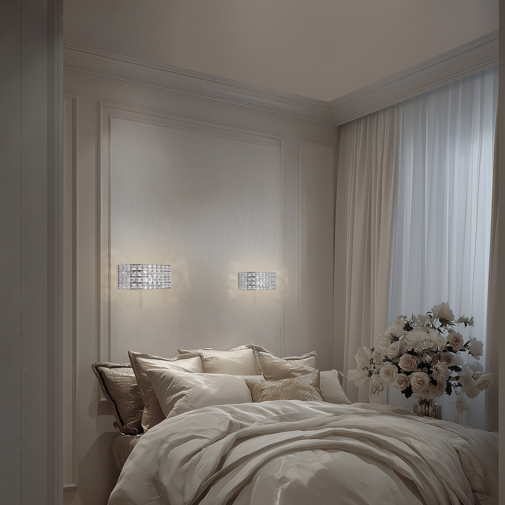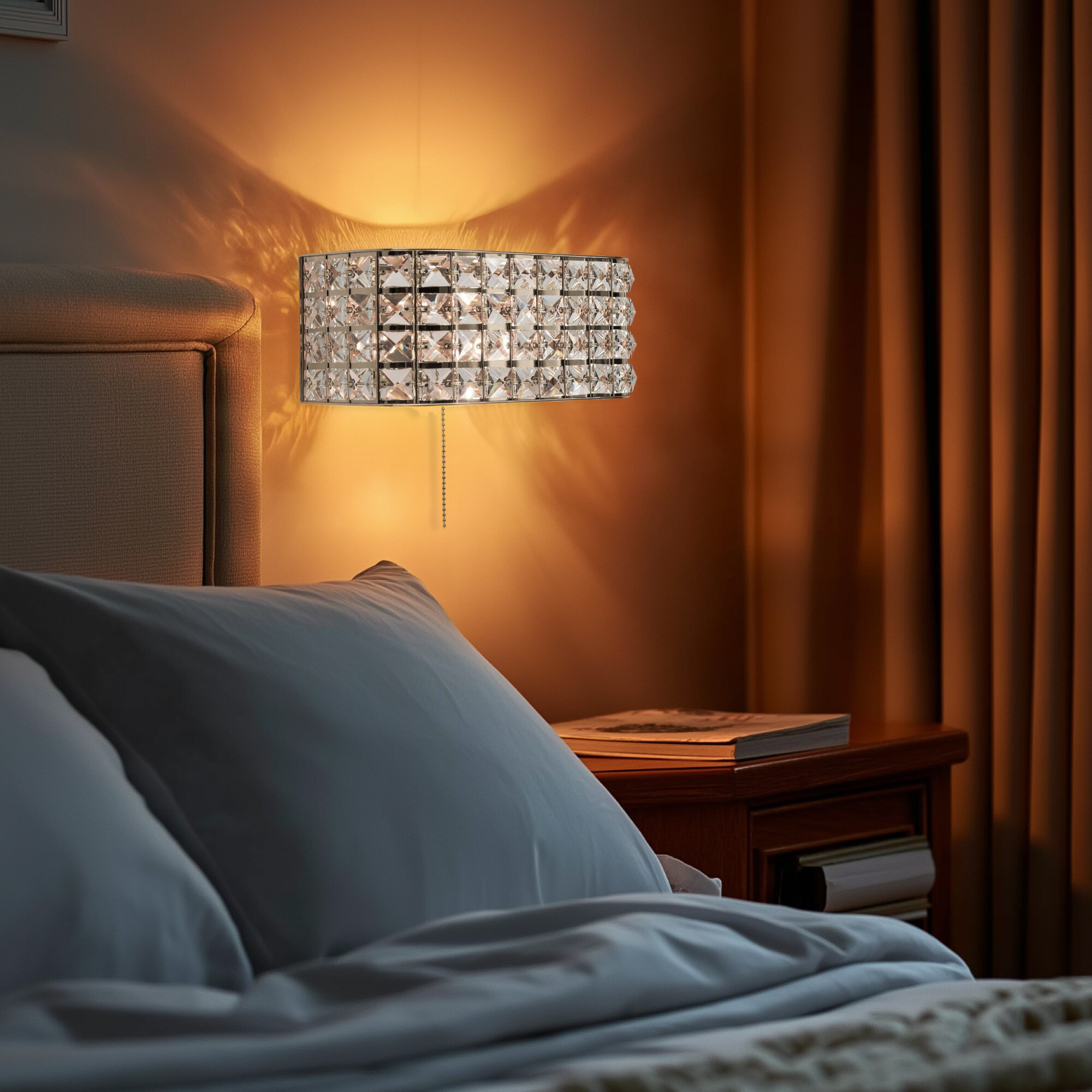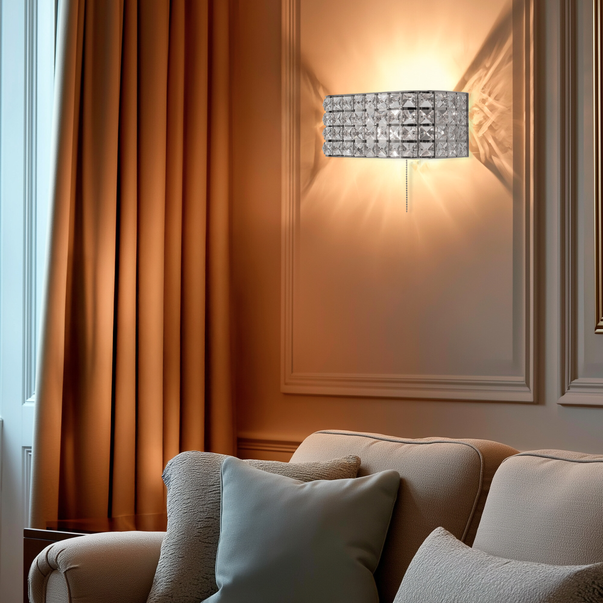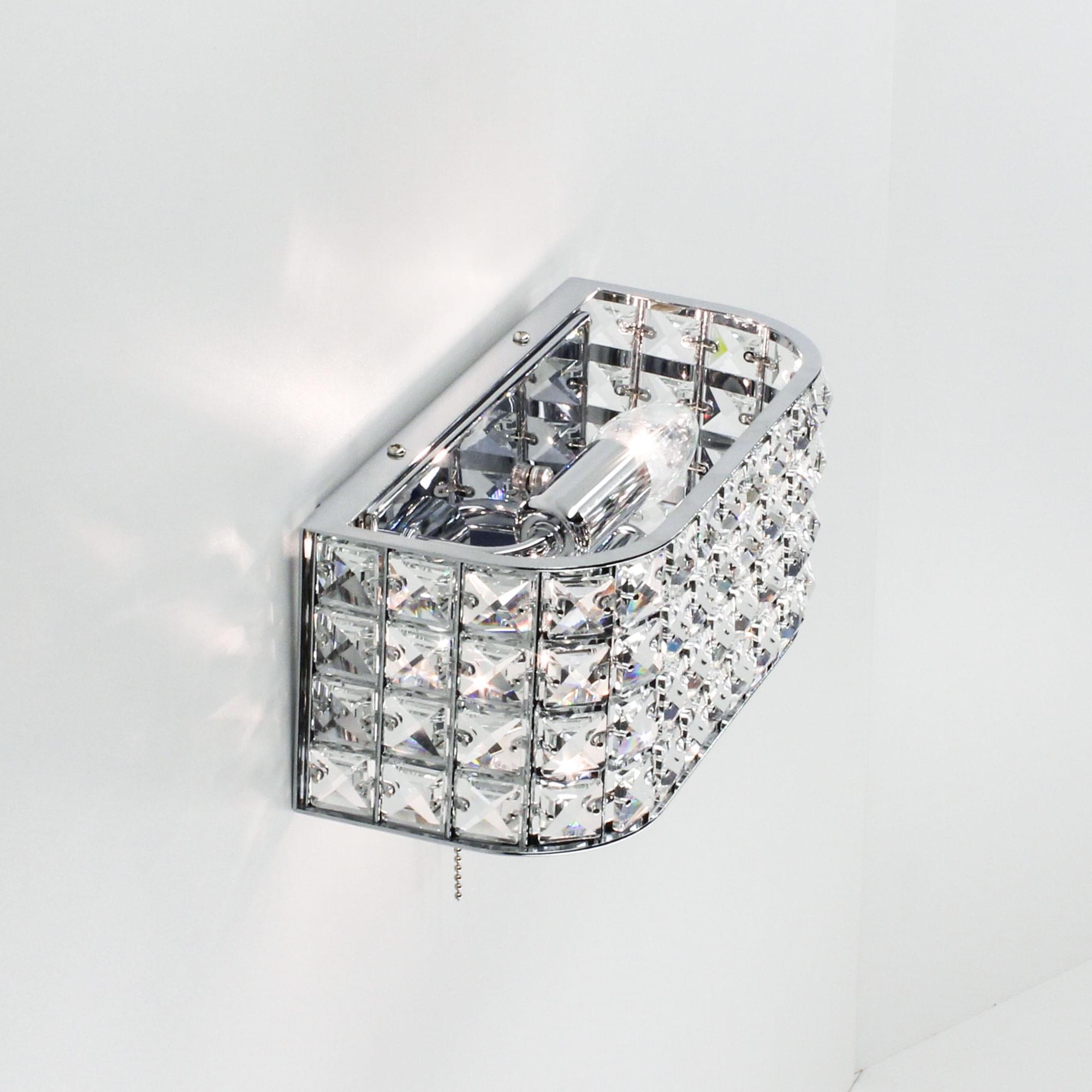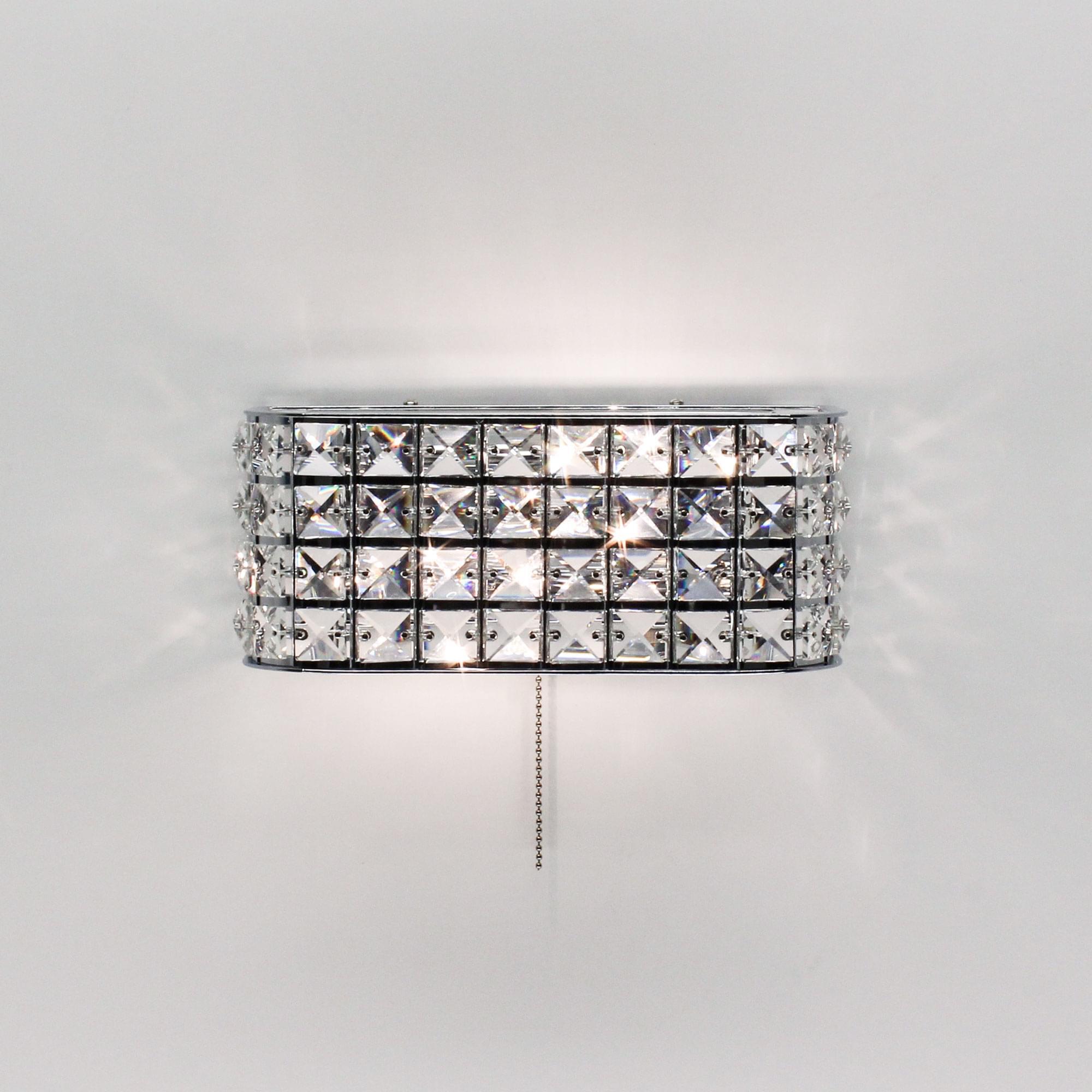 Элегантные настенные бра из серии Портал в хромированном исполнении станут настоящей находкой для любителей сдержанных, холодных тонов в интерьере. Восхитительная игра хрусталя в сочетании со сверкающим основанием притягивающего хромированного цвета способны привести в восторг истинных ценителей современной классики. Закругленные края прямоугольных конструкций делают их ещё более изящными и стильными. Мы всегда готовы поручиться за надёжность нашей продукции. Все элементы изделий изготовлены из материалов высочайшего качества. Термостойкие патроны с цоколем Е14 из качественного углепластика дадут возможность применять лампы накаливания мощностью до 60 Ватт. Модель способна полноценно осветить площадь от 3-ёх до 6-ти квадратных метров, а встроенный выключатель в виде хромированной цепочки станет удобным и приятным дополнением.