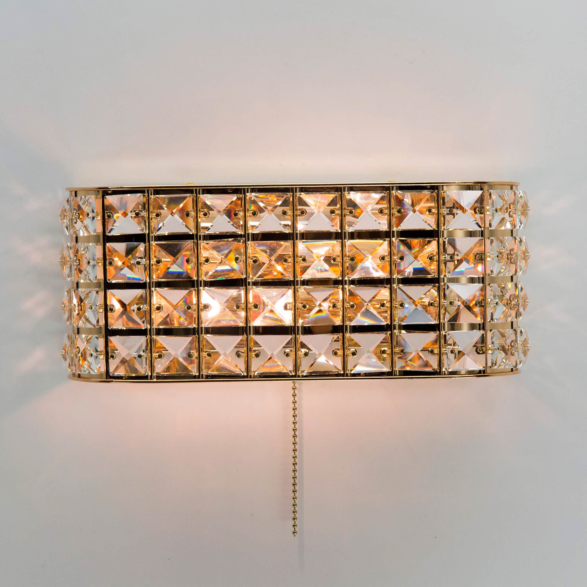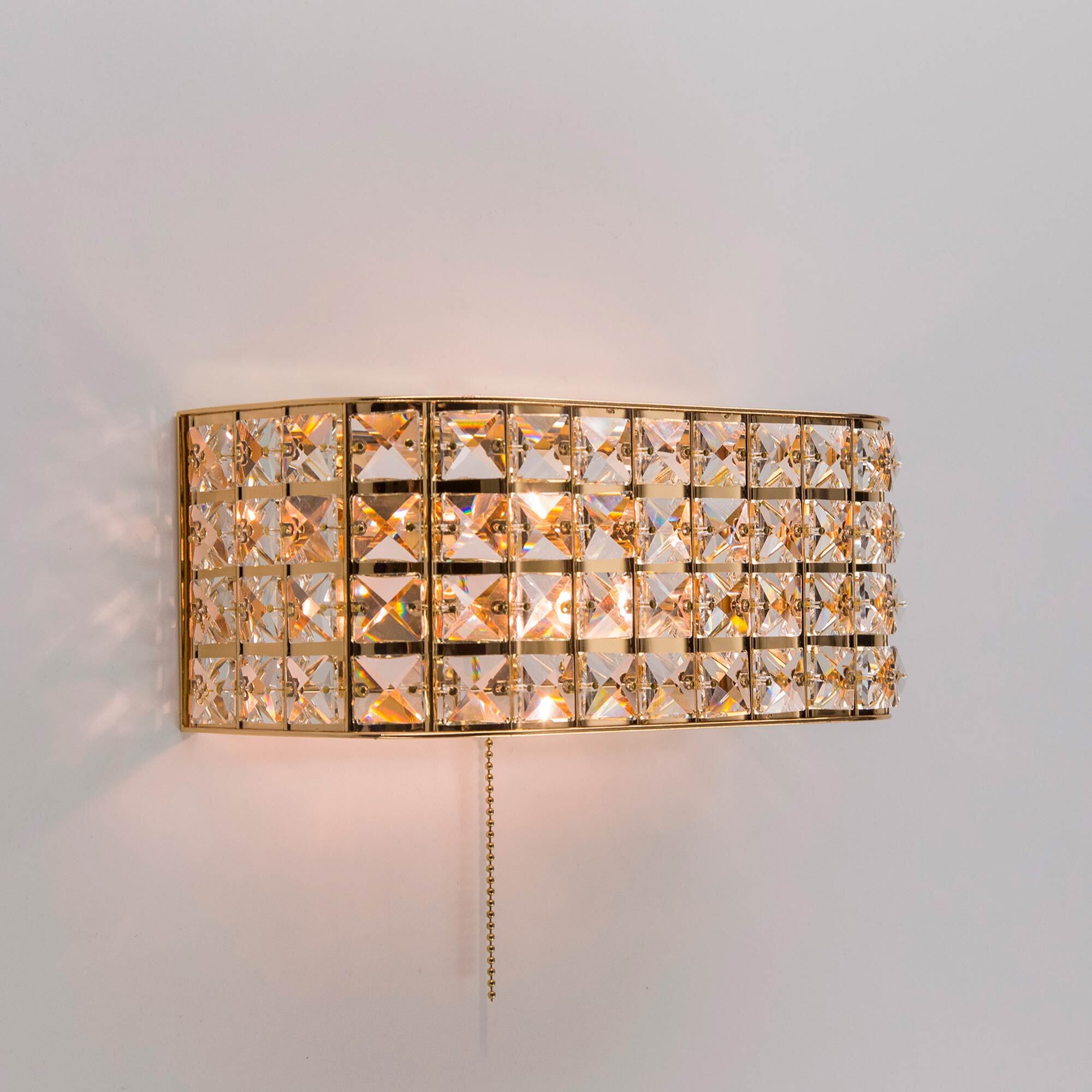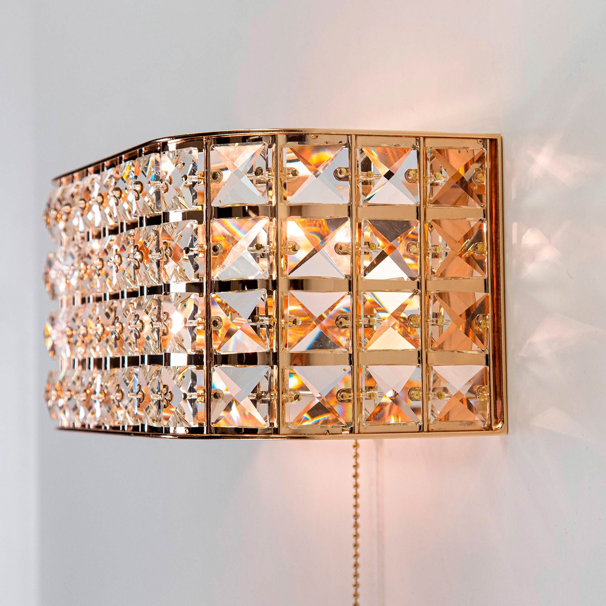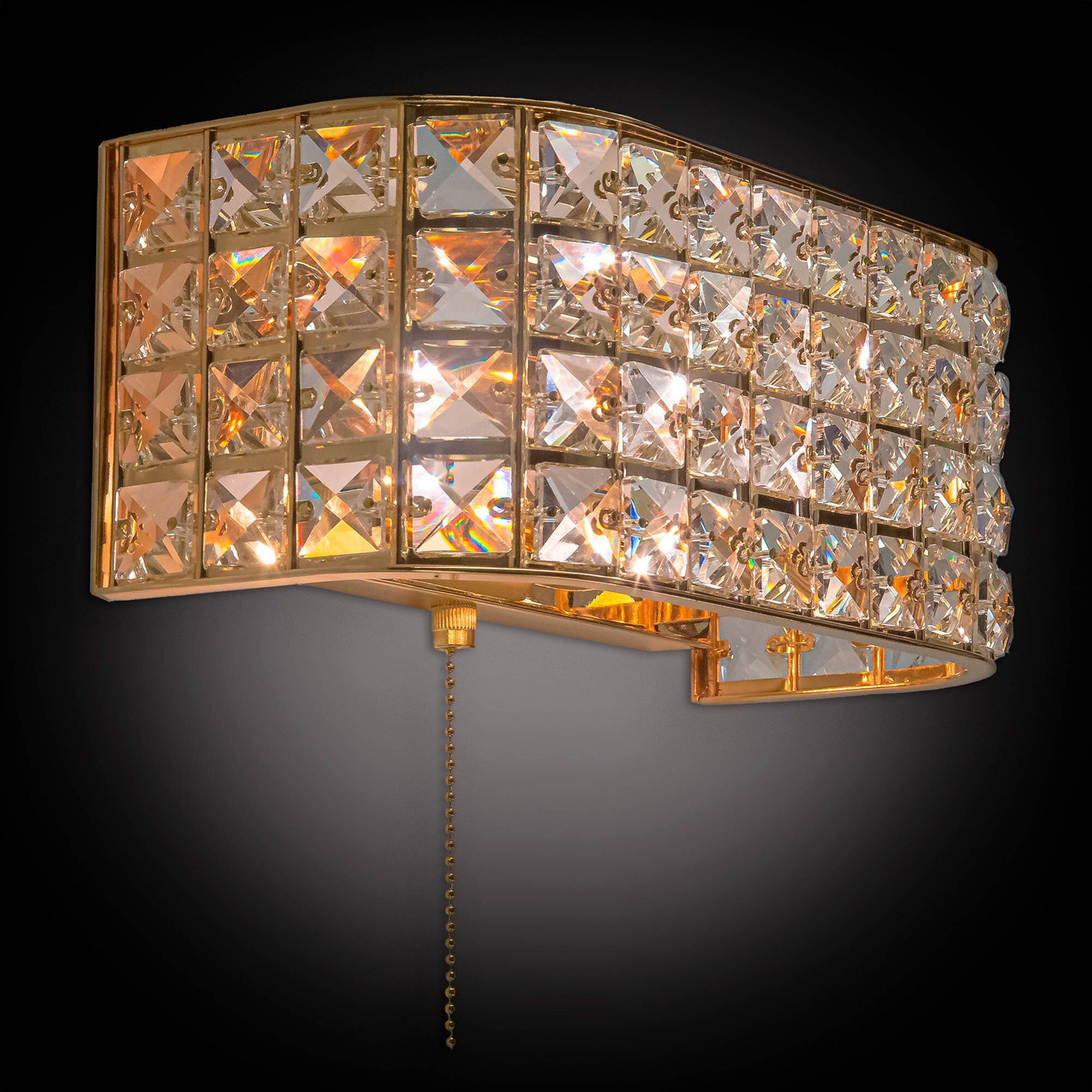 Элегантные настенные бра из серии Портал в золотом исполнении станут настоящей находкой для любителей мягких тёплых тонов в интерьере. Восхитительная игра хрусталя в сочетании со сверкающим основанием благородного золотого цвета способны привести в восторг истинных ценителей современной классики. Закругленные края прямоугольных конструкций делают их ещё более изящными и стильными. Все элементы изделий изготовлены из материалов высочайшего качества. Термостойкие патроны с цоколем Е14 из качественного углепластика дадут возможность применять лампы накаливания мощностью до 60 Ватт. Модель способна полноценно осветить площадь от 3-ёх до 6-ти квадратных метров, а встроенный выключатель в виде золотой цепочки станет удобным и приятным дополнением.