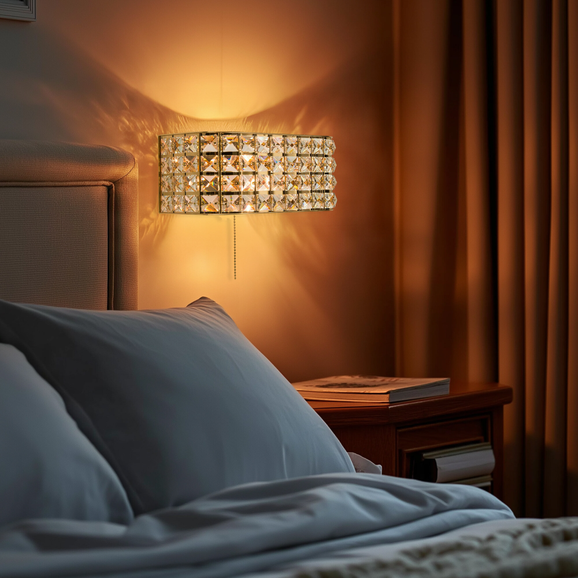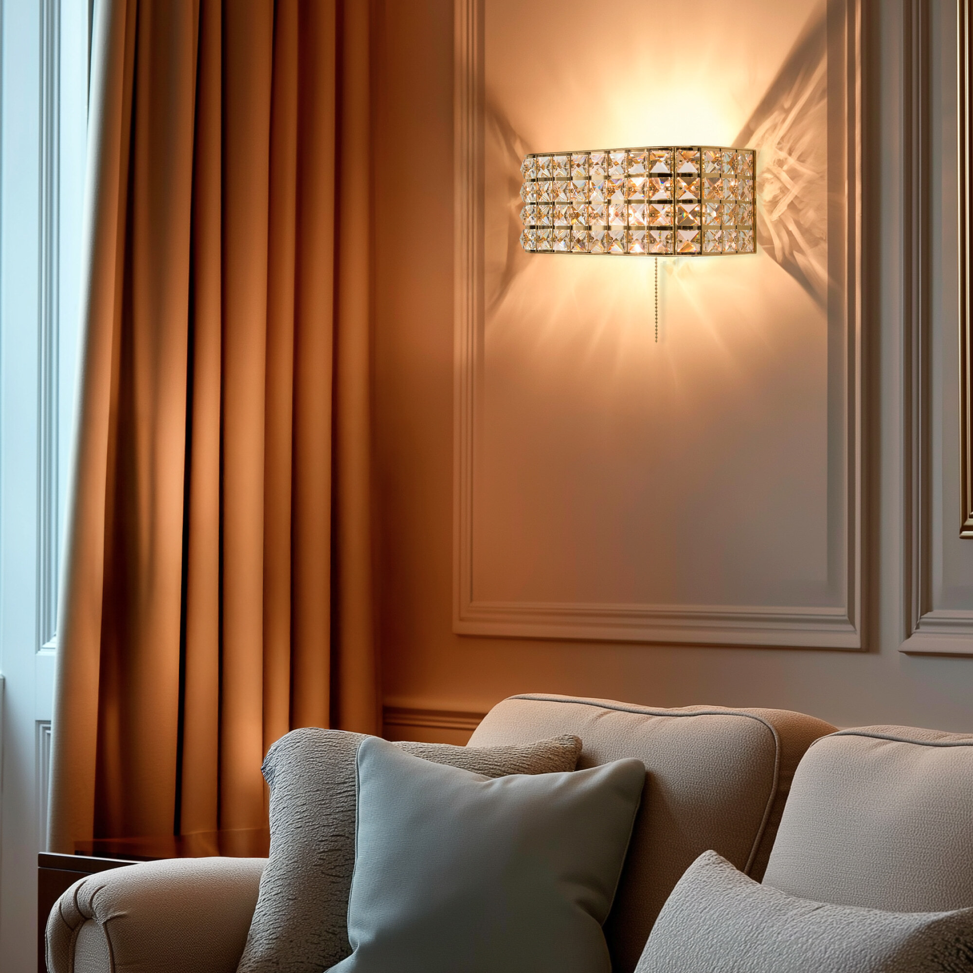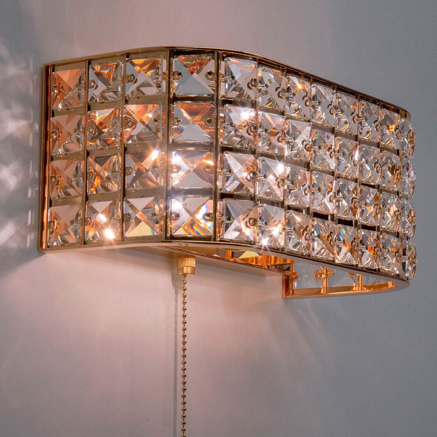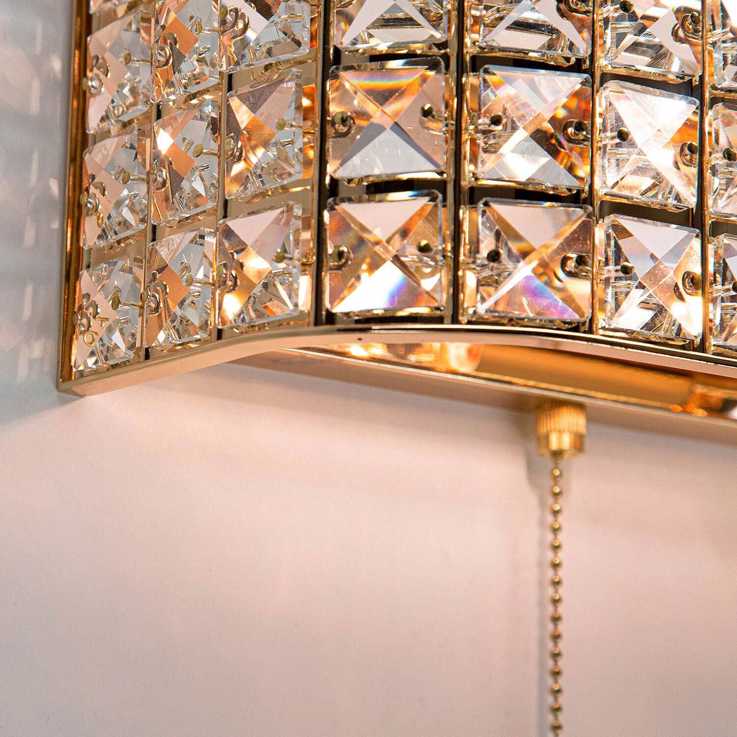 Элегантные настенные бра из серии Портал в золотом исполнении станут настоящей находкой для любителей мягких тёплых тонов в интерьере. Восхитительная игра хрусталя в сочетании со сверкающим основанием благородного золотого цвета способны привести в восторг истинных ценителей современной классики. Закругленные края прямоугольных конструкций делают их ещё более изящными и стильными. Все элементы изделий изготовлены из материалов высочайшего качества. Термостойкие патроны с цоколем Е14 из качественного углепластика дадут возможность применять лампы накаливания мощностью до 60 Ватт. Модель способна полноценно осветить площадь от 3-ёх до 6-ти квадратных метров, а встроенный выключатель в виде золотой цепочки станет удобным и приятным дополнением.