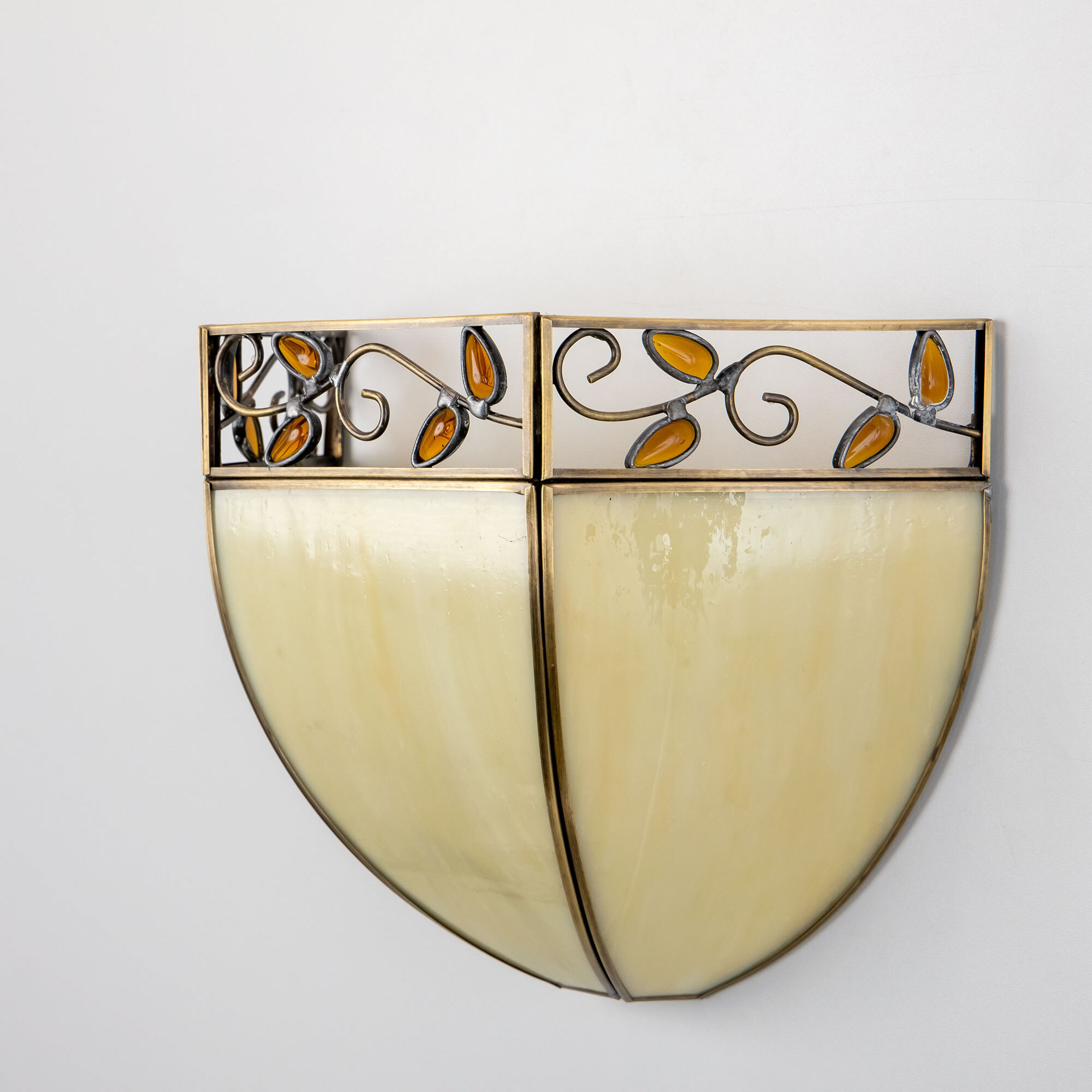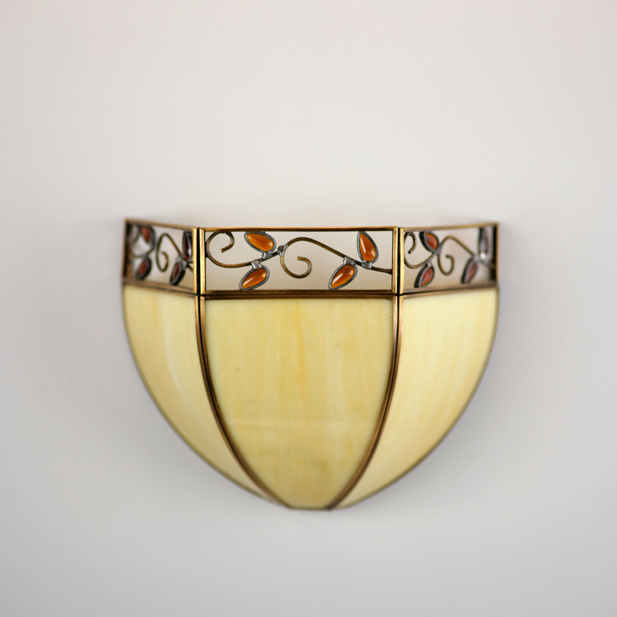 Настенный светильник Citilux Шербург-1 CL440411 в стиле Тиффани. Основание металлическое. Плафон ручной работы, из витражного стекла бежевого цвета с декоративными янтарными элементами. В изделии 1 лампа Е27 максимальной мощностью для ламп накаливания 75Вт. Светодиодные лампы можно использовать более яркие. Высота 20см, ширина 26см, глубина 10,5см. Модель рассчитана на подключение к скрытой проводке и настенным выключателем. На корпусе выключателя нет.