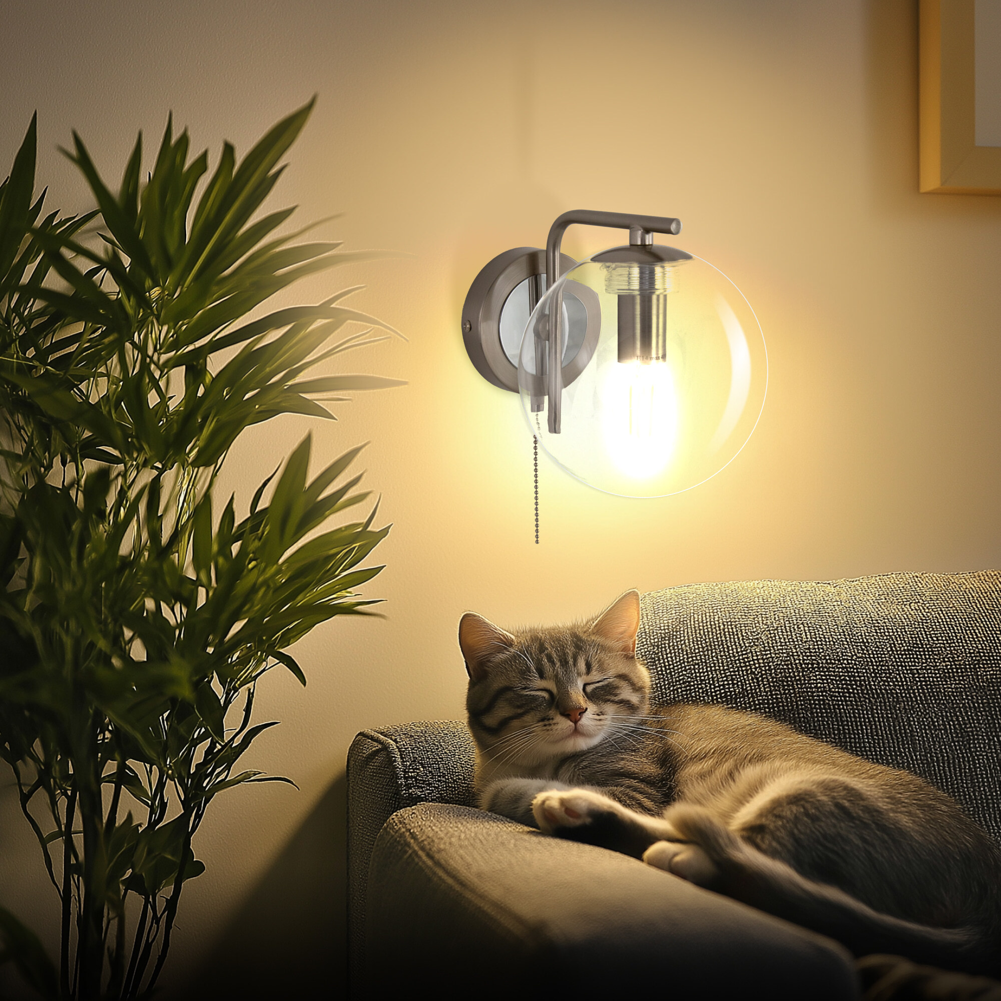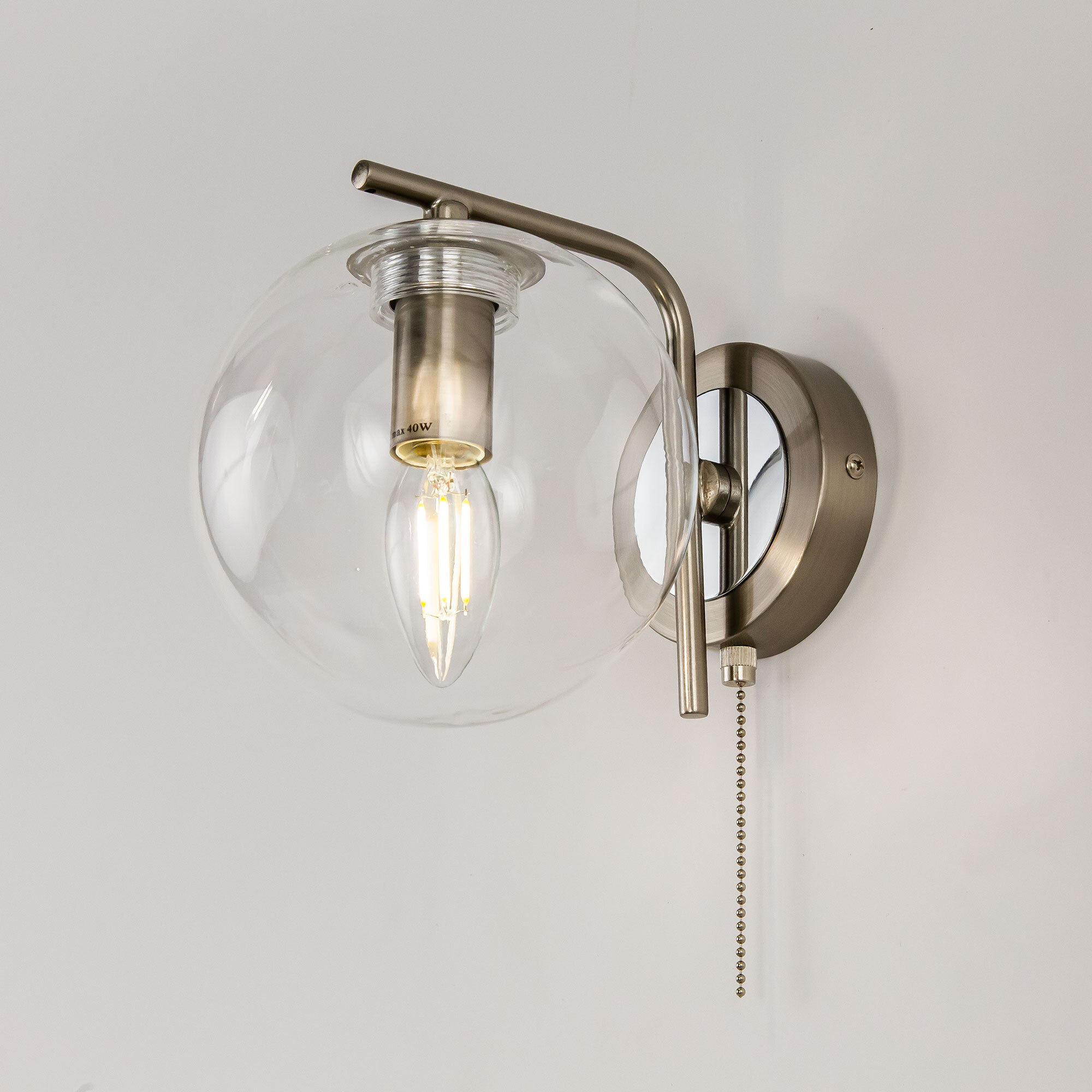 В изделии 1 лампа с цоколем Е14, форма колбы свеча, максимальной мощностью для ламп накаливания 40Вт (лампа в комплект не входит, приобретается отдельно). Светильник оснащён удобным выключателем. Тип крепления к стене – планка.