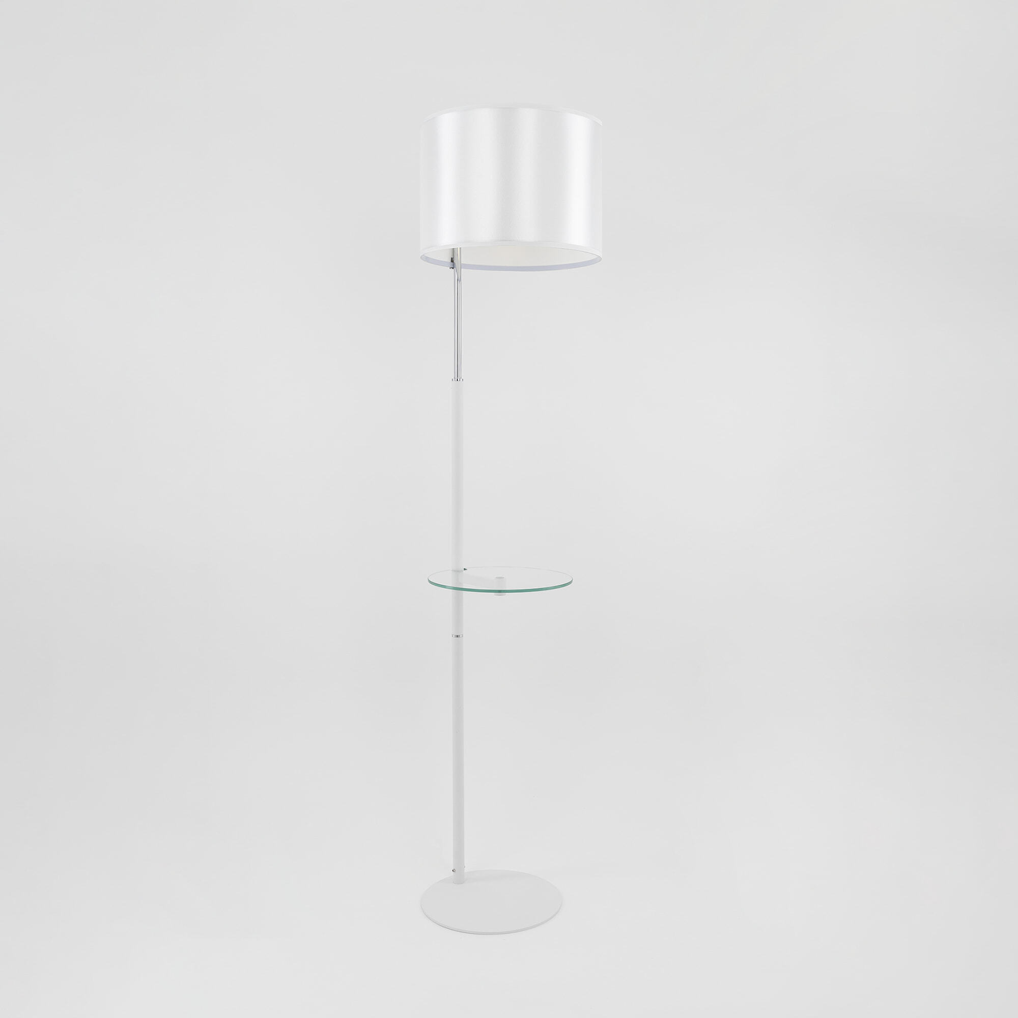 Торшер с абажуром Citilux Батлер CL806010 выполнен в современном стиле. Корпус металлический, цвет белый матовый с декоративными хромированными элементами. Абажур цилиндрической формы, изготовлен из белой атласной ткани на подложке из оптического полимера. Столик круглой формы из прозрачного стекла.