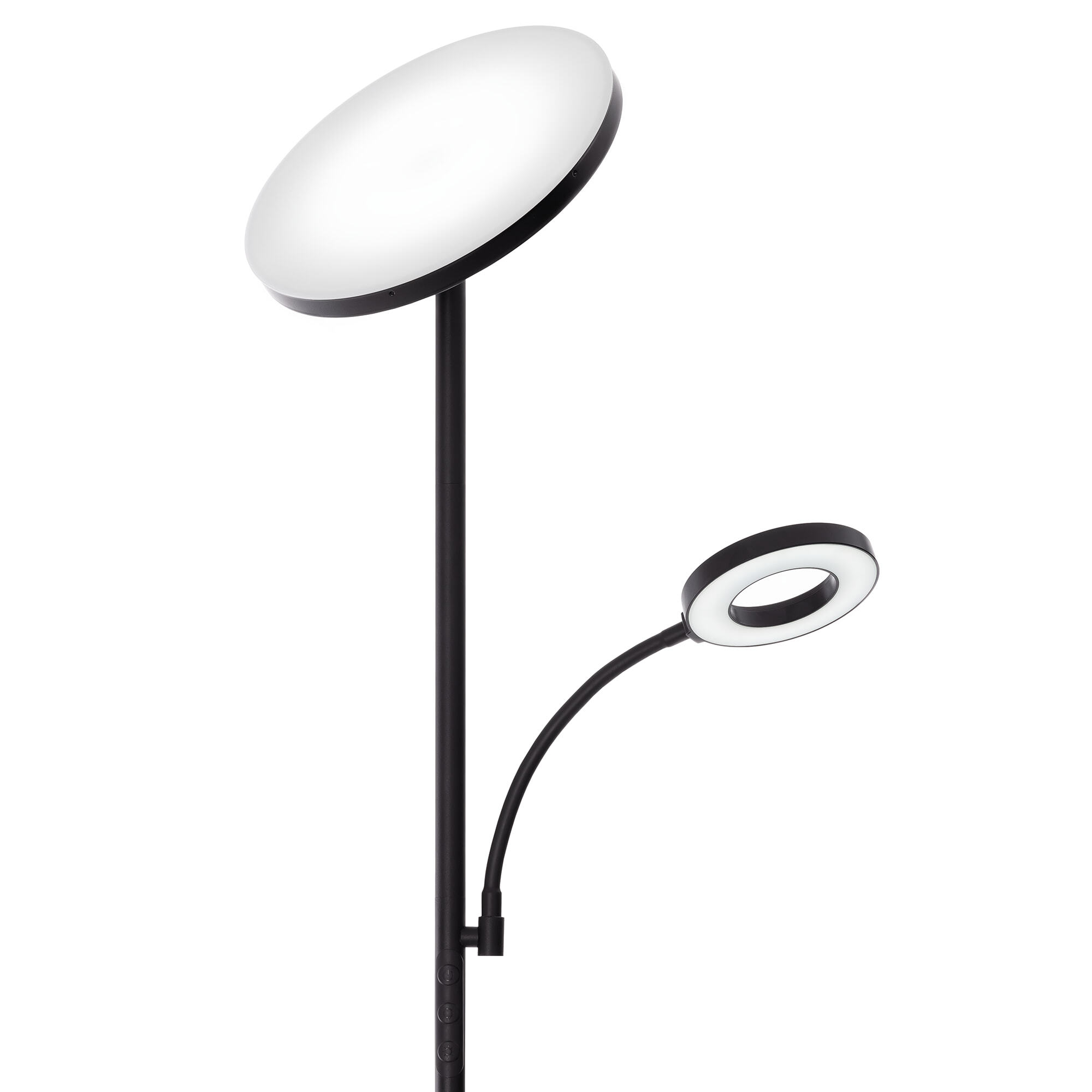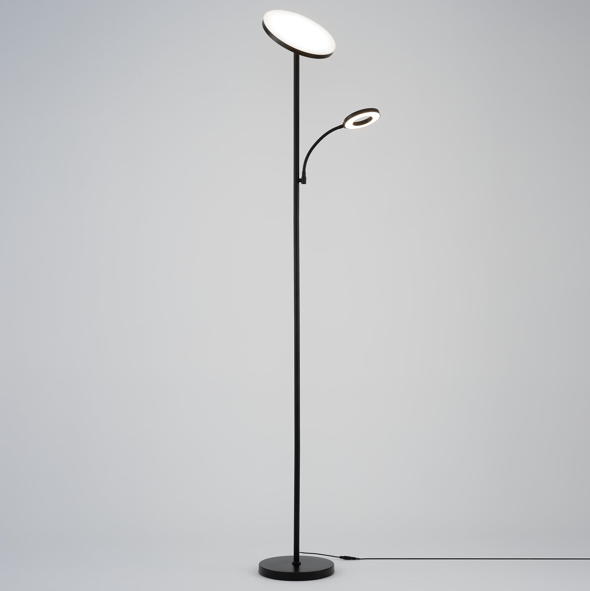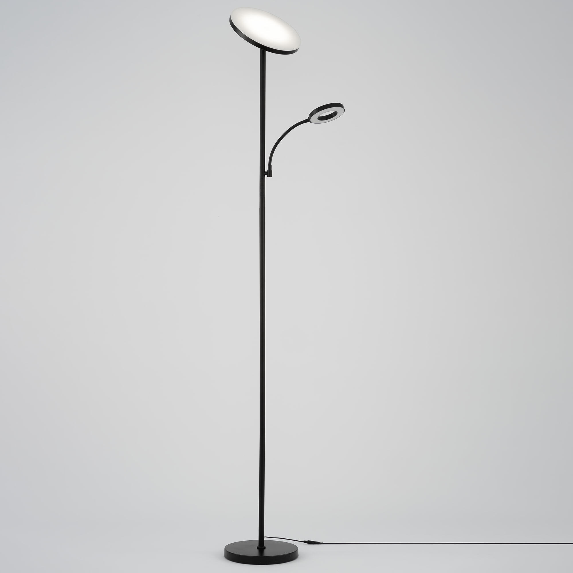 Светодиодный напольный светильник Citilux Click CL810011 с сенсорным управлением выполнен в современном стиле. Корпус металлический, цвет чёрный матовый. Торшер имеет два светодиодных модуля-плафона круглой формы. Верхний плафон поворотный, для общего освещения, мощность 35Вт. Нижний плафон для чтения, на гибкой ножке, мощность 7Вт.
