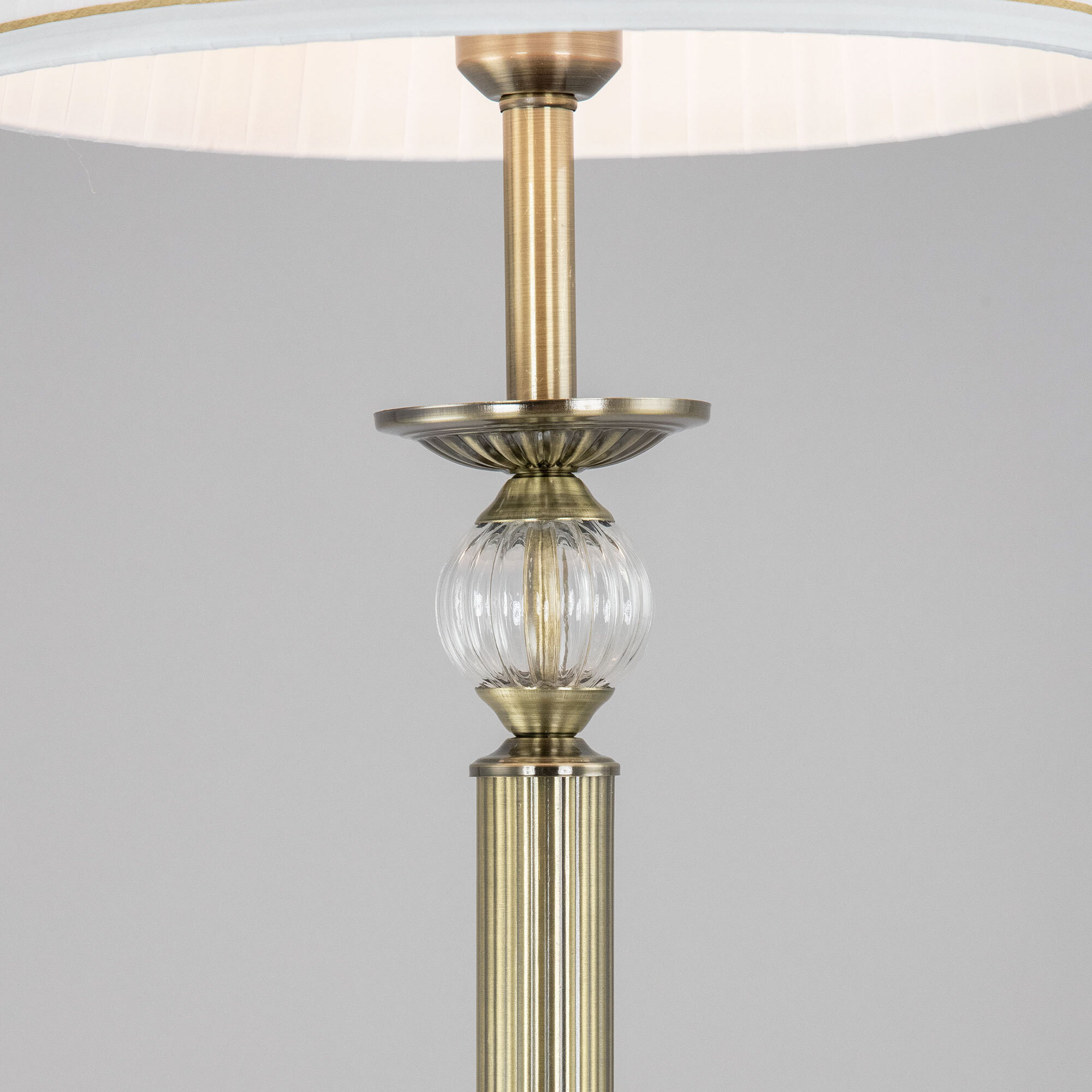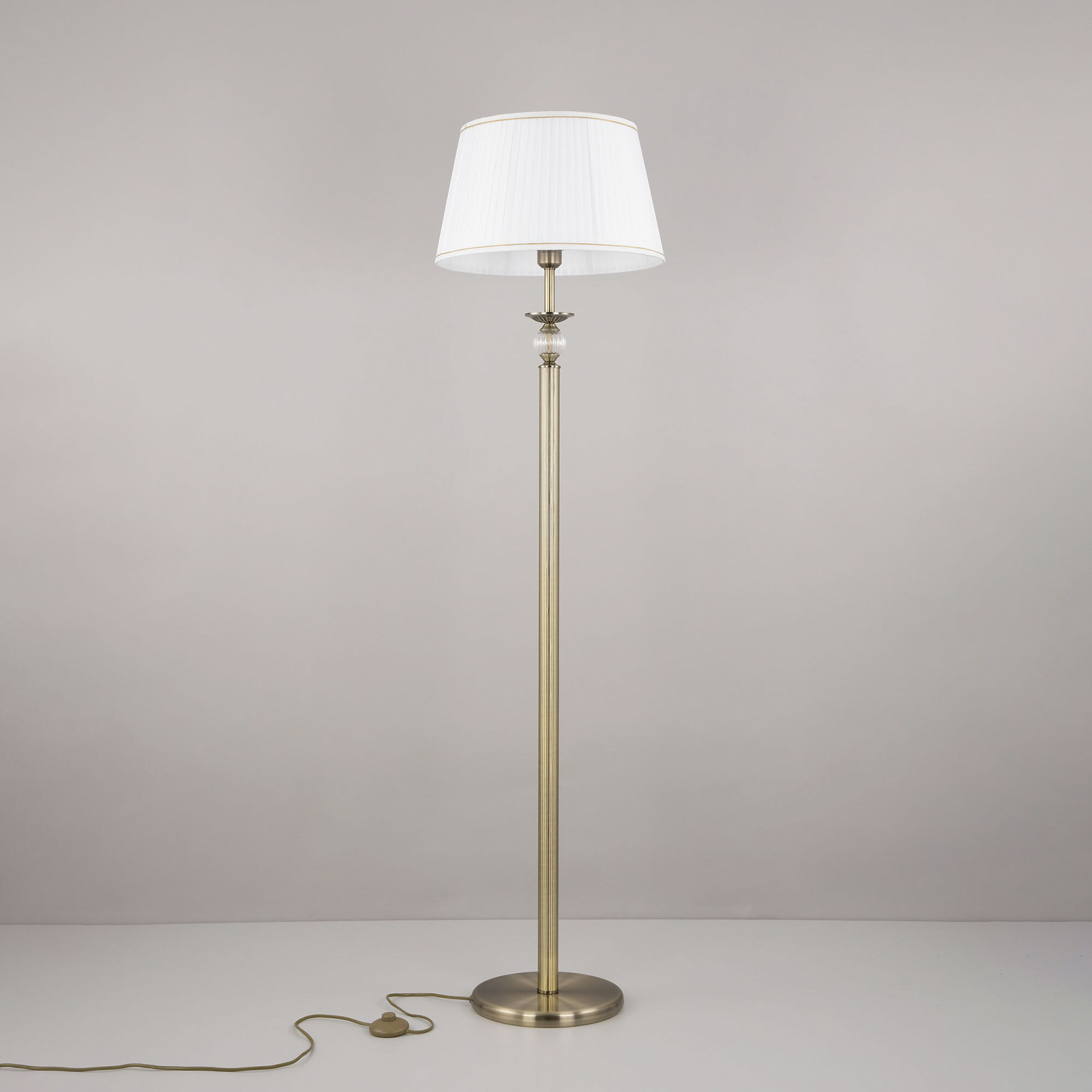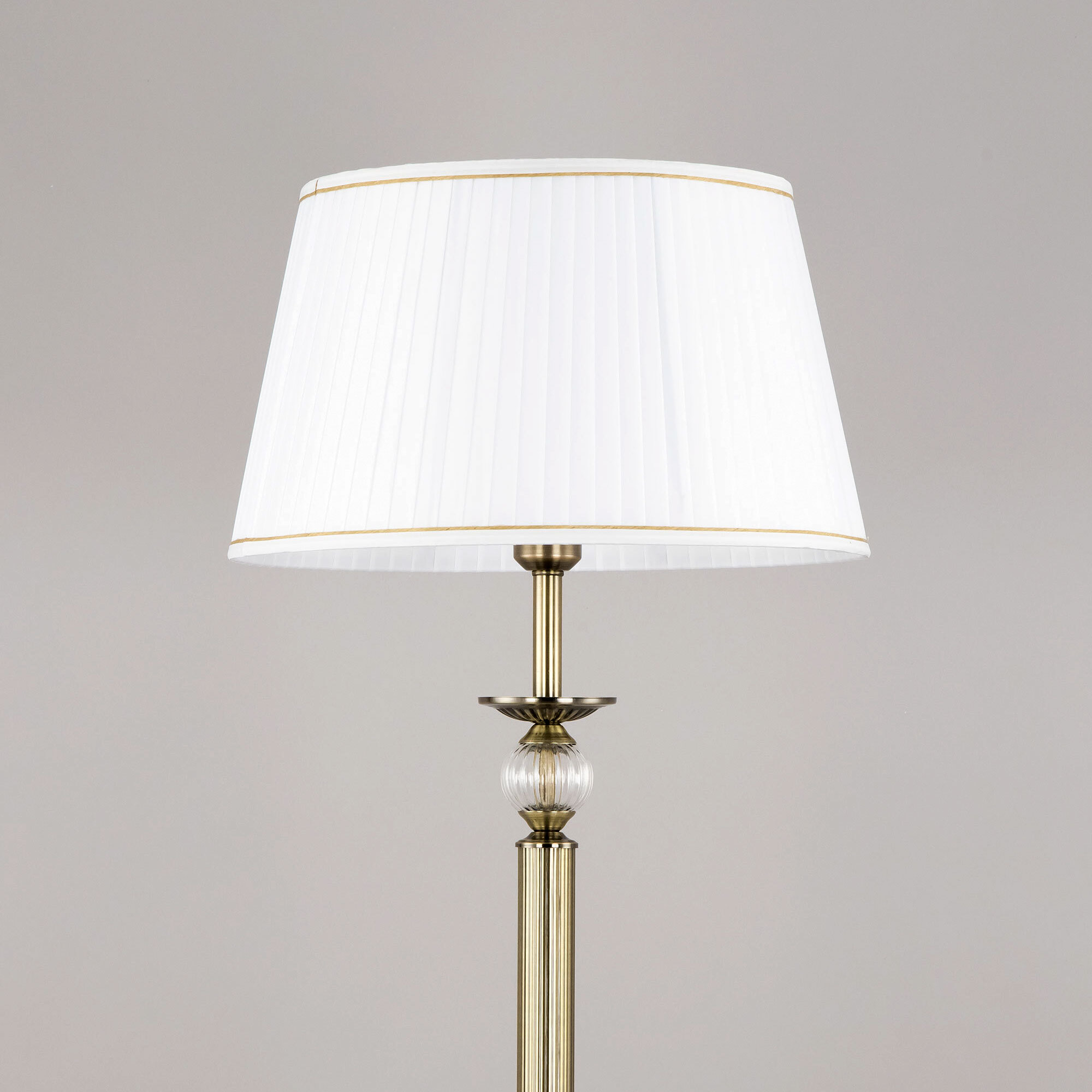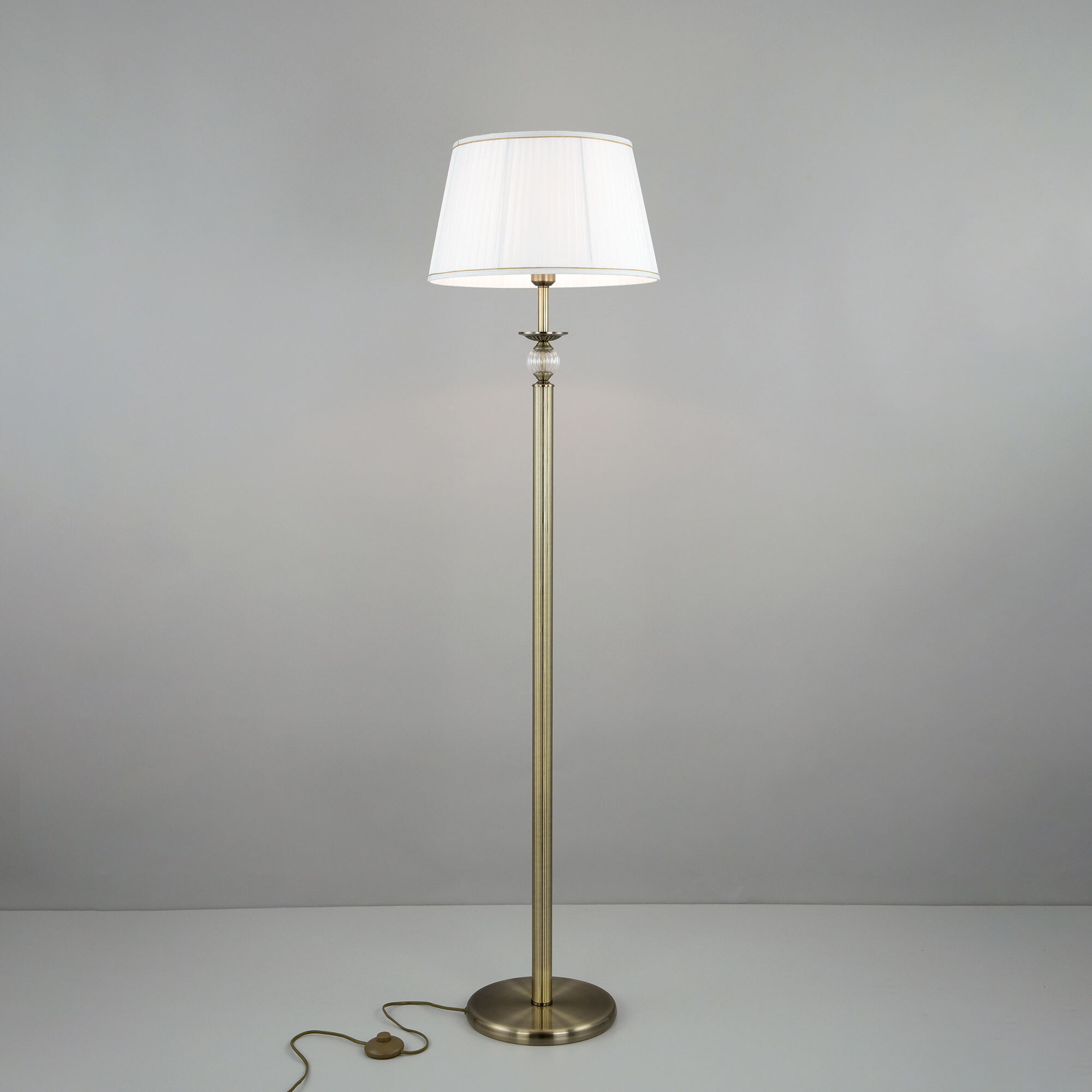 Элегантный торшер Citilux Гера CL433913 выполнен в классическом стиле. Корпус металлический, благородного бронзового цвета. Стройная рифлёная стойка изыскано декорирована прозрачным рельефным стеклянным шаром. Тканевый абажур из плиссированного атласа белого цвета окантован изящной тесьмой.