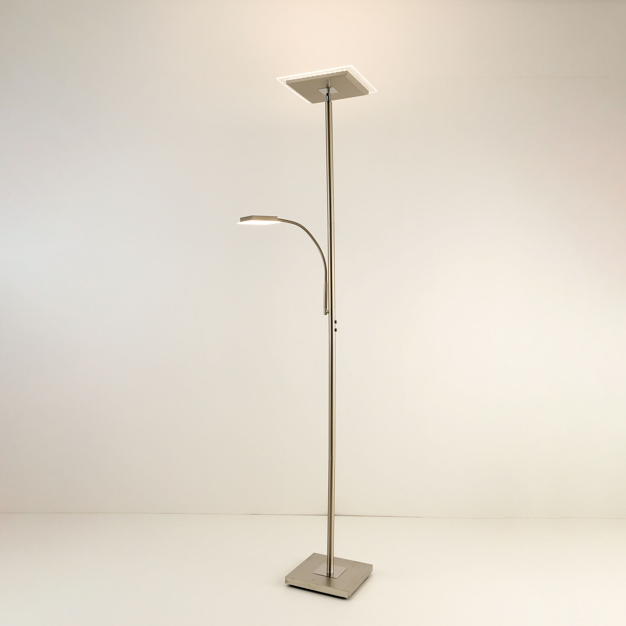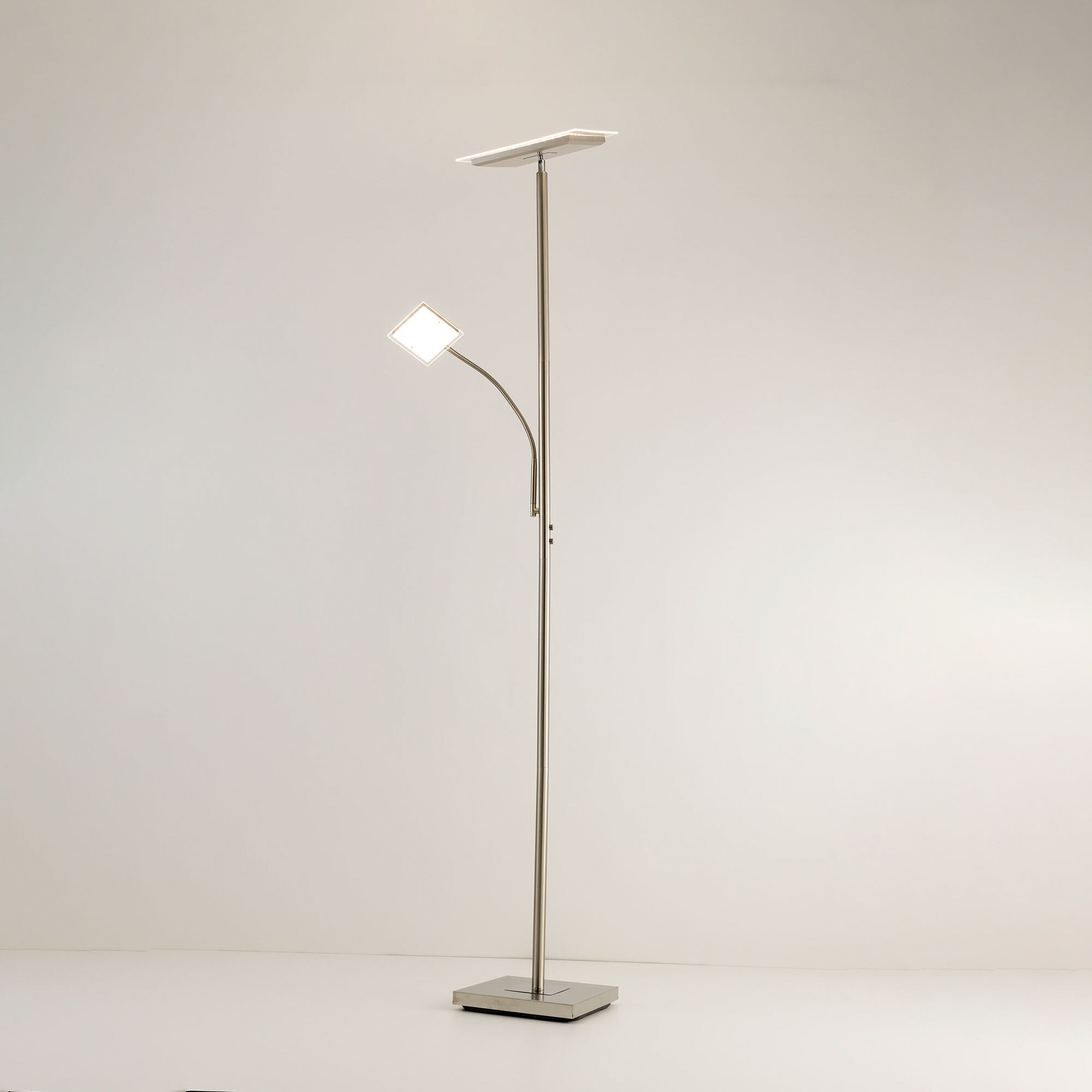Светодиодный напольный светильник Citilux Харди CL802011 с сенсорным управлением. Корпус металлический, цвет матовый хром с декоративными блестящими хромированными элементами. Изделие имеет два светодиодных модуля – плафона, квадратной формы. Верхний плафон поворотный, для общего освещения, мощность 24Вт. Нижний плафон на гибкой ножке, для чтения, мощность 6Вт. Цветовая температура 3000К – тёплый белый свет. Верхний свет с плавной регулировкой яркости 10-100%, подсветка для чтения с индивидуальным выключателем. Размеры: 28х28см, высота 182см, длина сетевого шнура 2,1м. Торшер Citilux Харди CL802011 подойдёт для комфортного освещения современных квартир и загородных домов.Citilux CL80201 HARDY: Вдохновение в каждом луче.