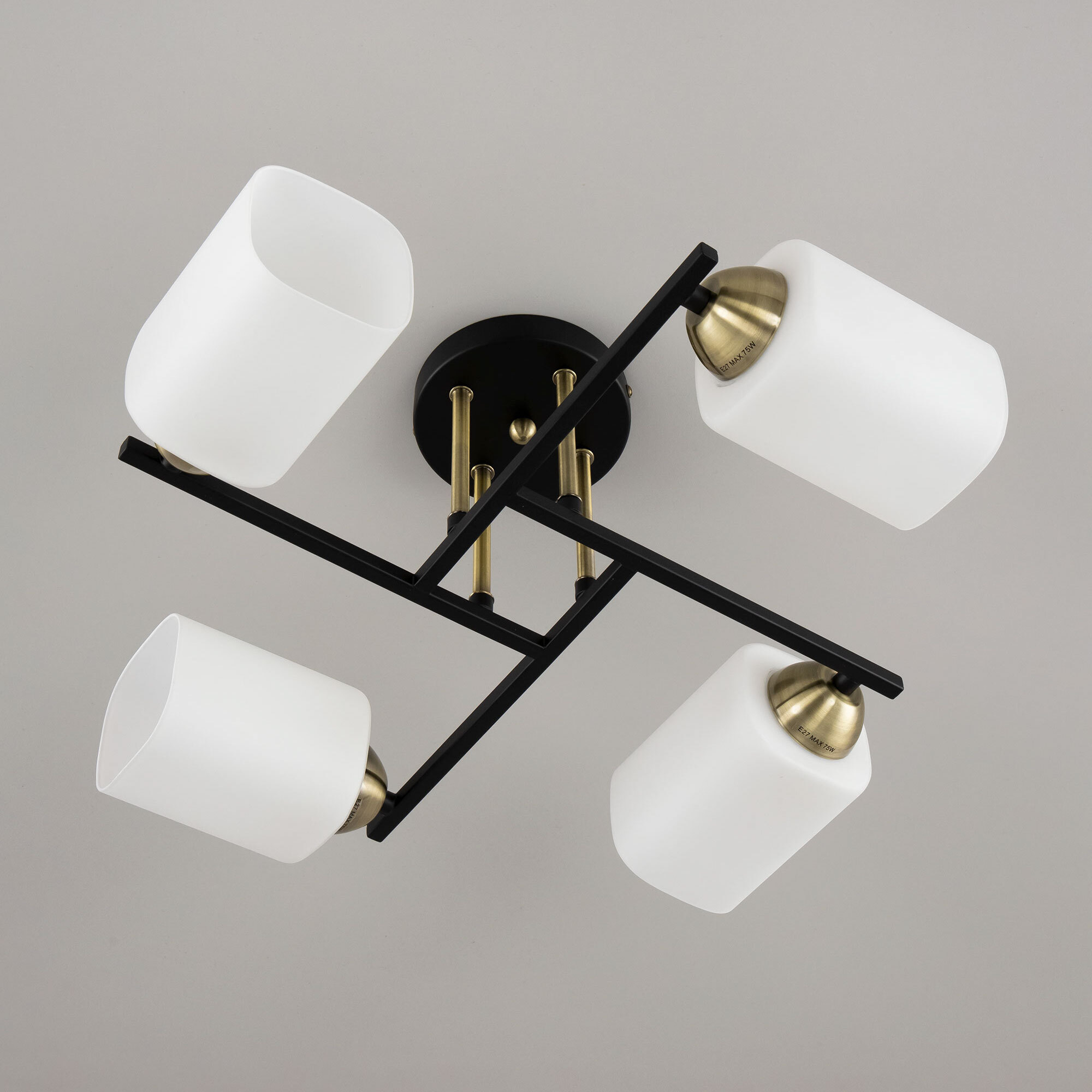Люстра Citilux Генри CL130245 выполнена в современном стиле. Корпус светильника металлический, цвет чёрный, с декоративными бронзовыми элементами. Основание круглой формы, к нему на коротких штангах крепятся прямые рожки. Плафоны стеклянные матовые квадратной формы, расположены горизонтально. В люстре четыре лампы с цоколем Е27 и максимальной мощностью для ламп накаливания 75Вт. Светодиодные лампы можно использовать более яркие. Модель подходит для всех типов потолков, в том числе натяжных. Тип крепления – планка. Светильник рассчитан на работу как с одноклавишным, так и с двухклавишным выключателем.Citilux CL130 HENRY: Вдохновение в каждом луче.