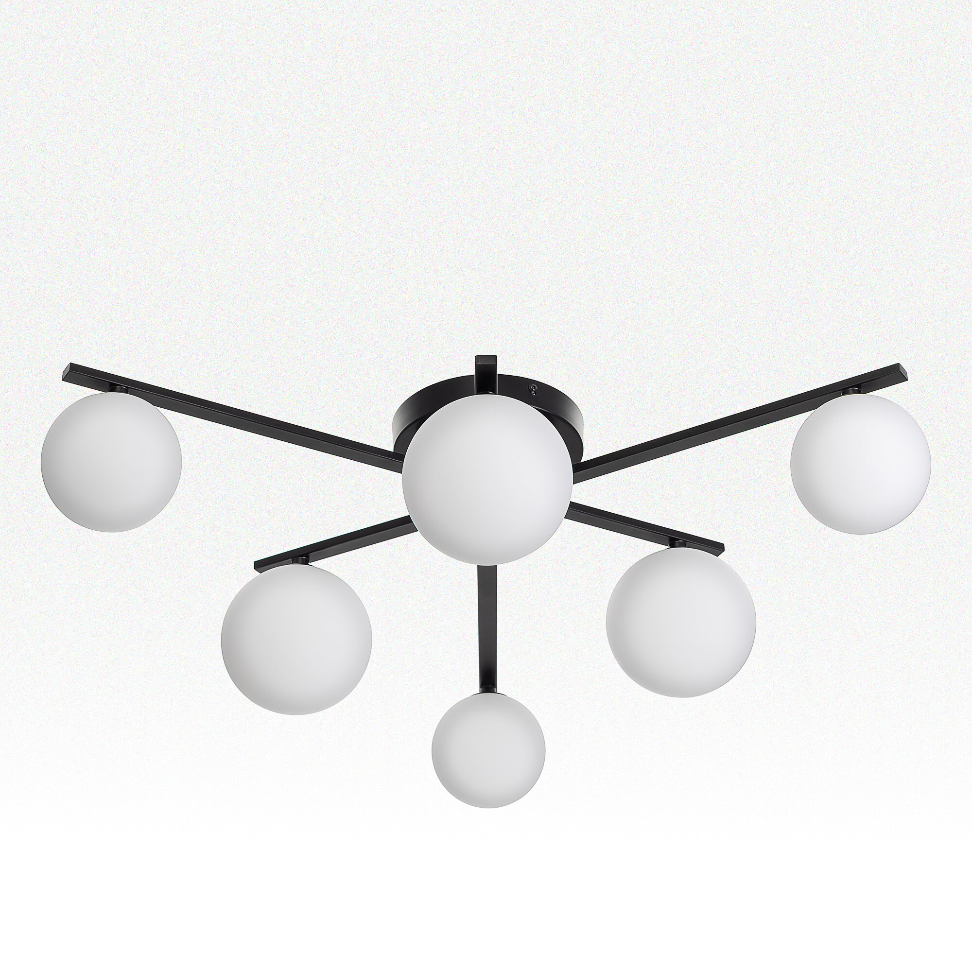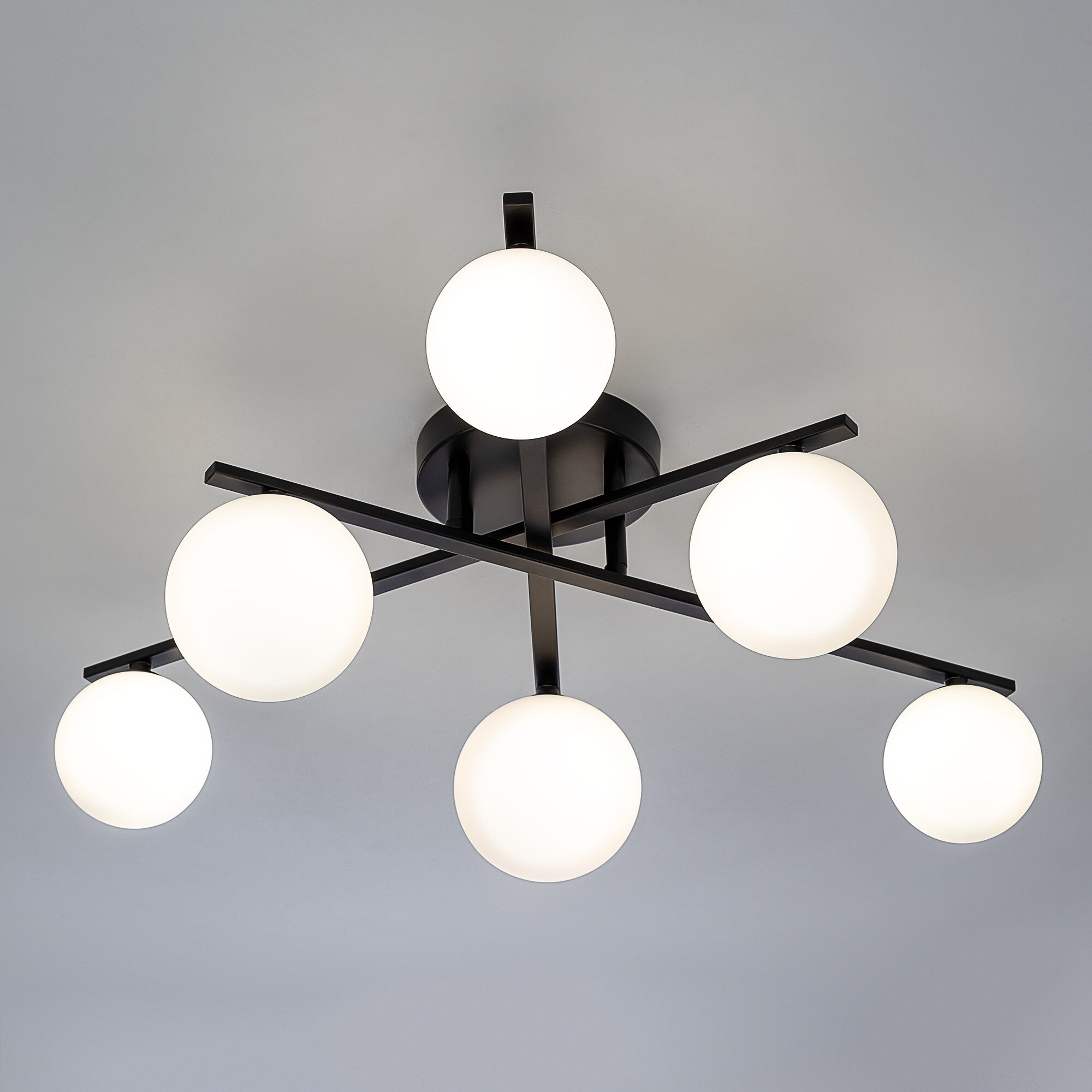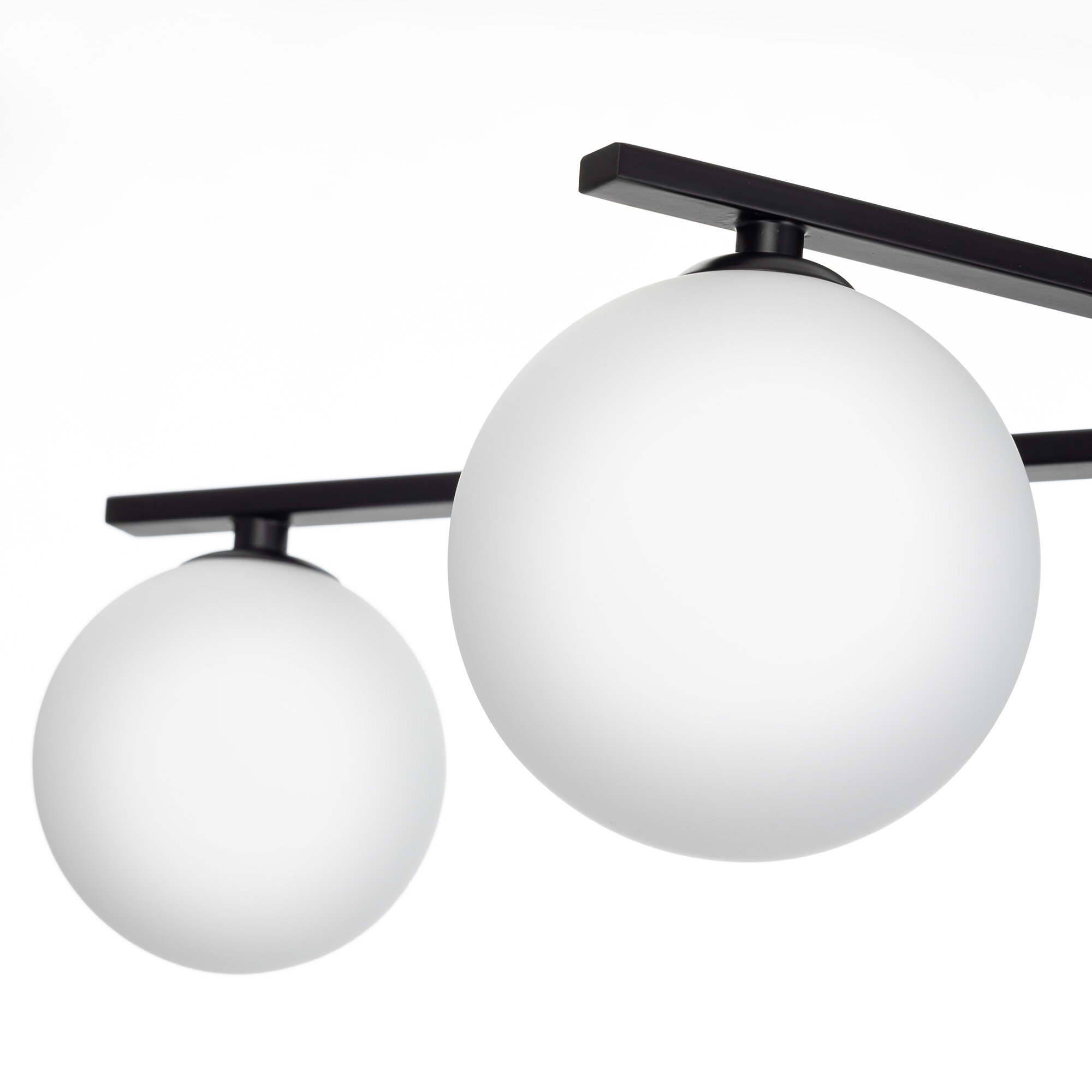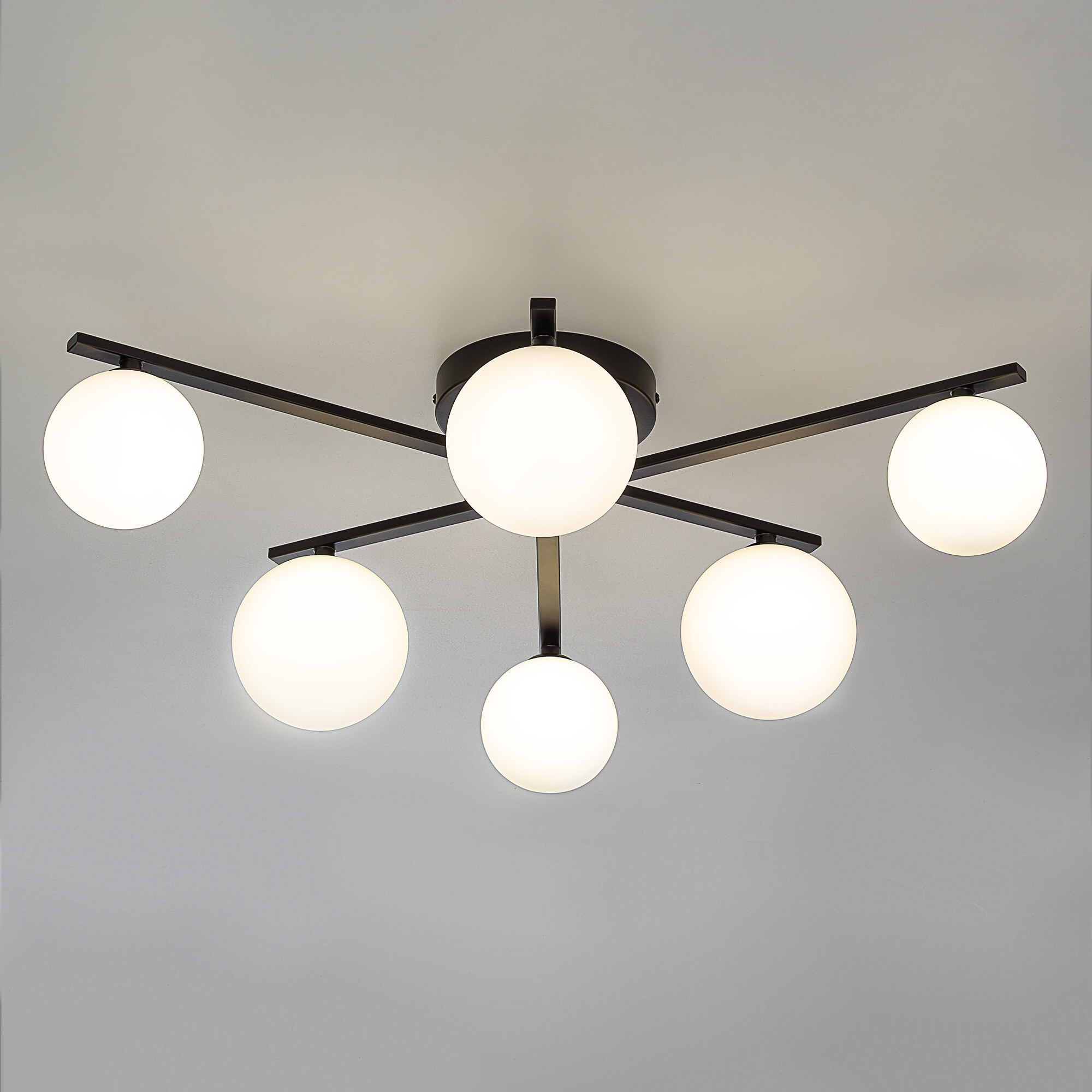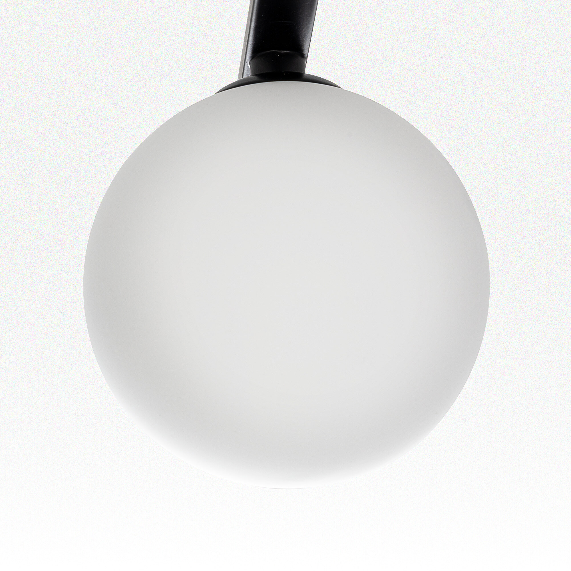 Корпус люстры изготовлен из металлического сплава классического черного цвета. Плафоны-сферы из белого матового стекла разного диаметра попарно расположены на горизонтальных рожках-штангах. Плафоны имеют диаметр 10 и 13см, размещены симметрично относительно центра люстры. Форма, материал и расположение плафонов обеспечивают мягкий заливной свет, который равномерно распределяется по всему помещению.