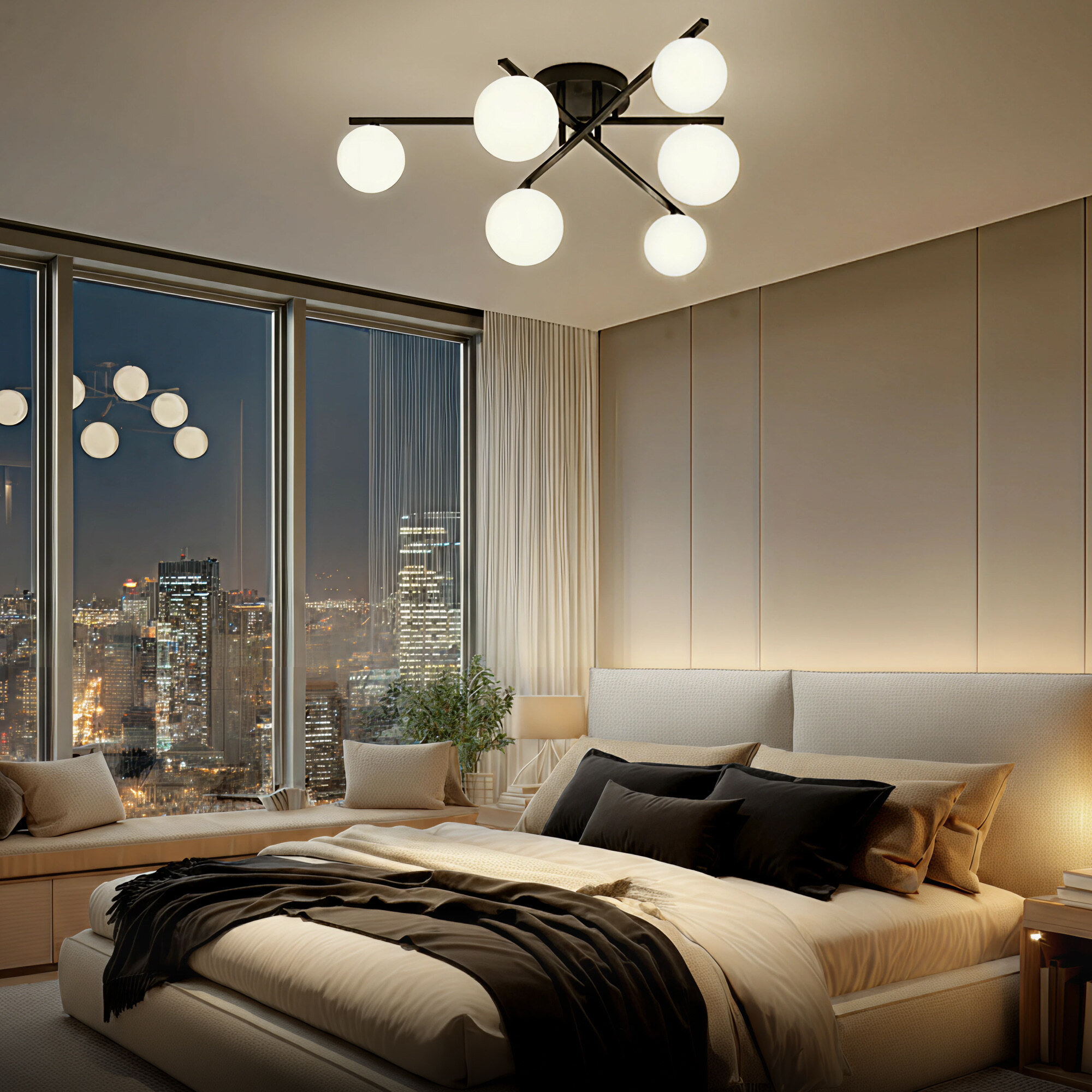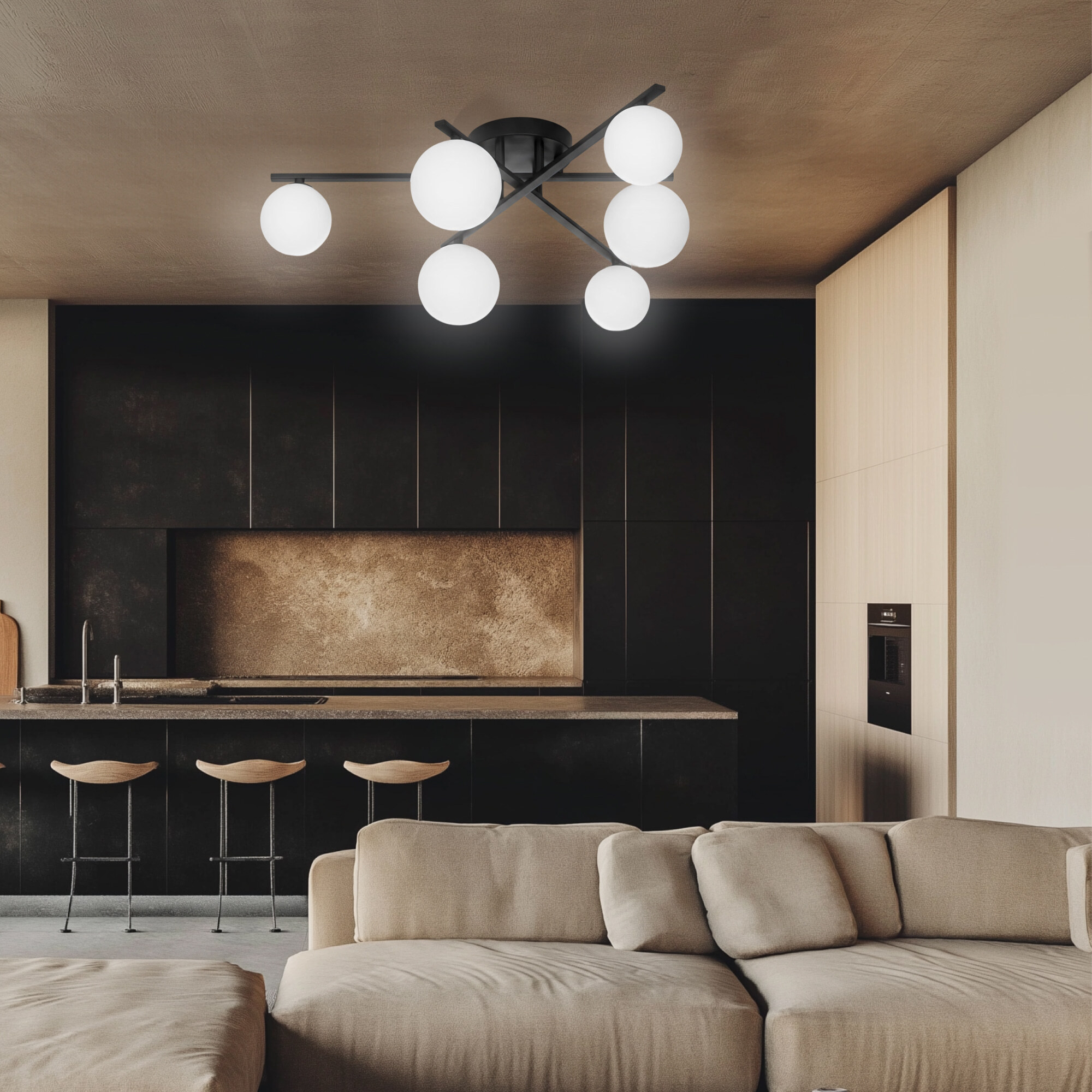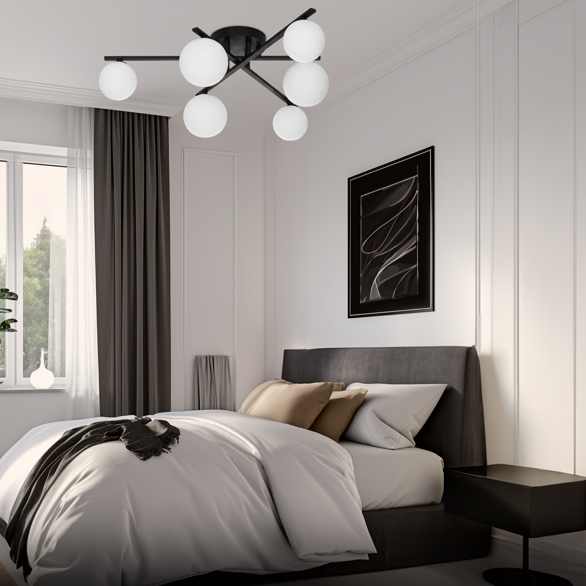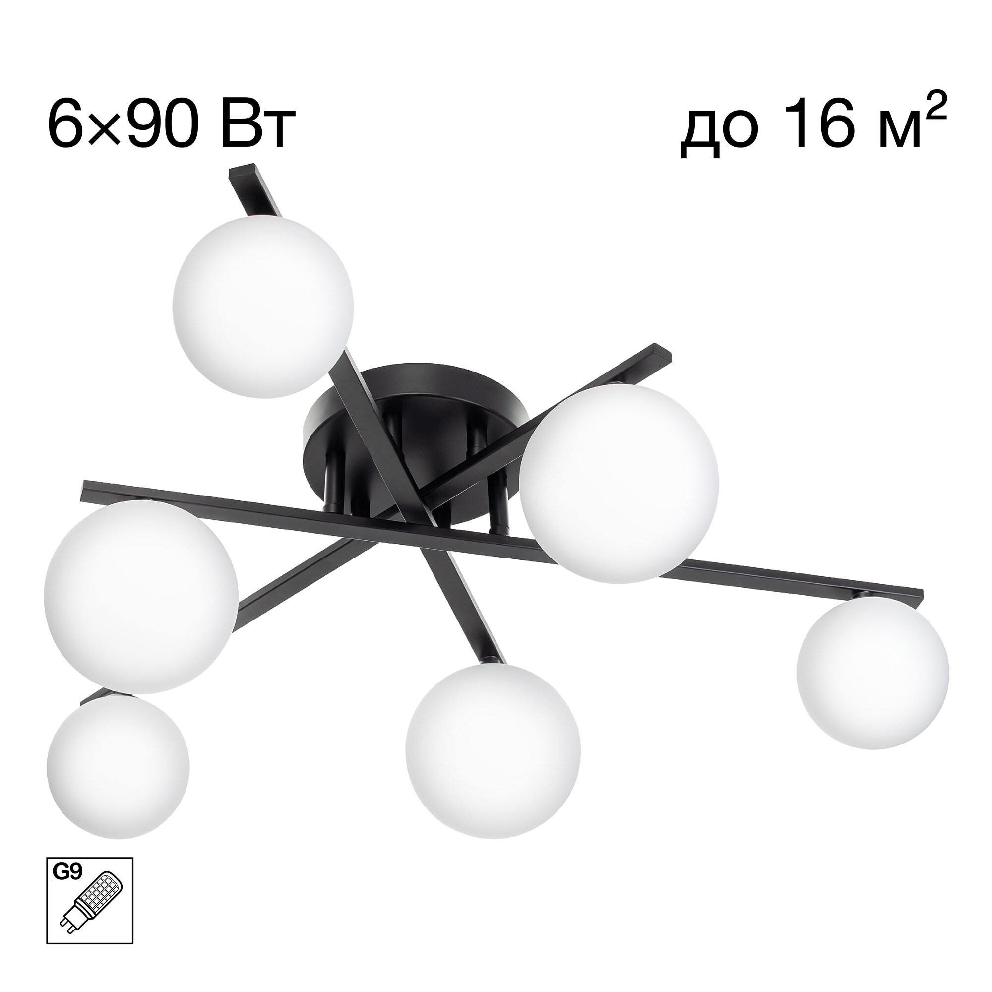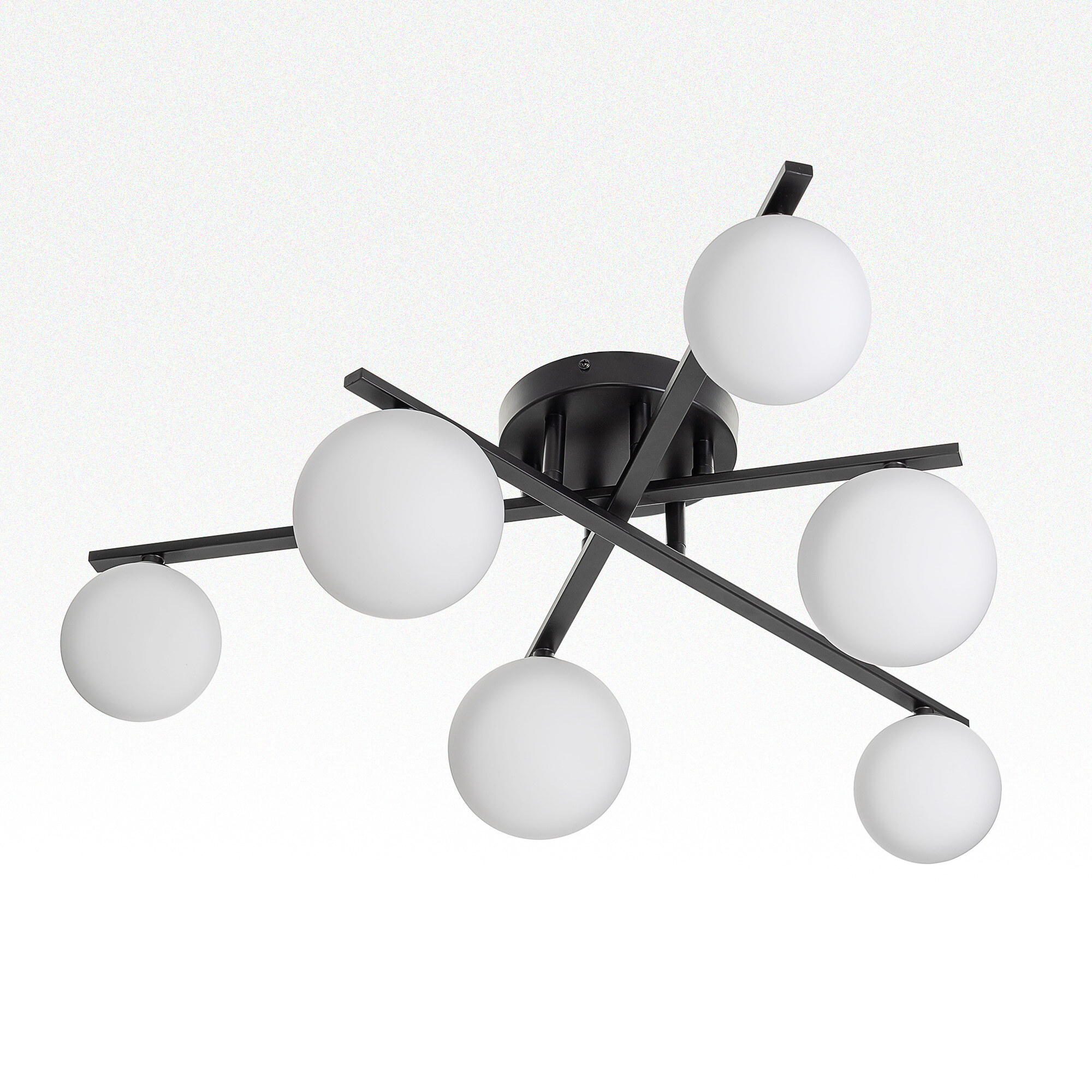Корпус люстры изготовлен из металлического сплава классического черного цвета. Плафоны-сферы из белого матового стекла разного диаметра попарно расположены на горизонтальных рожках-штангах. Плафоны имеют диаметр 10 и 13см, размещены симметрично относительно центра люстры. Форма, материал и расположение плафонов обеспечивают мягкий заливной свет, который равномерно распределяется по всему помещению.