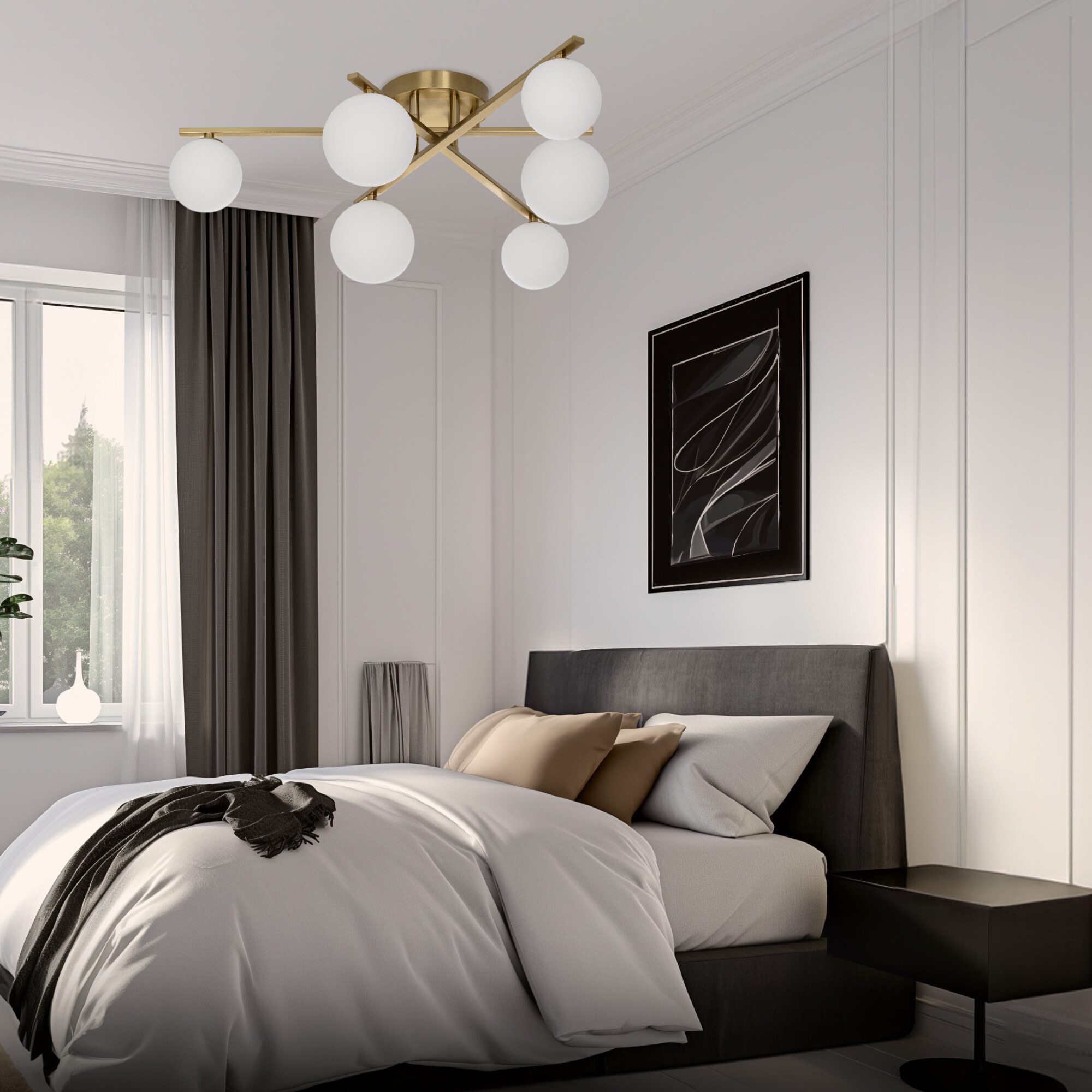 Корпус люстры изготовлен из металлического сплава стильного бронзового оттенка. Плафоны-сферы из белого матового стекла разного диаметра попарно расположены на горизонтальных рожках-штангах. Плафоны имеют диаметр 10 и 13см, размещены симметрично относительно центра люстры. Форма, материал и расположение плафонов обеспечивают мягкий заливной свет, который равномерно распределяется по всему помещению.