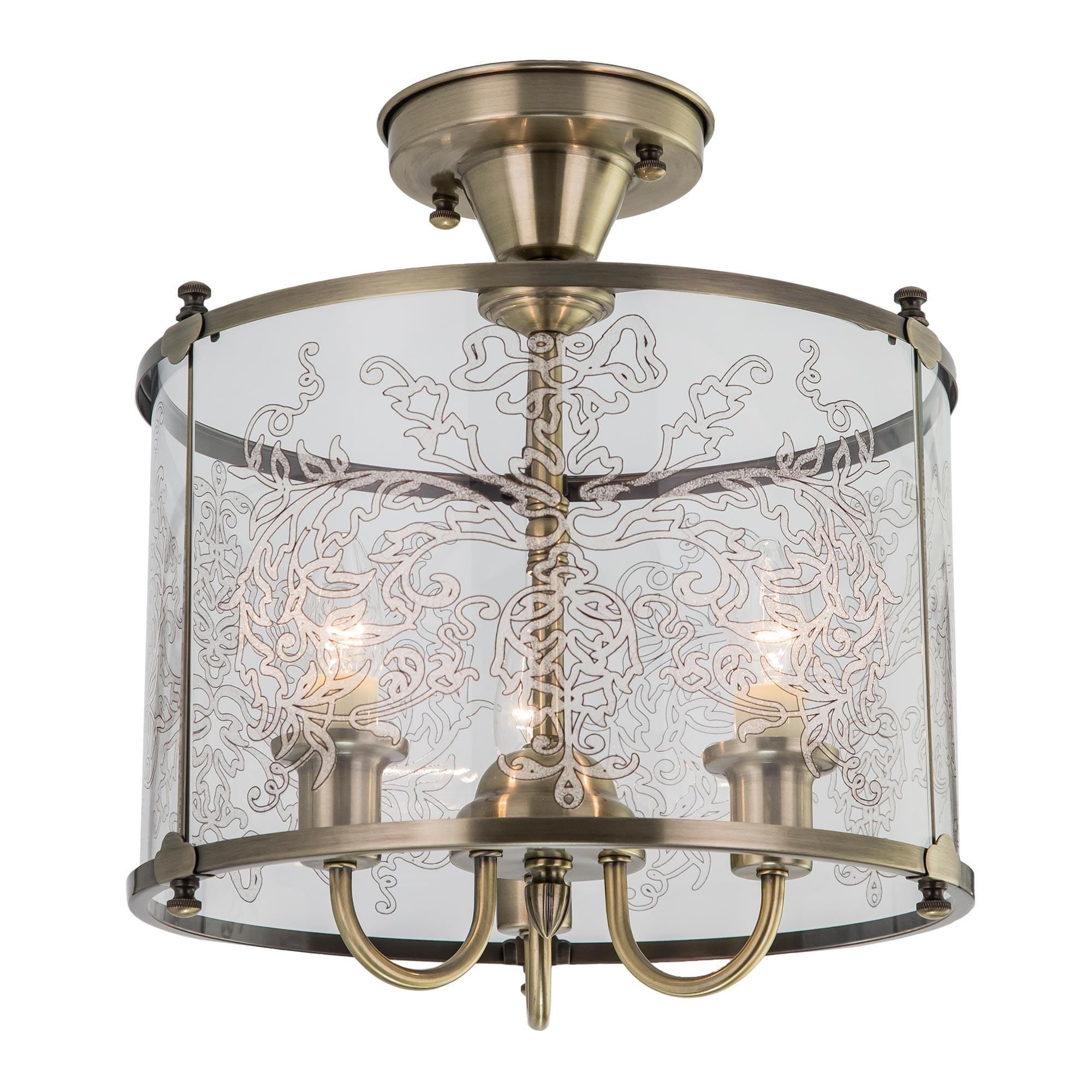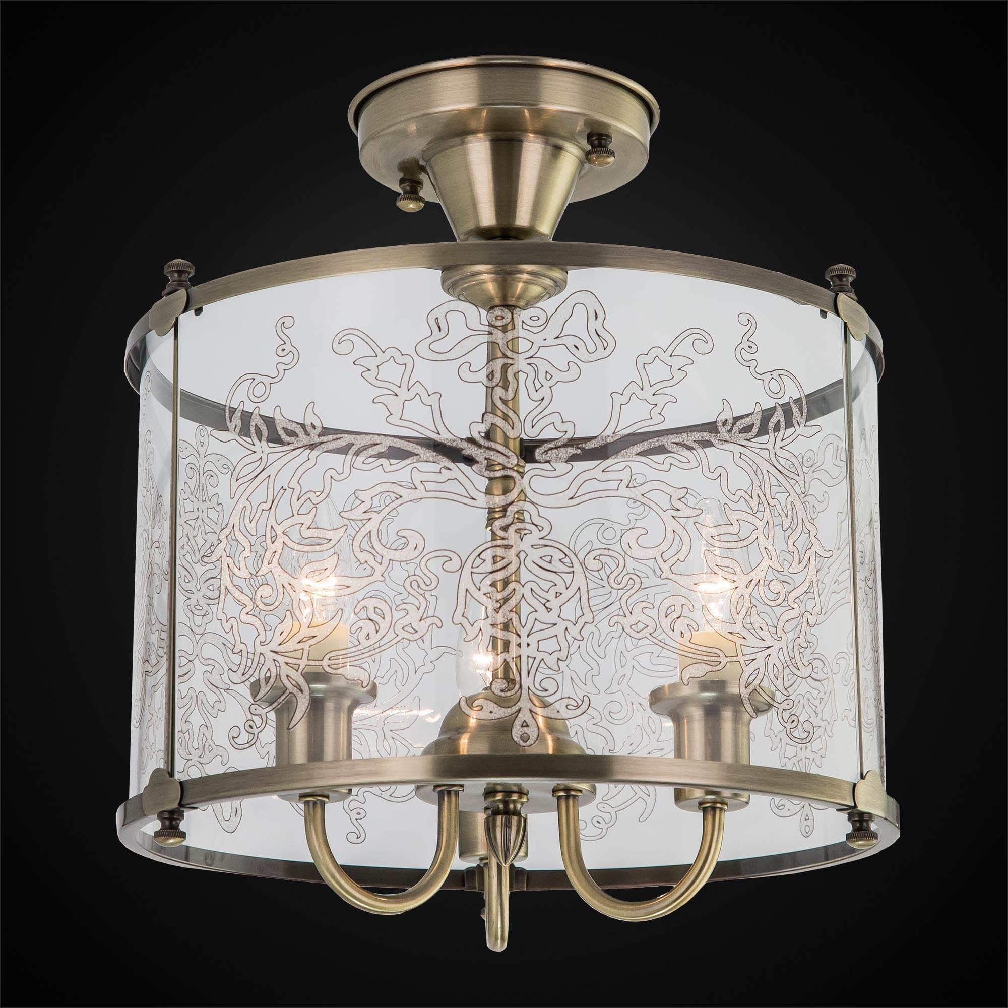 Утонченная потолочная люстра Citilux Versal CL408233 в классическом стиле. Каркас модели изготовлен из металлического сплава с покрытием благородного бронзового цвета. Плафон цилиндрической формы составлен из прозрачных стеклянных панелей, каждая из которых украшена симметричным двухцветным орнаментом.