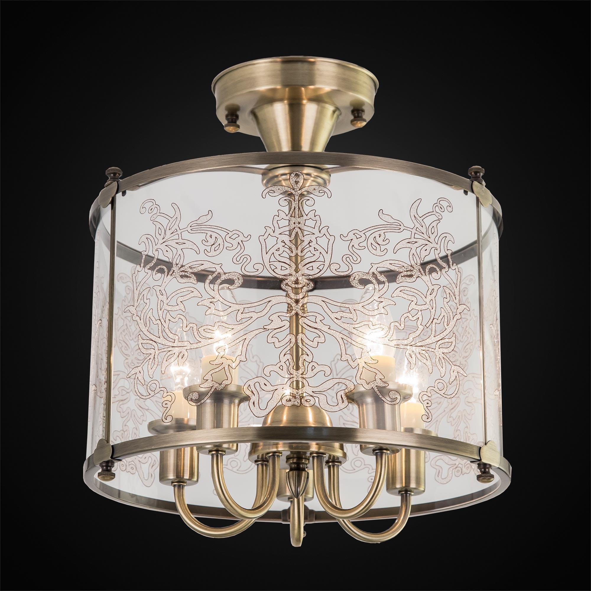 Утонченная потолочная люстра Citilux Versal CL408253 в классическом стиле. Каркас модели изготовлен из металлического сплава с покрытием благородного бронзового цвета. Плафон цилиндрической формы составлен из прозрачных стеклянных панелей, каждая из которых украшена симметричным двухцветным орнаментом.