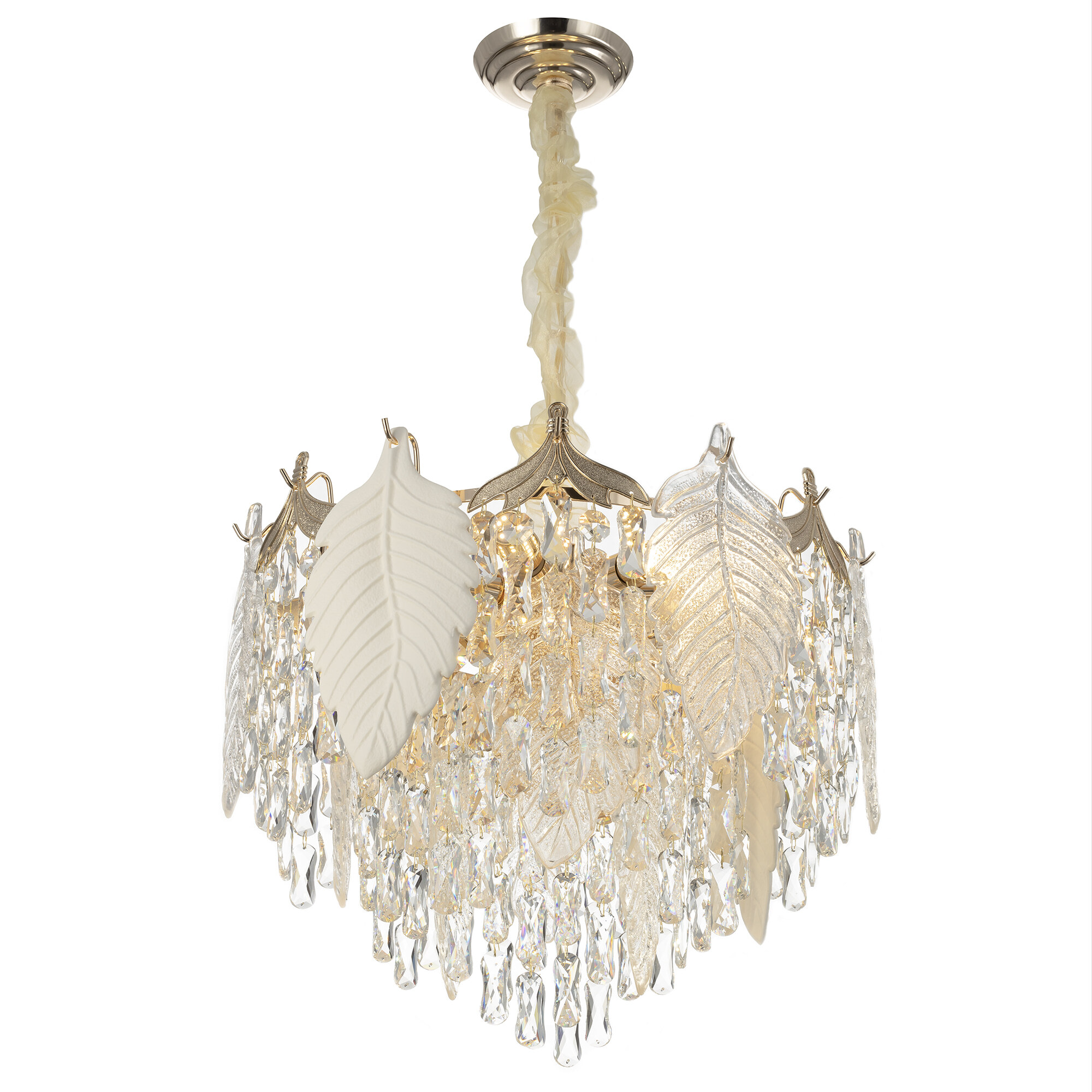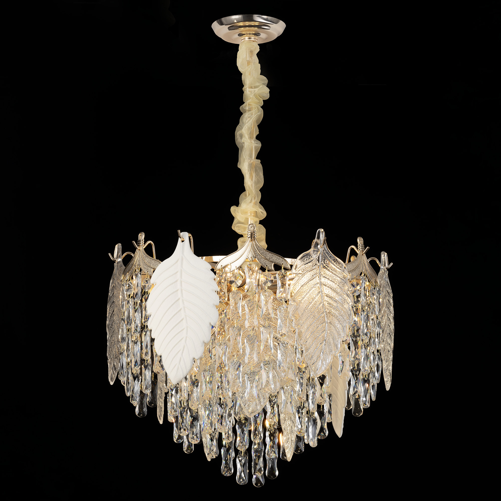 Шикарная подвесная люстра Citilux Darby CL309252 искусно украшена ниспадающим каскадом хрустальных подвесок и великолепно декорирована прекрасными стеклянными листьями. Корпус светильника металлический, благородного золотого оттенка. Этот удивительный образец красоты и элегантности станет настоящим украшением вашего интерьера.