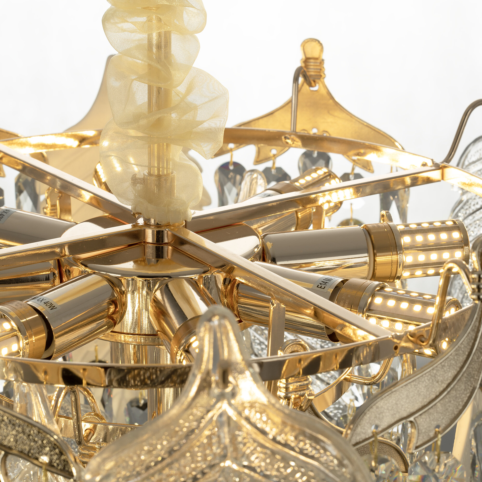 В изделии 10 ламп с цоколем Е14 максимальной мощностью для ламп накаливания 40Вт (в комплекте LED лампы мощностью 7Вт и цветовой температурой 3000К). Подходит для всех видов потолков, в том числе натяжных, тип крепления – планка.