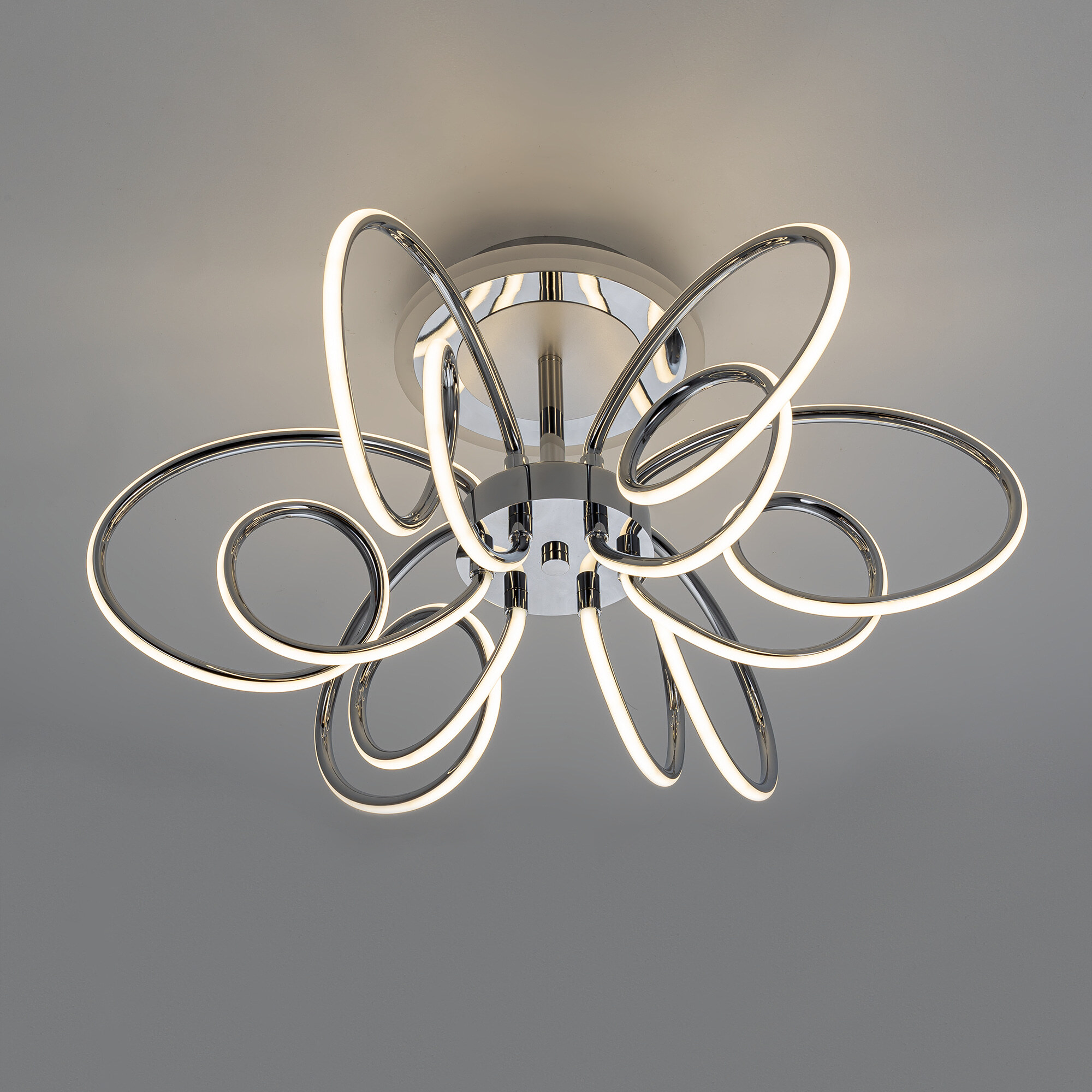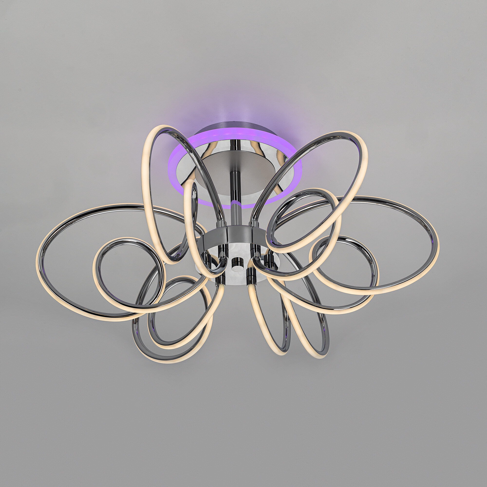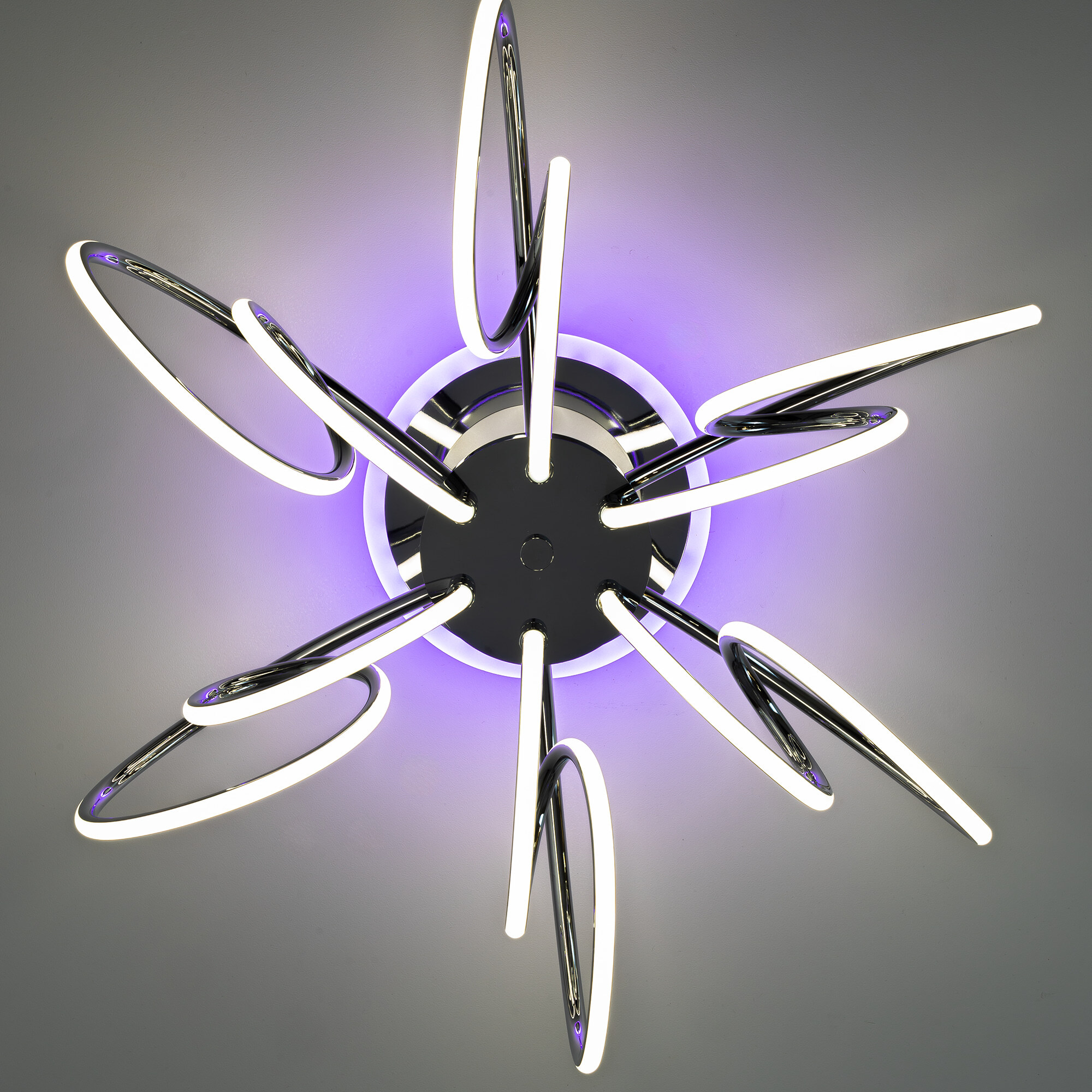 Элегантная потолочная люстра с изящно изогнутыми рожками оснащена независимой красочной RGB подсветкой основания с разными режимами работы и плавной регулировкой яркости.
