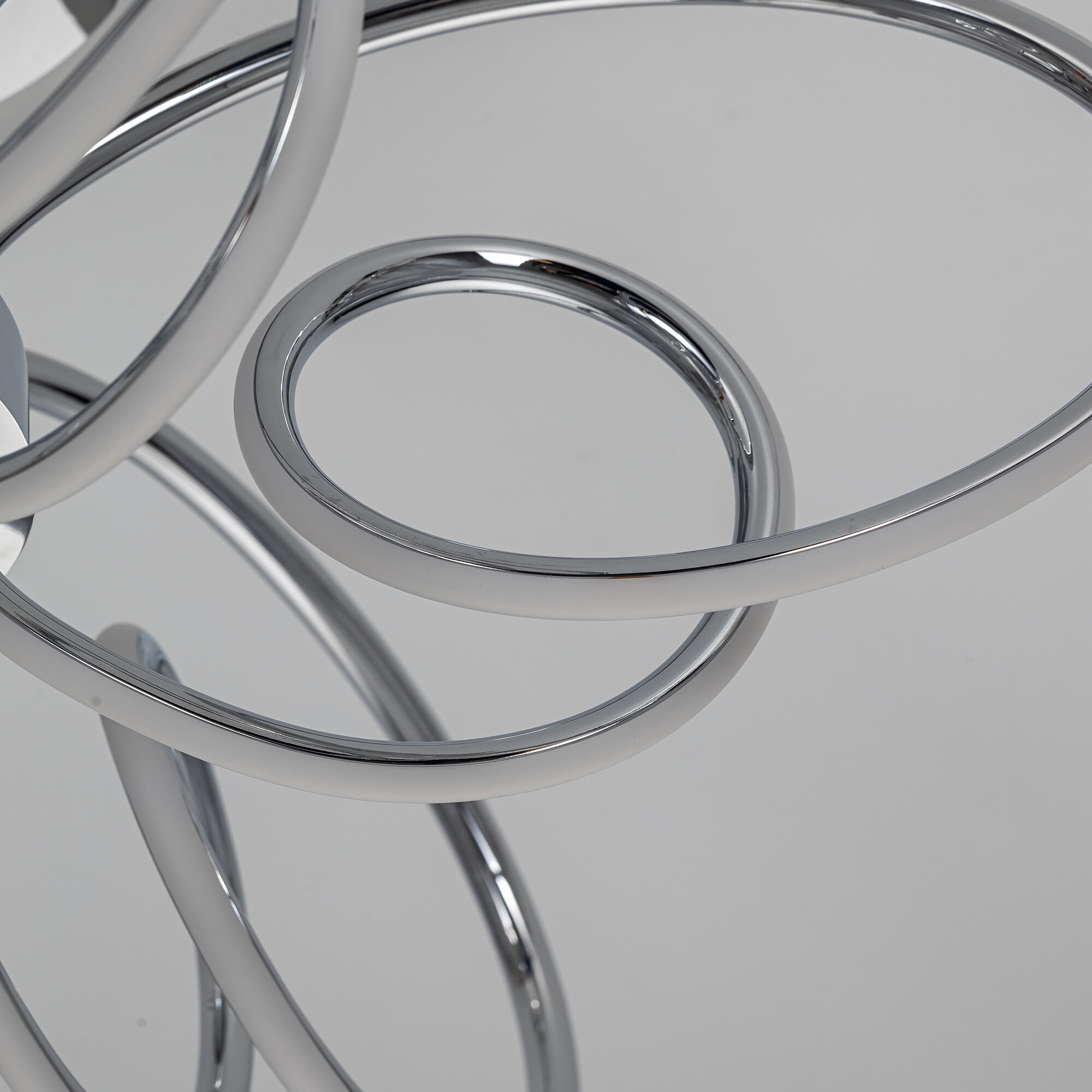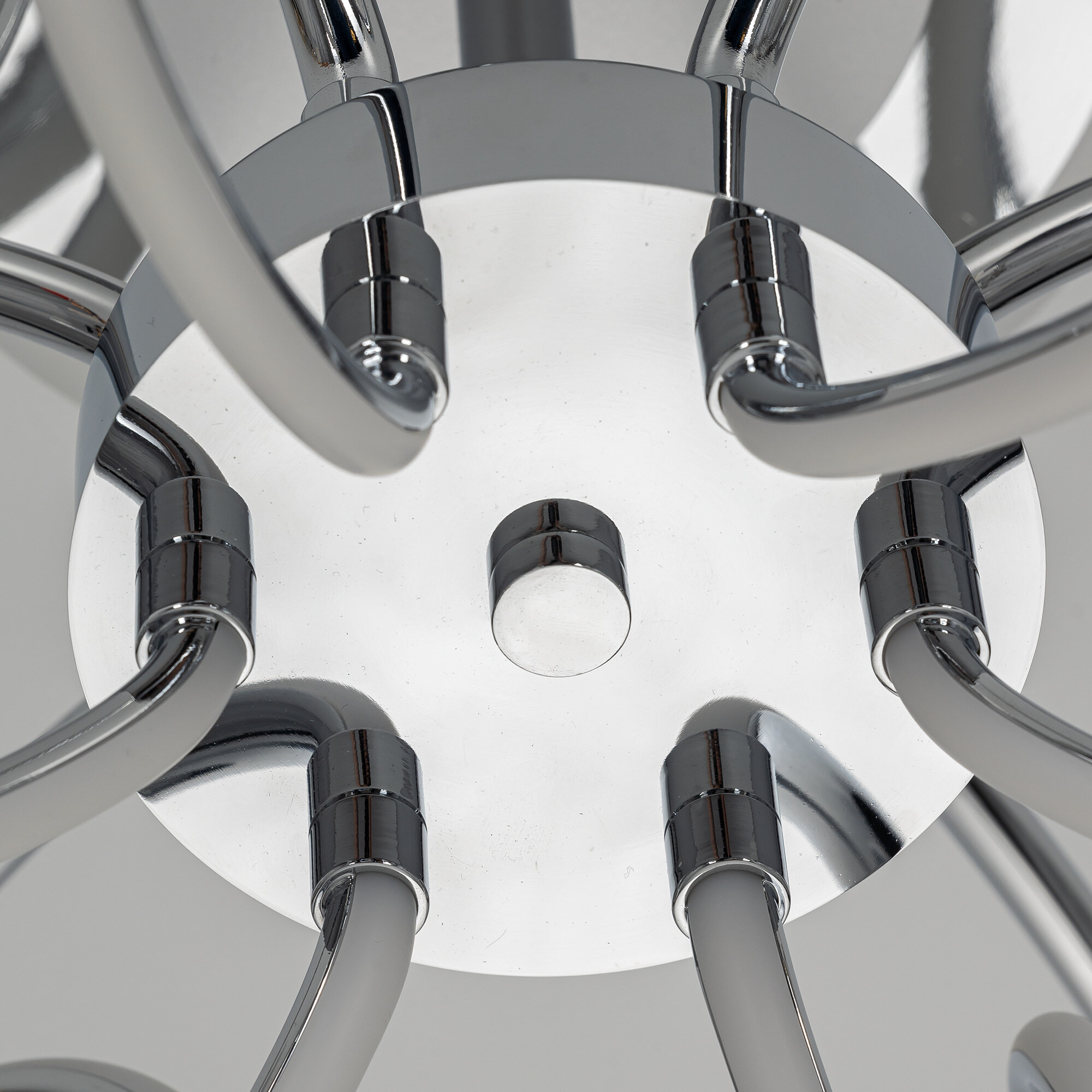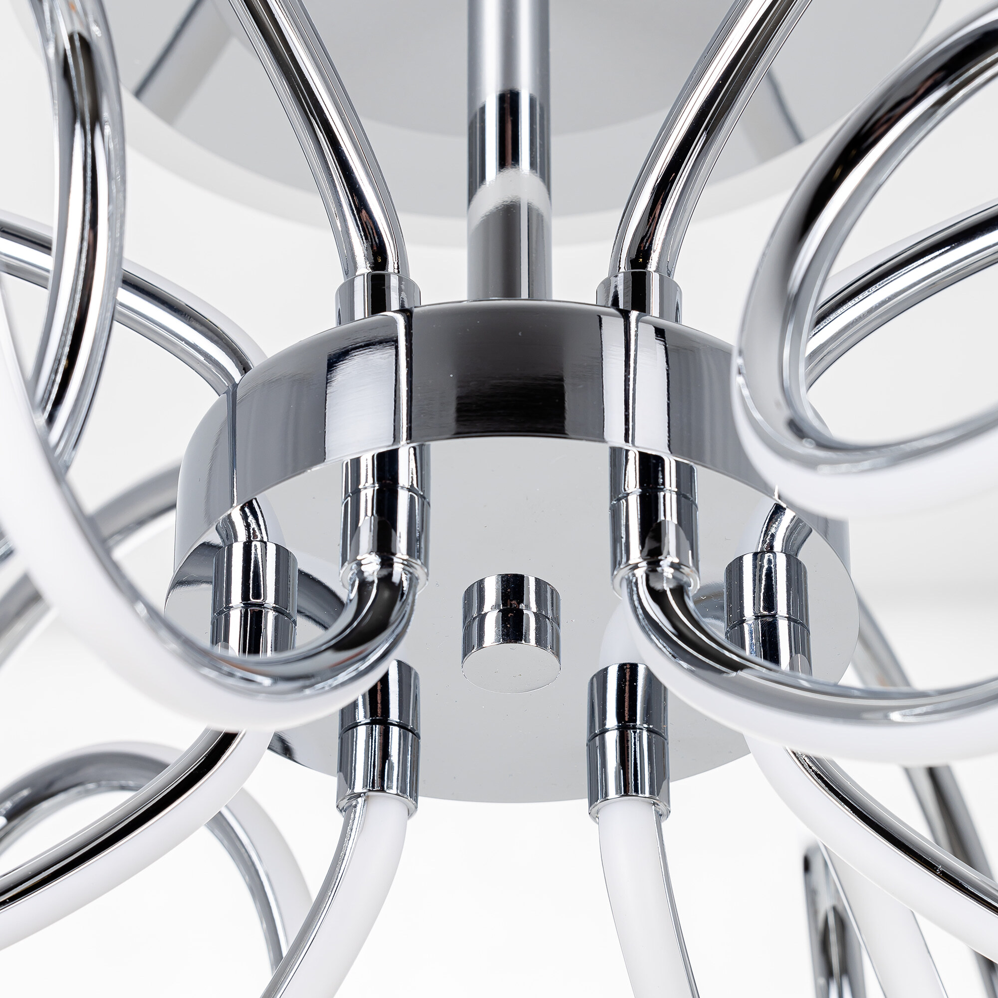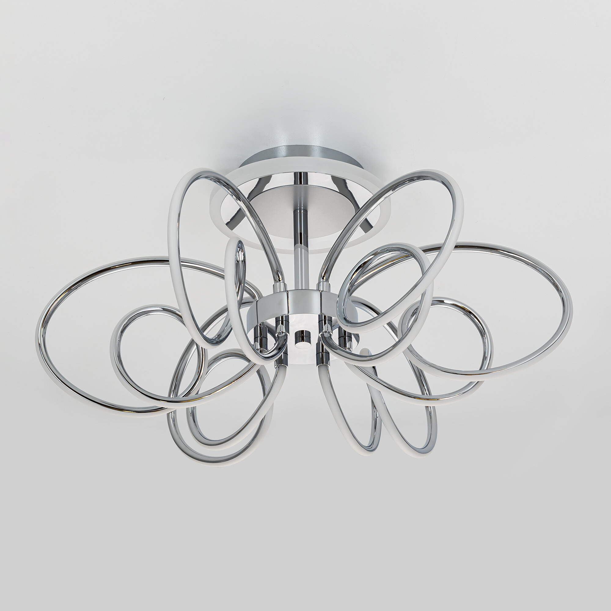 Элегантная потолочная люстра с изящно изогнутыми рожками оснащена независимой красочной RGB подсветкой основания с разными режимами работы и плавной регулировкой яркости.
