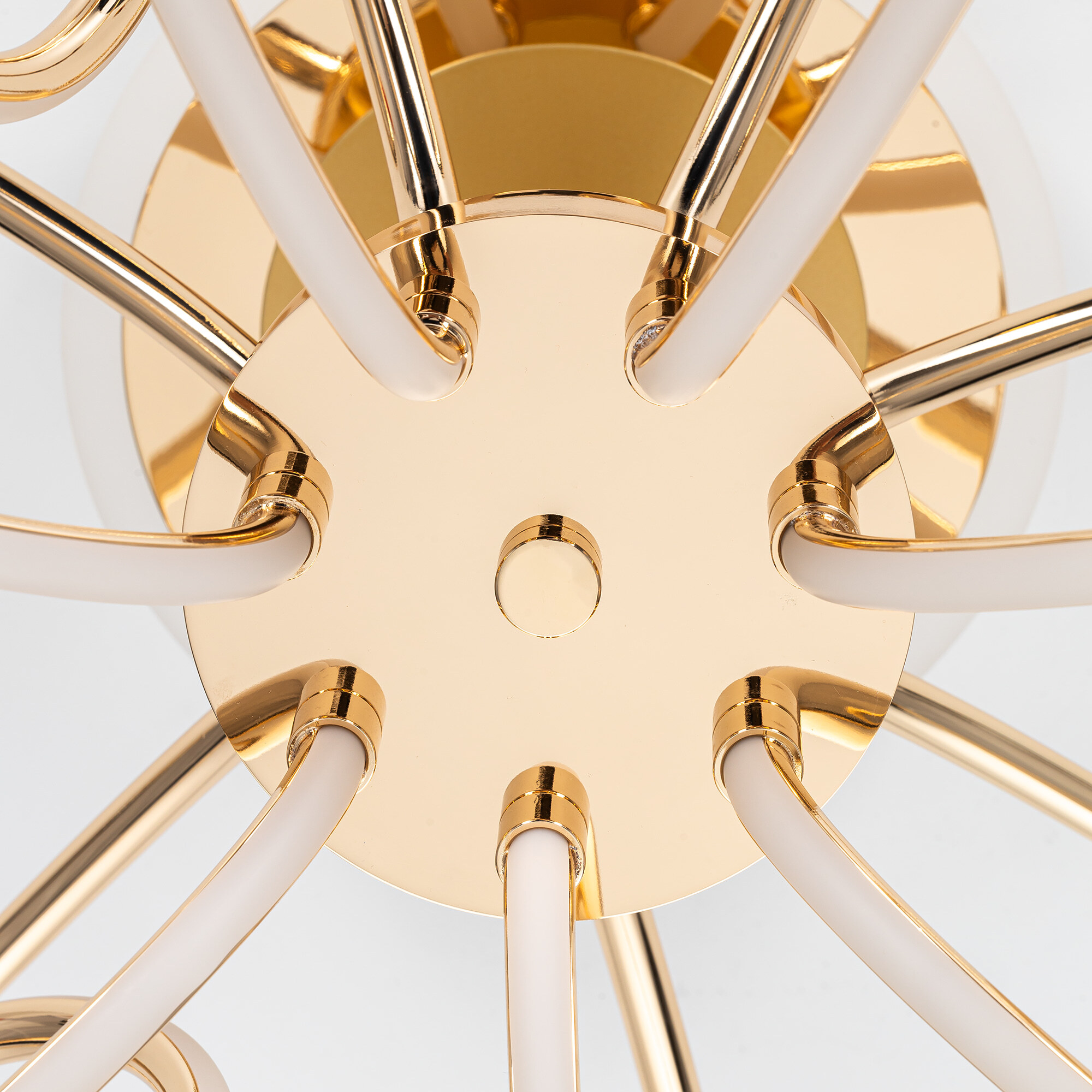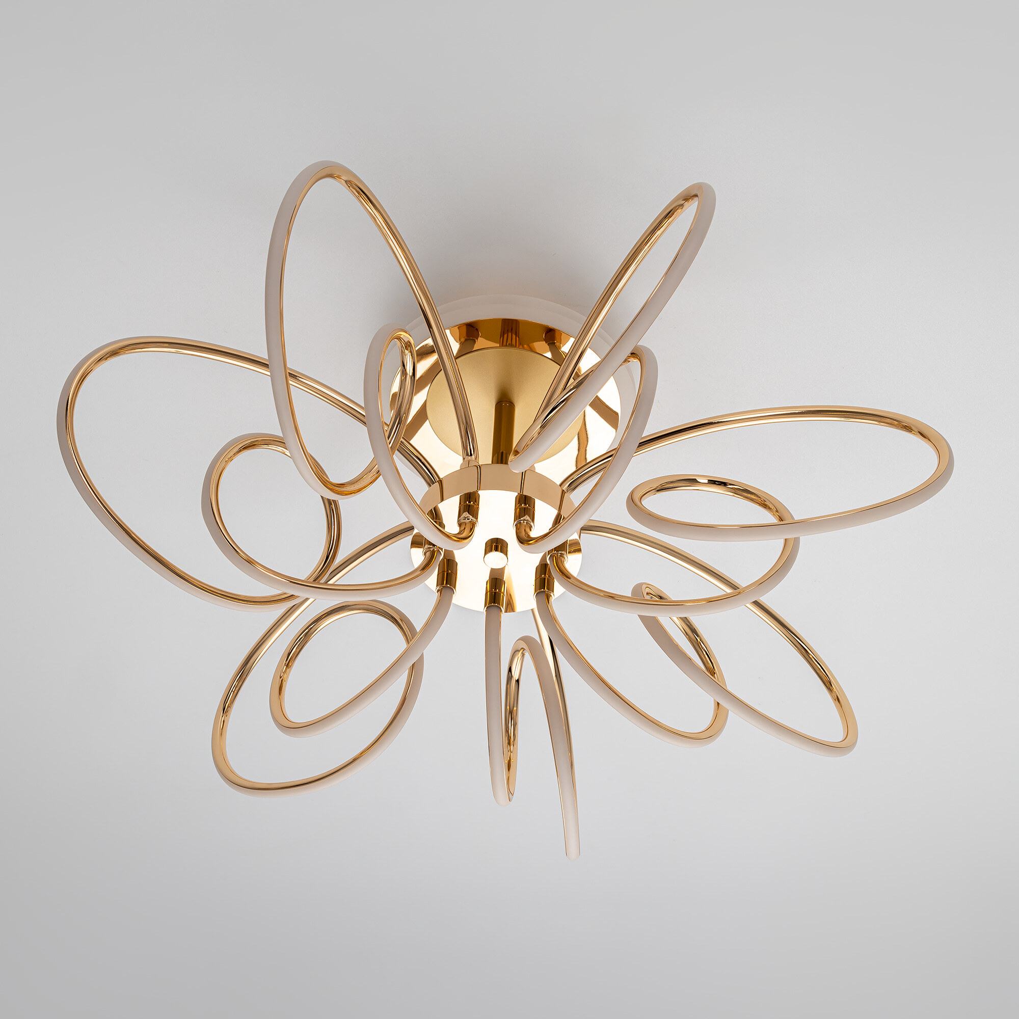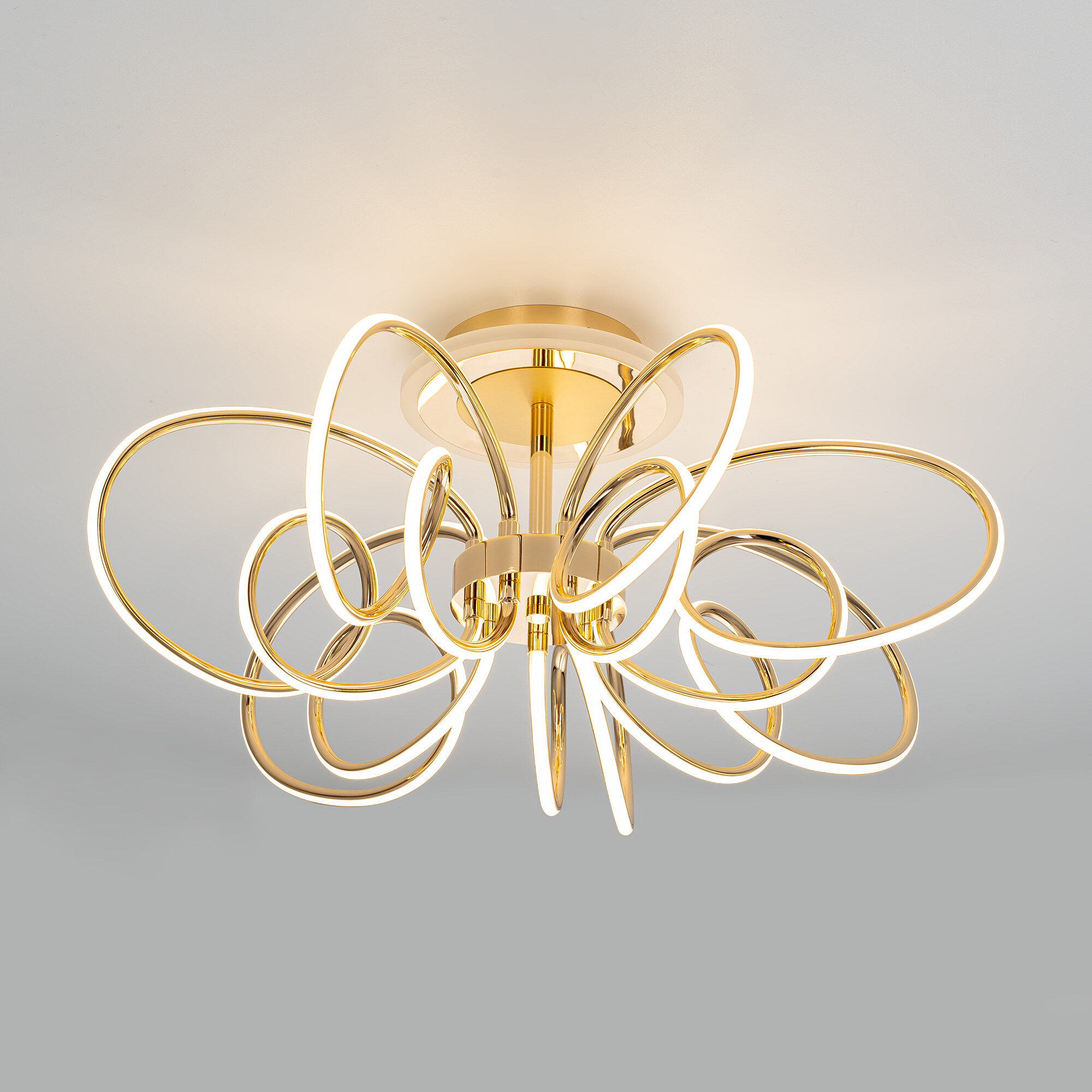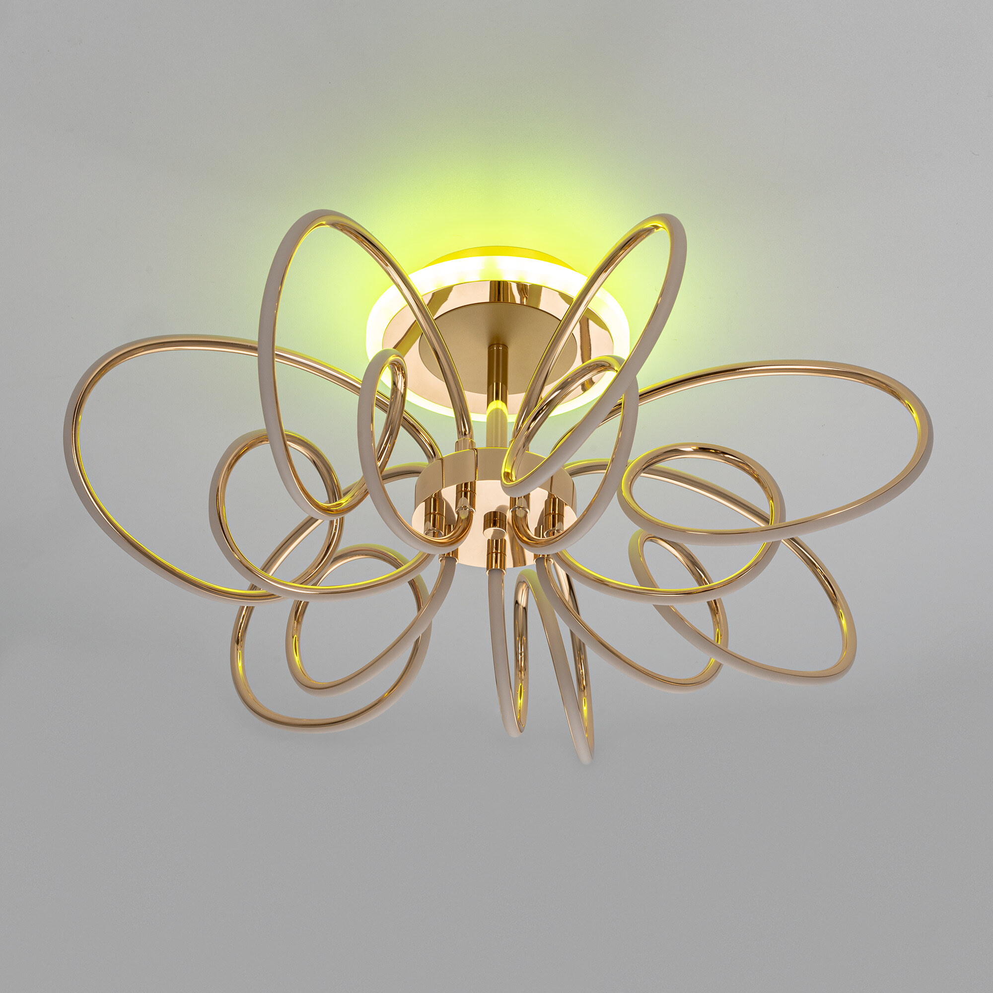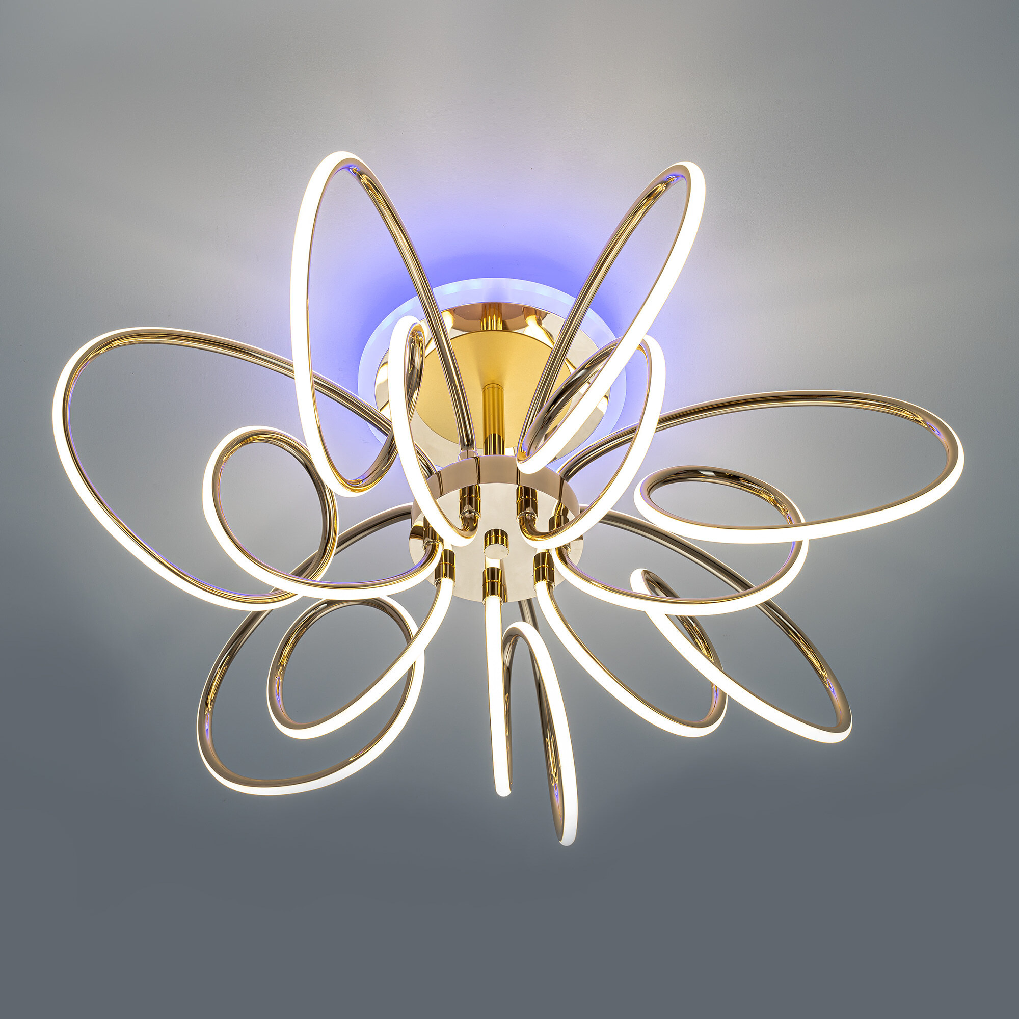 Элегантная потолочная люстра с изящно изогнутыми рожками оснащена независимой красочной RGB подсветкой основания с разными режимами работы и плавной регулировкой яркости.