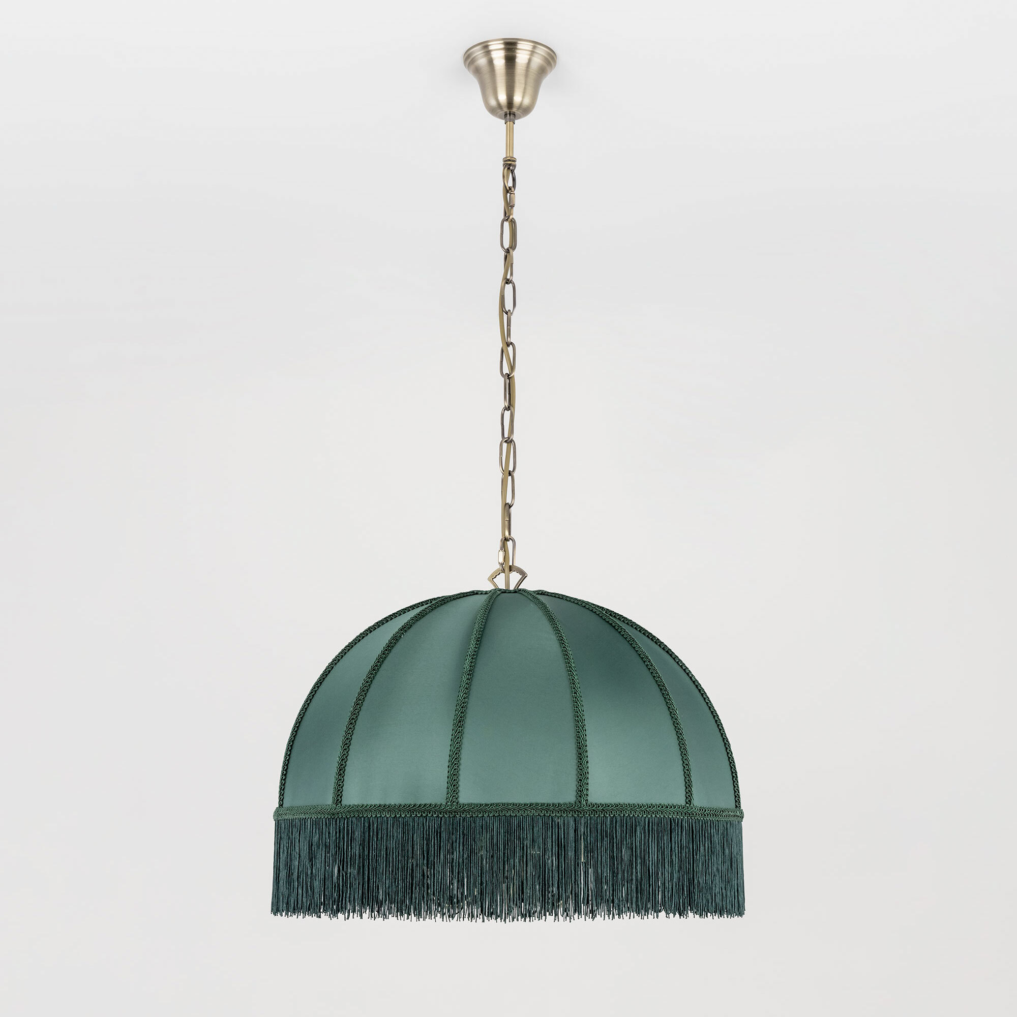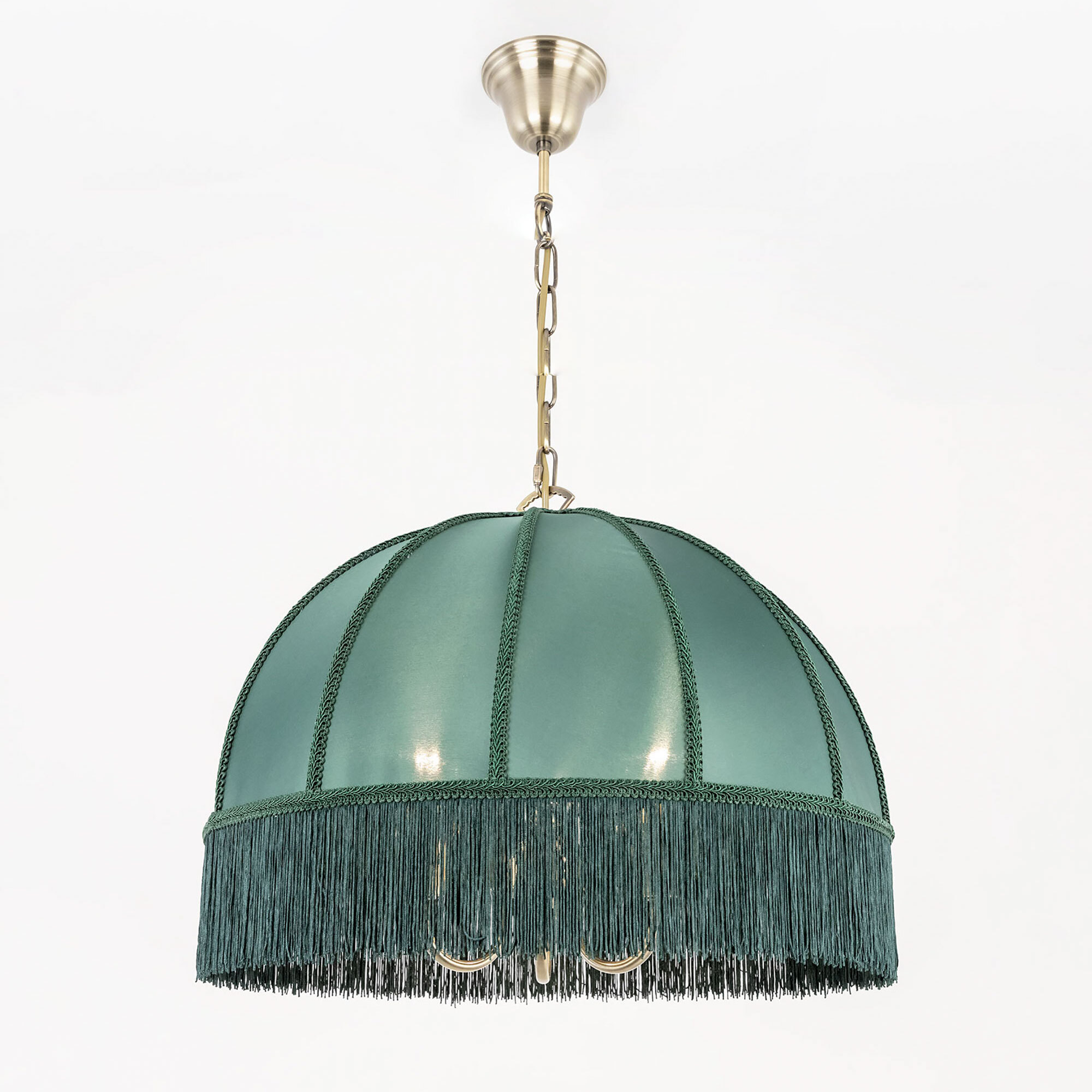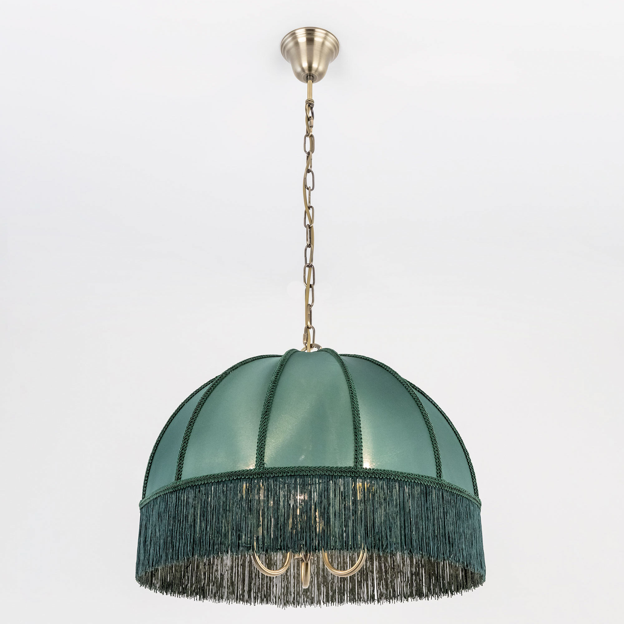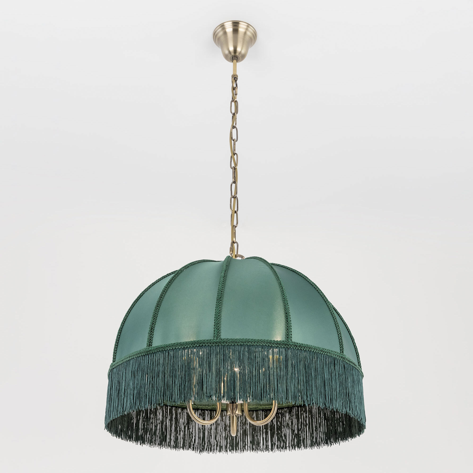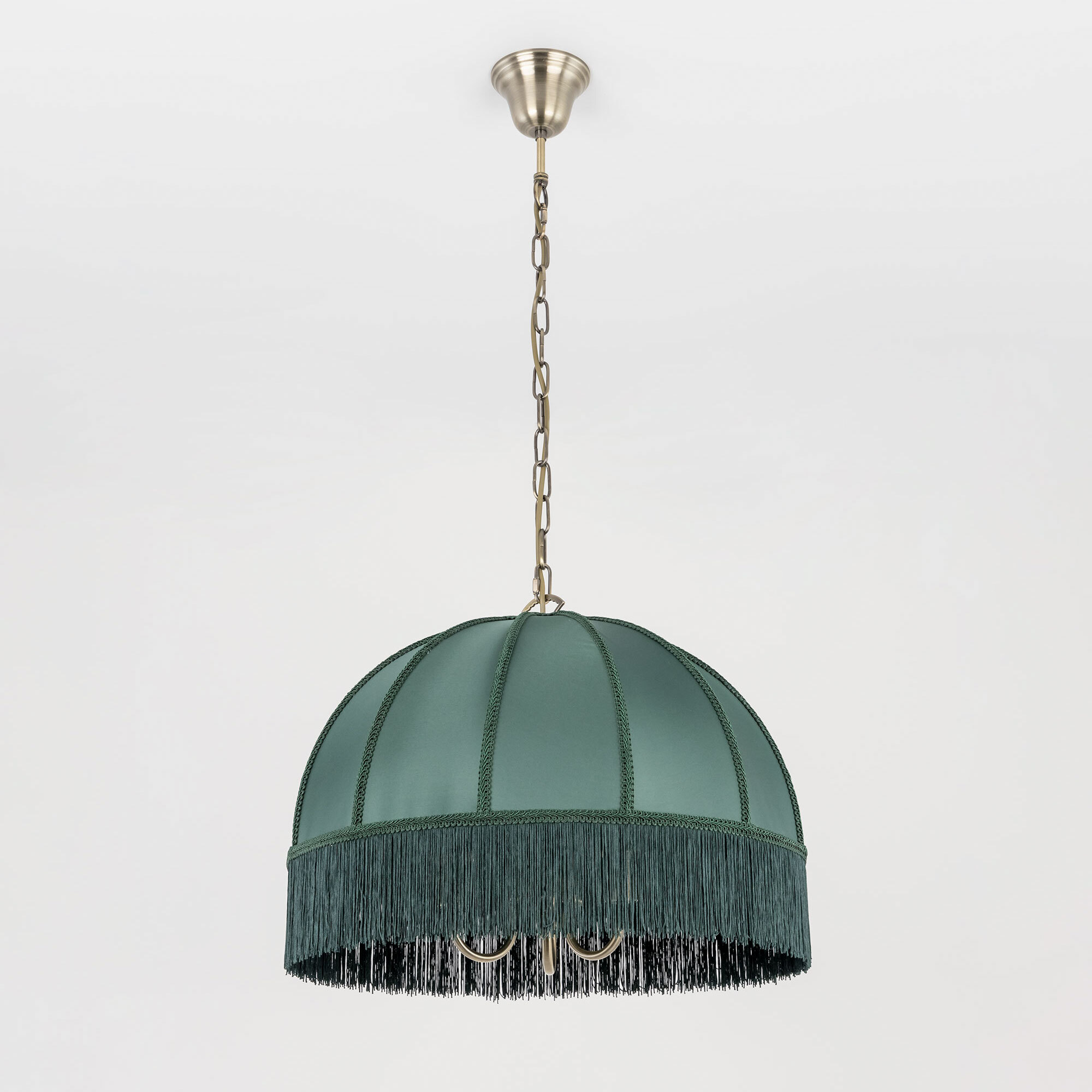 Подвесная трёхрожковая люстра на цепи Citilux Базель CL407132 с классическим абажуром. Корпус светильника металлический, цвет бронза. Абажур тканевый, зелёного цвета, декорирован бахромой и ажурной тесьмой. Модель подойдёт для освещения уютной гостиной, кухни или веранды в загородном доме или на даче. Поможет создать комфортную атмосферу в кафе и ресторане, великолепно выглядит над столом. Подходит для всех типов потолков, в том числе натяжных, тип крепления – крючок. В изделии используются лампы с цоколем Е14, максимальной мощностью для ламп накаливания 60Вт, светодиодные лампы можно устанавливать более яркие. Высота регулируется от 50 до 135см, диаметр 51см, осветит около 9м².