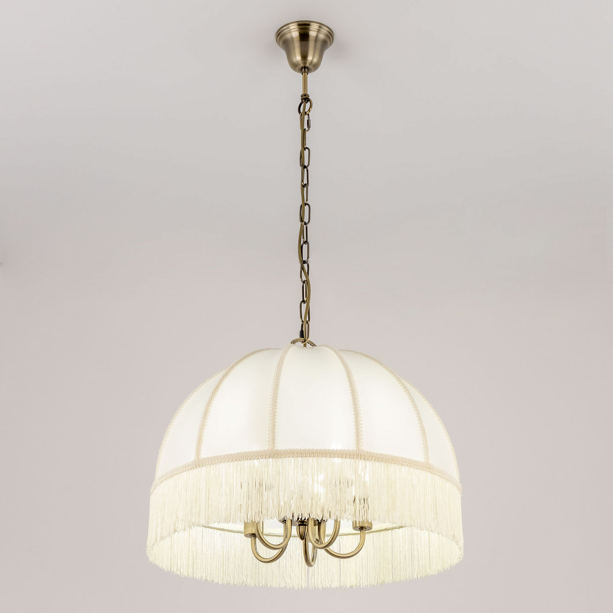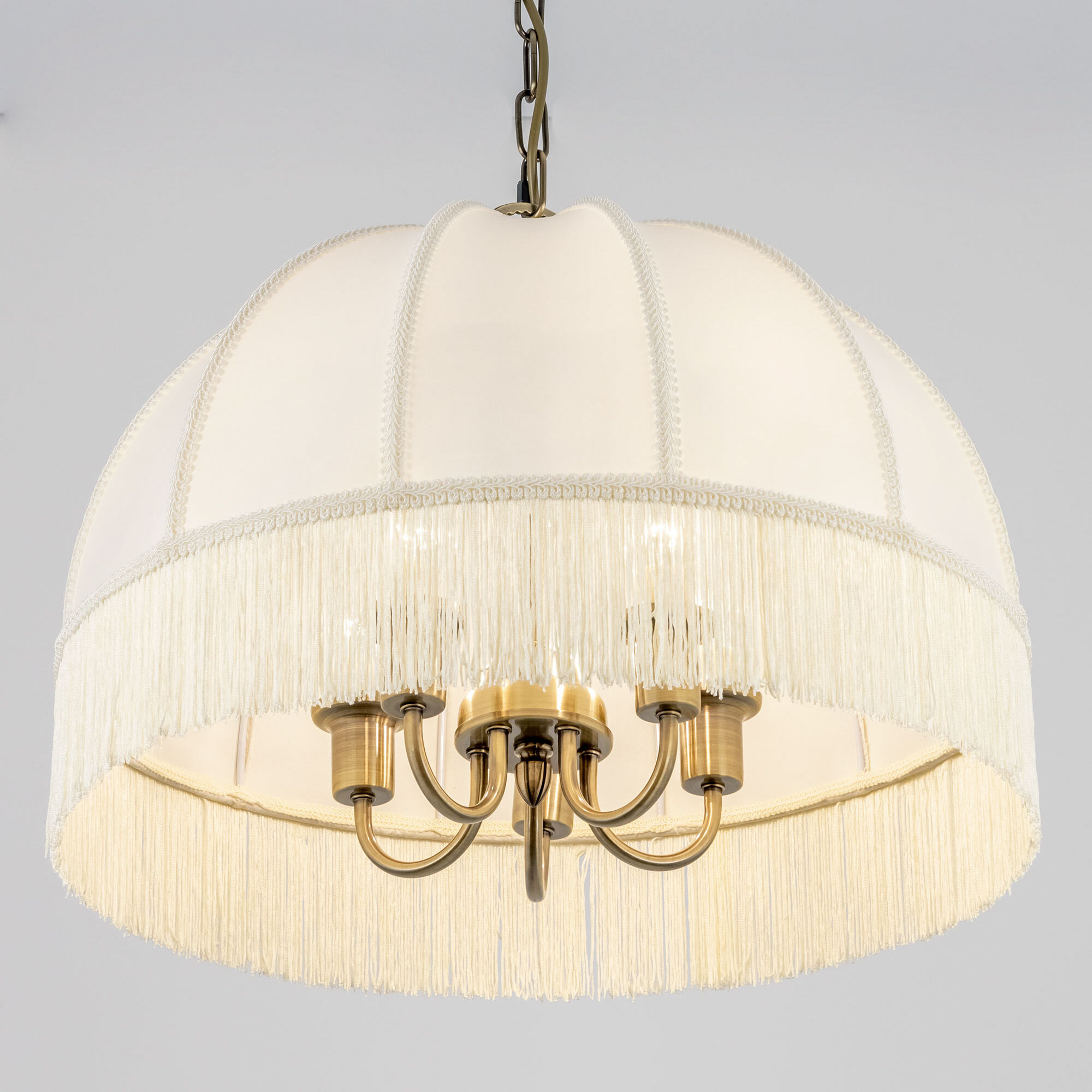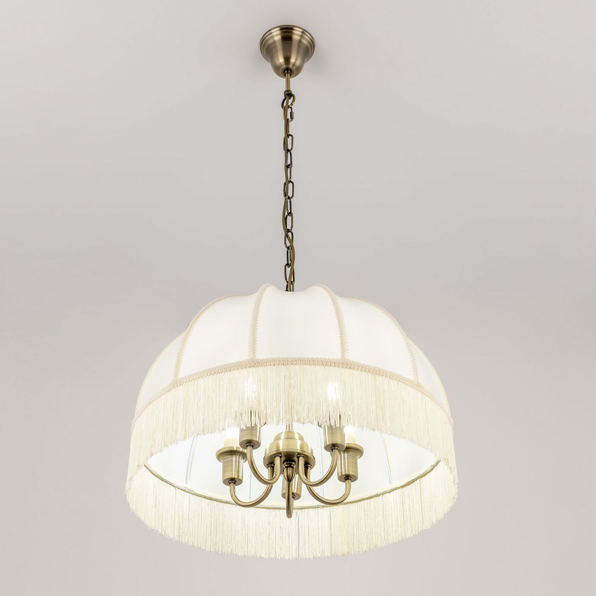 Подвесная пятирожковая люстра на цепи Citilux Базель CL407151 с классическим абажуром. Корпус светильника металлический, цвет бронза. Абажур тканевый, цвет кремовый, декорирован бахромой и ажурной тесьмой. Модель подойдёт для освещения уютной гостиной, кухни или веранды в загородном доме или на даче. Поможет создать комфортную атмосферу в кафе и ресторане, великолепно выглядит над столом. Подходит для всех типов потолков, в том числе натяжных, тип крепления – крючок. В изделии используются лампы с цоколем Е14, максимальной мощностью для ламп накаливания 60Вт, светодиодные лампы можно устанавливать более яркие. Высота регулируется от 50 до 135см, диаметр 51см, осветит около 14м².