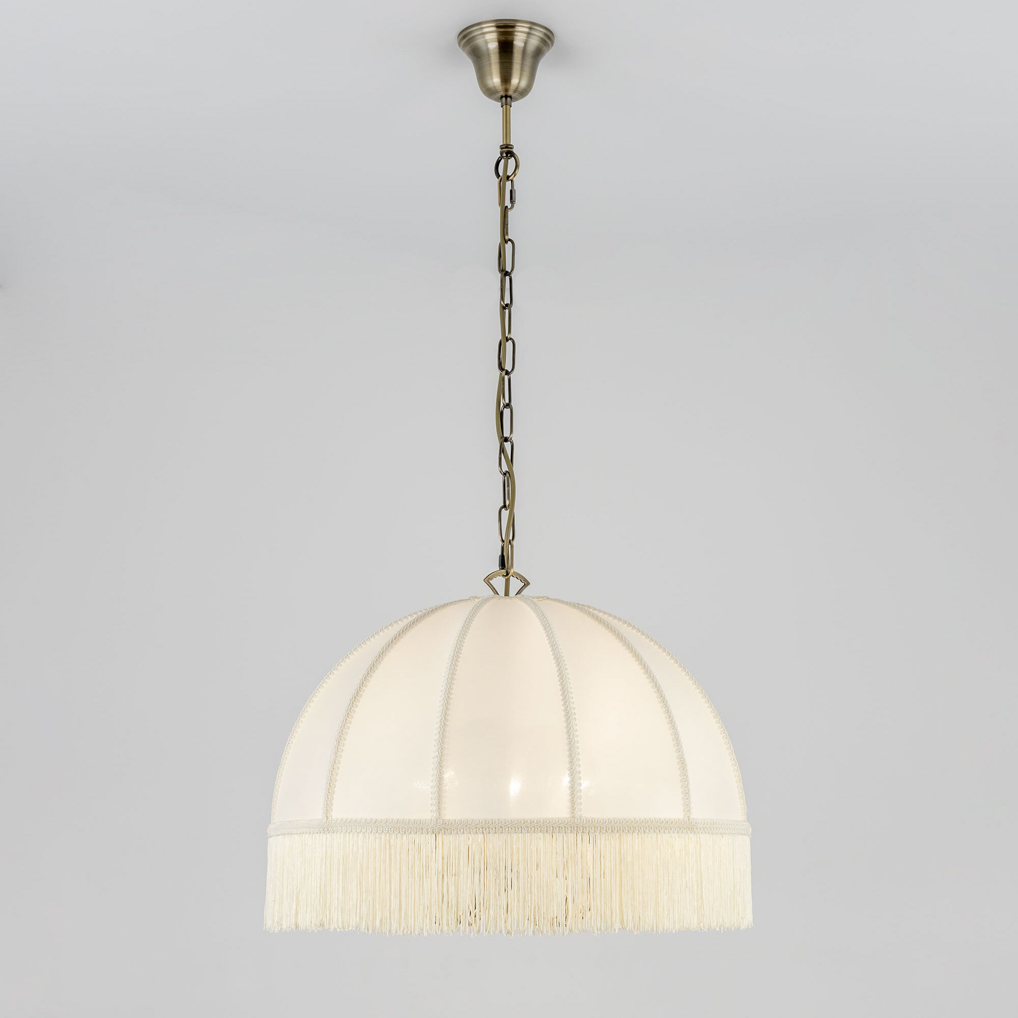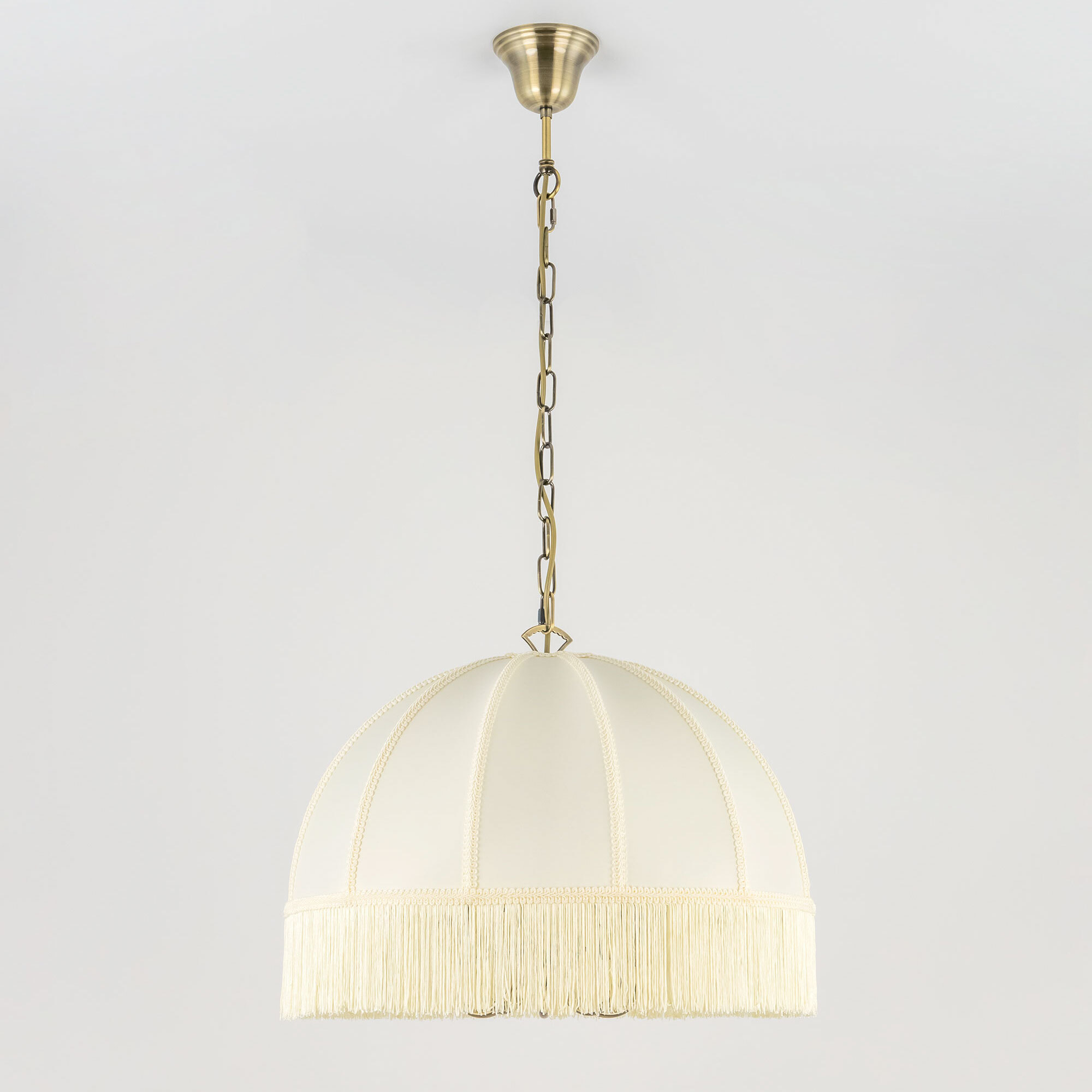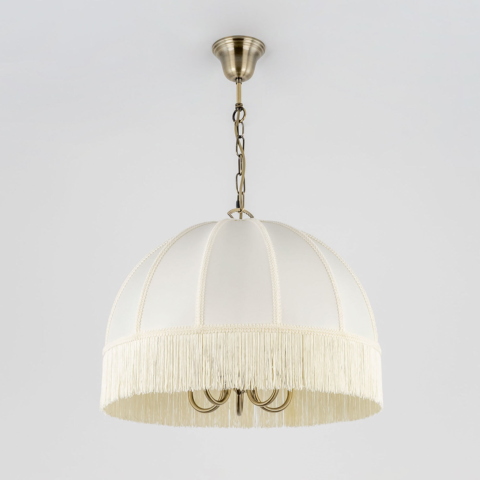 Подвесная пятирожковая люстра на цепи Citilux Базель CL407151 с классическим абажуром. Корпус светильника металлический, цвет бронза. Абажур тканевый, цвет кремовый, декорирован бахромой и ажурной тесьмой. Модель подойдёт для освещения уютной гостиной, кухни или веранды в загородном доме или на даче. Поможет создать комфортную атмосферу в кафе и ресторане, великолепно выглядит над столом. Подходит для всех типов потолков, в том числе натяжных, тип крепления – крючок. В изделии используются лампы с цоколем Е14, максимальной мощностью для ламп накаливания 60Вт, светодиодные лампы можно устанавливать более яркие. Высота регулируется от 50 до 135см, диаметр 51см, осветит около 14м².