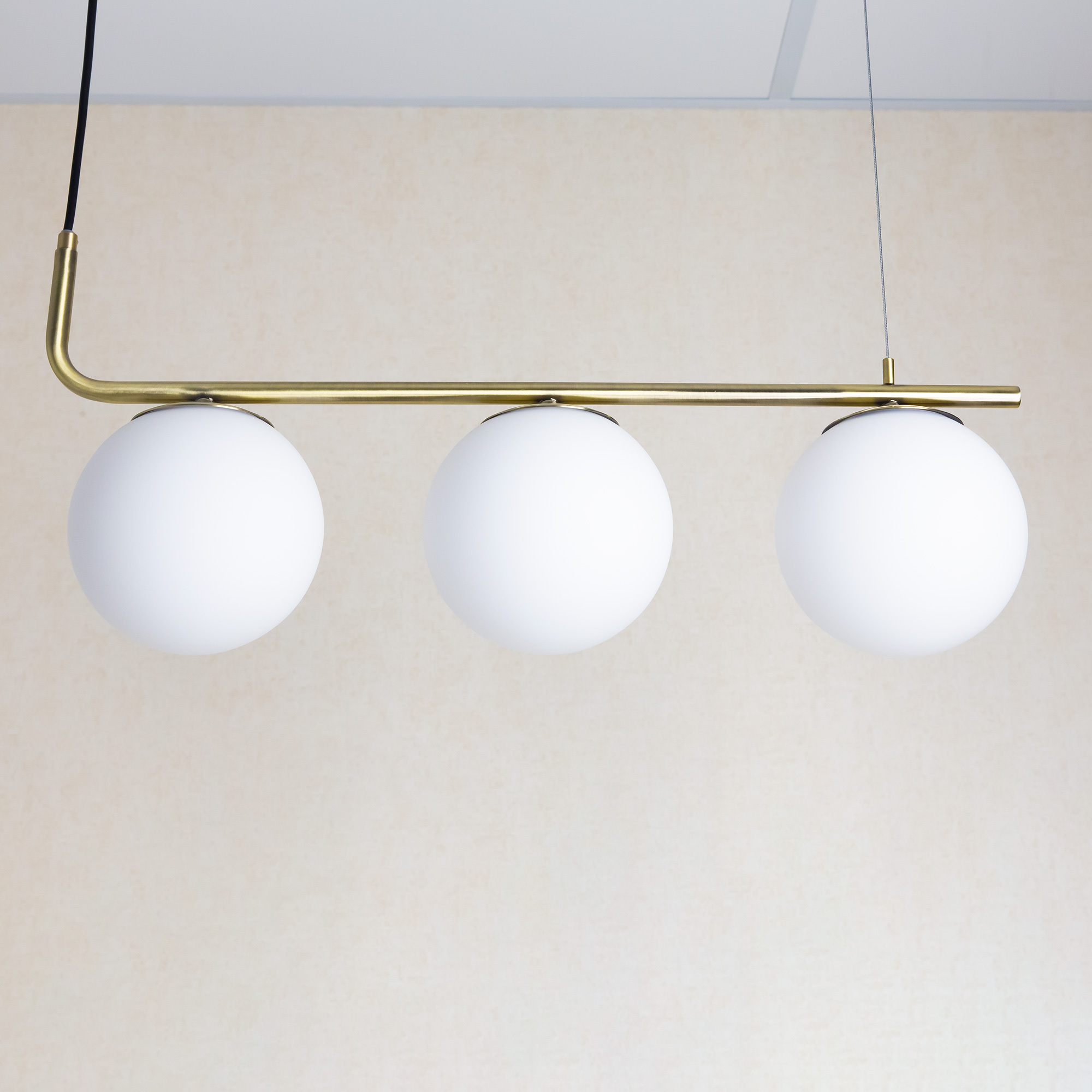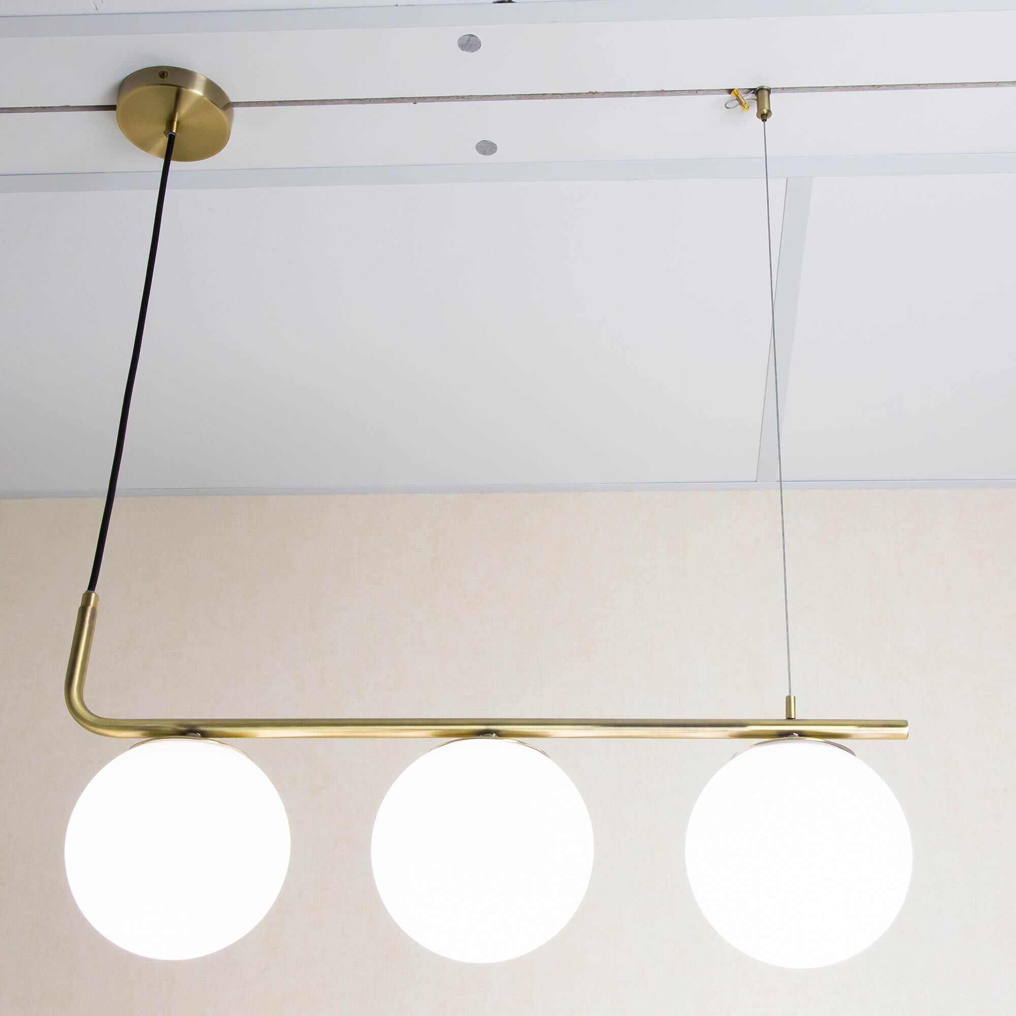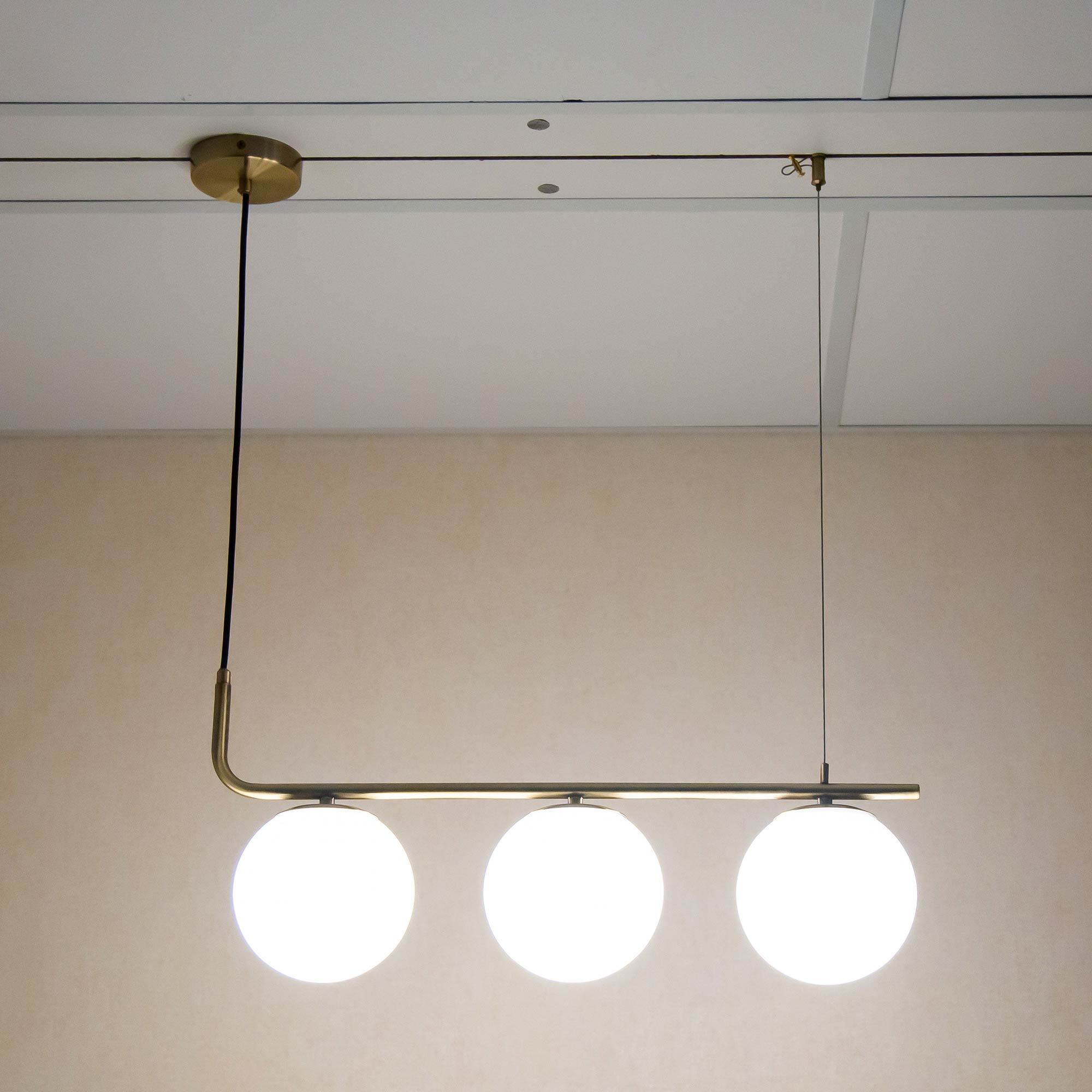 Подвесная люстра Citilux Бремен CL112133 выполнена в современном стиле, с горизонтально штангой и тремя стеклянными плафонами-шарами. В изделии используются лампы с цоколем Е27 максимальной мощностью для ламп накаливания 20Вт (в комплект не входят, приобретаются отдельно). Светодиодные лампы можно устанавливать более яркие. Длина светильника 60см, высота легко регулируется при установке в диапазоне от 30 до 90см.