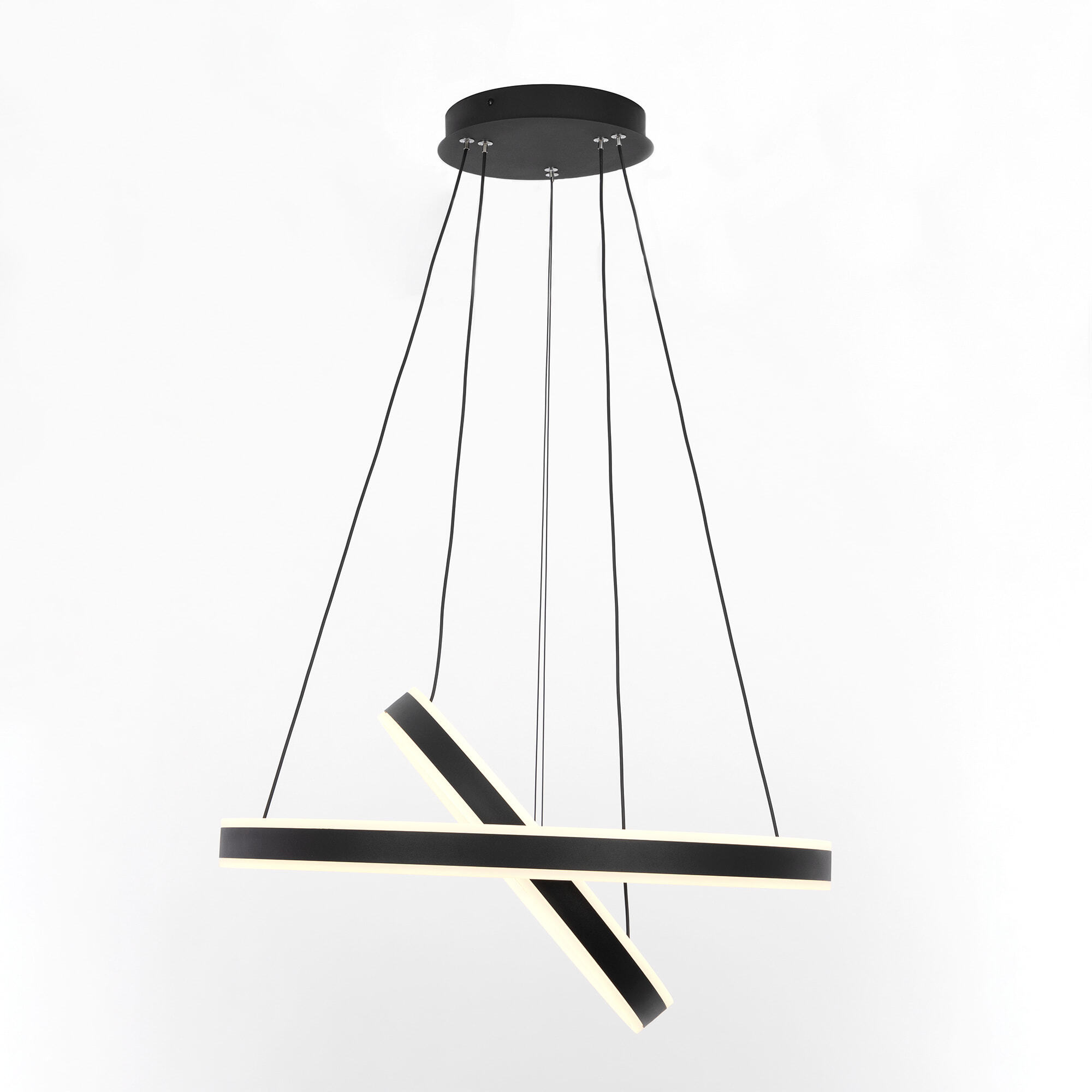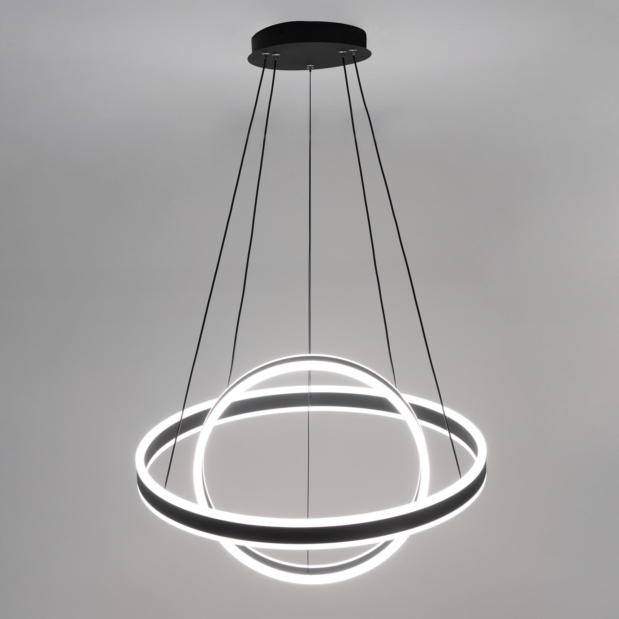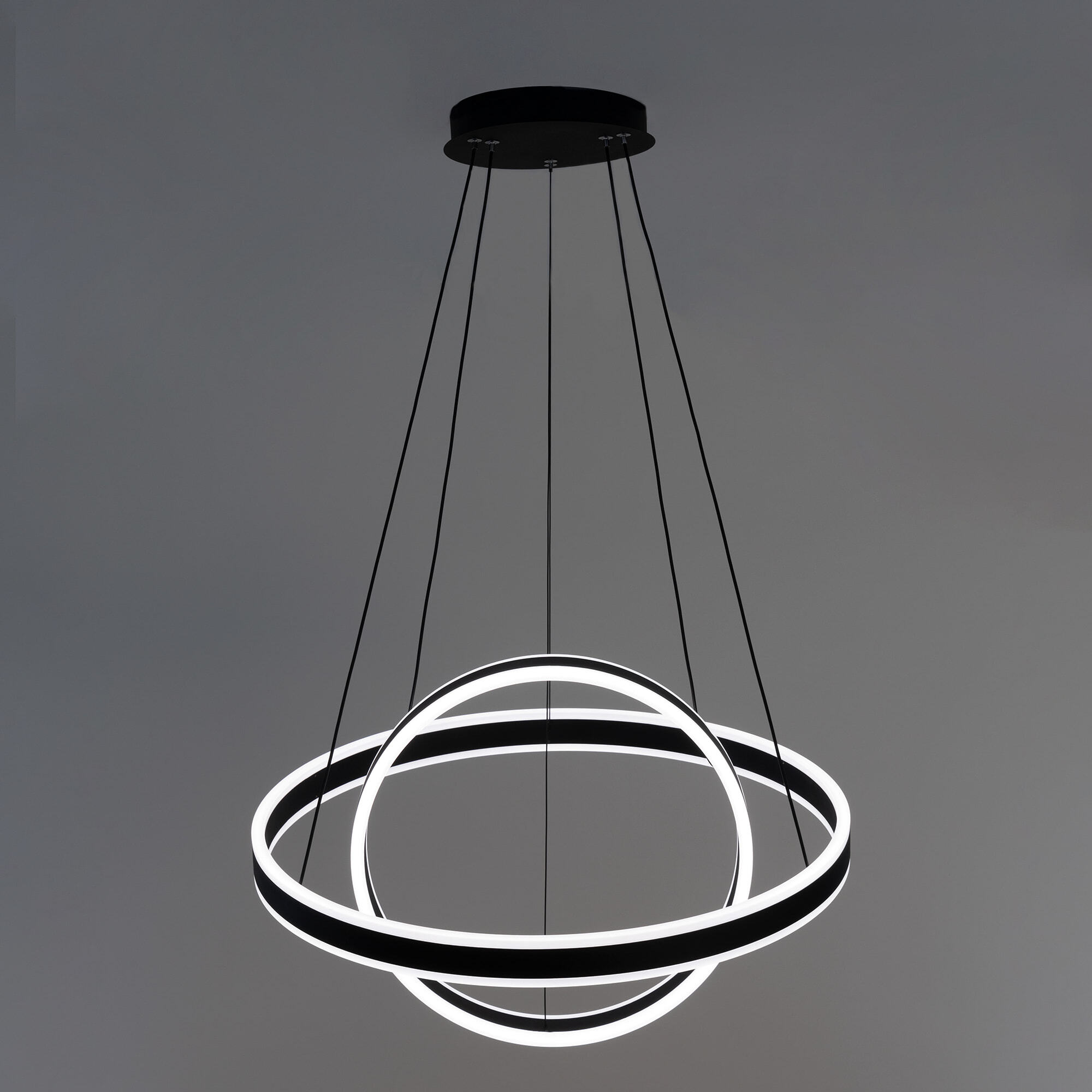 Светодиодная люстра Citilux Дуэт CL719641 выполнена в современном стиле. Чёрная люстра на тросах с двумя подвесными кольцами, высоту и угол наклона каждого из которых можно легко изменить. Кольца - светодиодные модули изготовлены из алюминиевого профиля, рассеиватель из оптического полимера. Наличие источников света с двух сторон профиля позволяет равномерно осветить всё помещение.