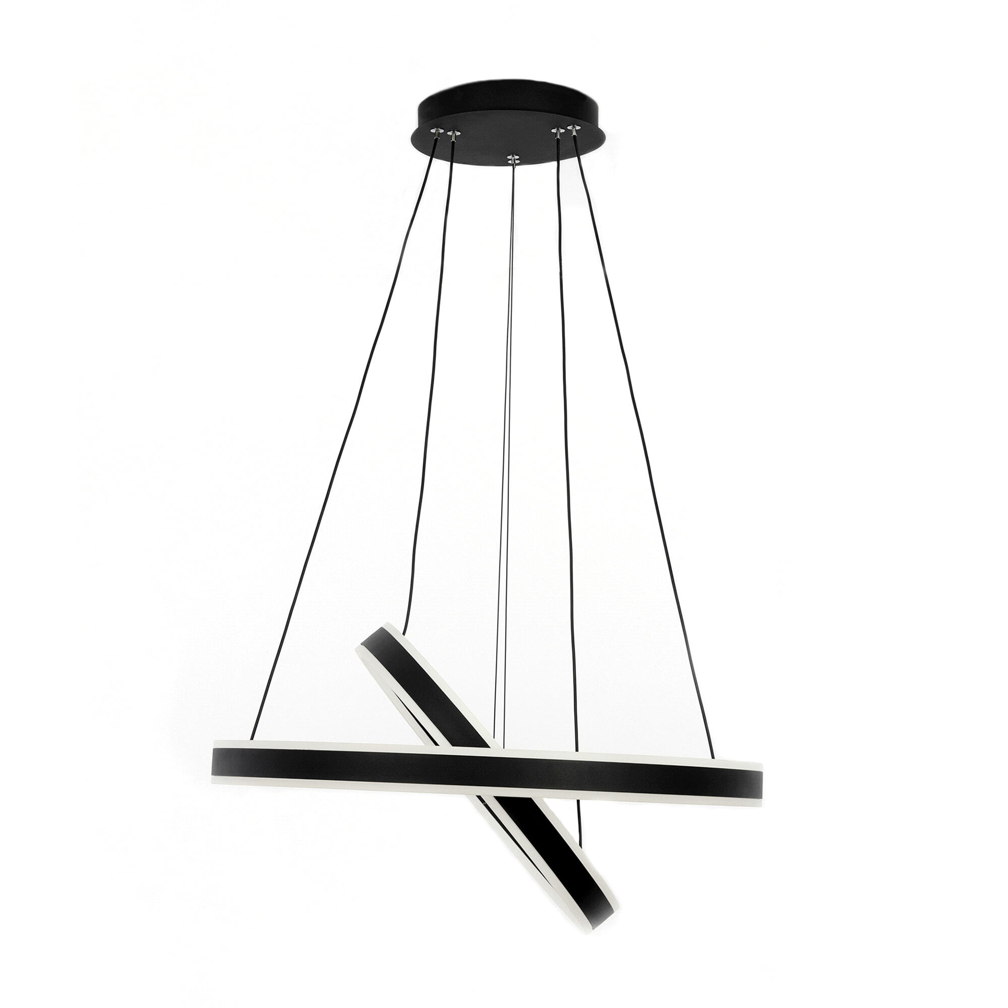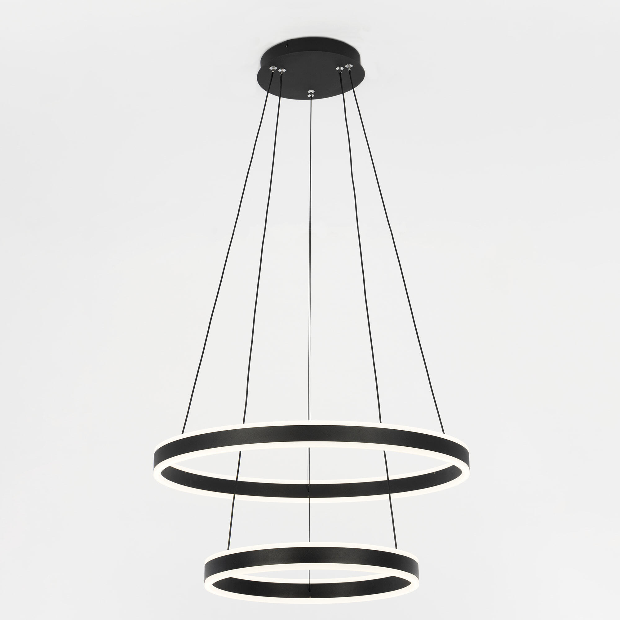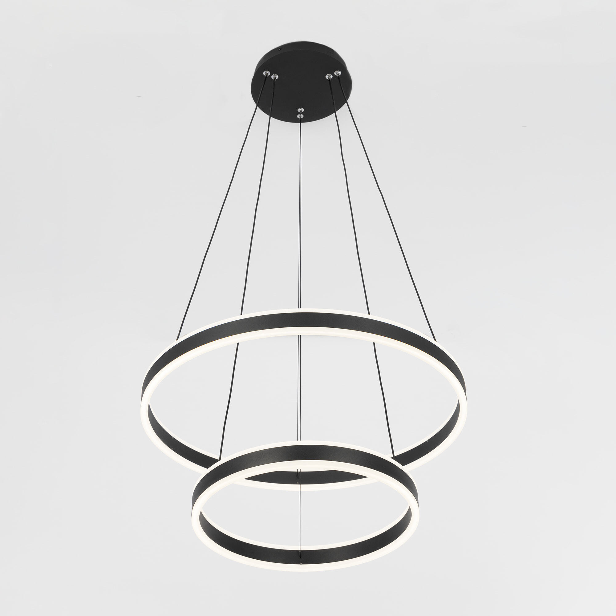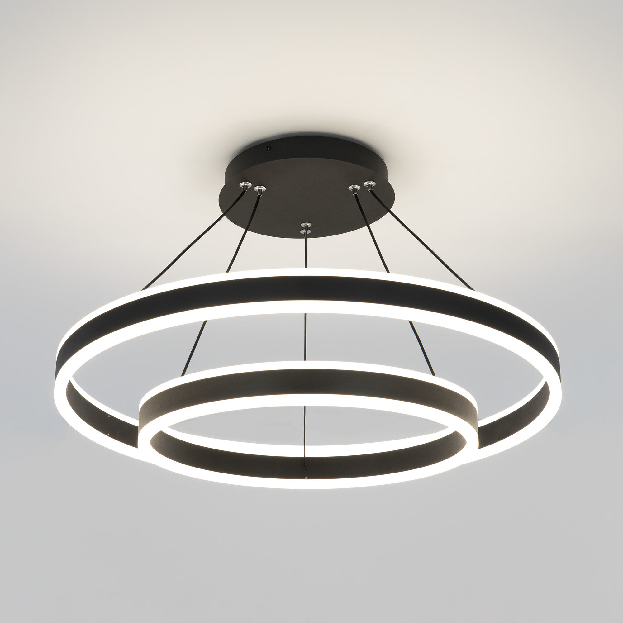 Светодиодная люстра Citilux Дуэт CL719641 выполнена в современном стиле. Чёрная люстра на тросах с двумя подвесными кольцами, высоту и угол наклона каждого из которых можно легко изменить. Кольца - светодиодные модули изготовлены из алюминиевого профиля, рассеиватель из оптического полимера. Наличие источников света с двух сторон профиля позволяет равномерно осветить всё помещение.