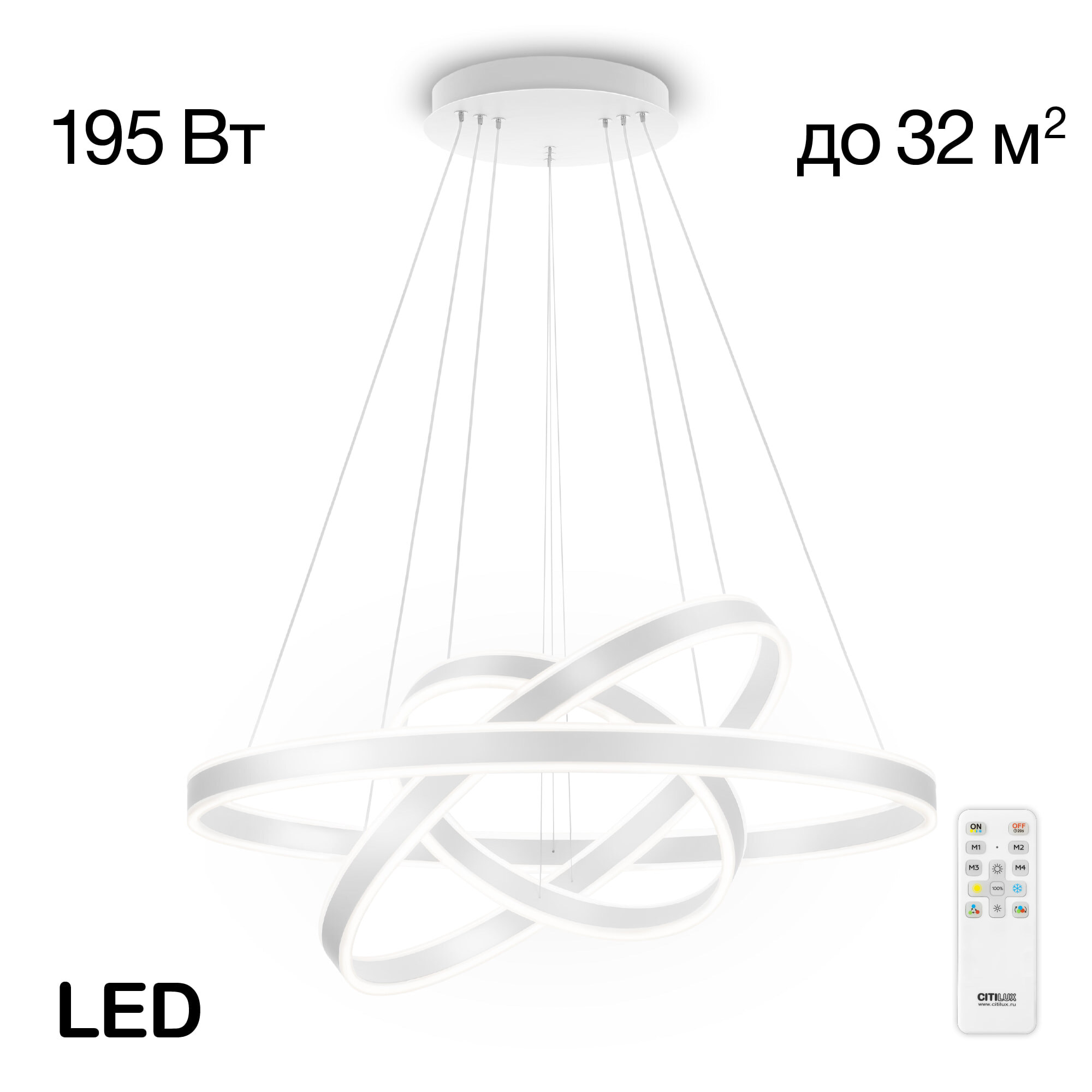 С помощью пульта доступно: плавная регулировка яркости от 10 до 100%; управление цветовой температурой от 3000К до 5500К, позволяет настроить любые оттенки теплого, нейтрального и холодного света. Есть функция отсроченного выключения, 4 настраиваемых режима памяти, которыми также можно управлять настенным выключателем. Пульт ДУ в комплекте, тип батареек ААА (батарейки в комплект не входят, приобретаются отдельно). Мощность 195Вт, диаметр 80см, максимальная высота 120см. Крепление подходит для всех типов потолков, в том числе натяжных, тип крепления – планка.Люстра Ситилюкс Дуэт CL719680 прекрасно осветит помещения как с высокими, так и с низкими потолками площадью до 32м².Citilux CL719 DUET: Вдохновение в каждом луче.