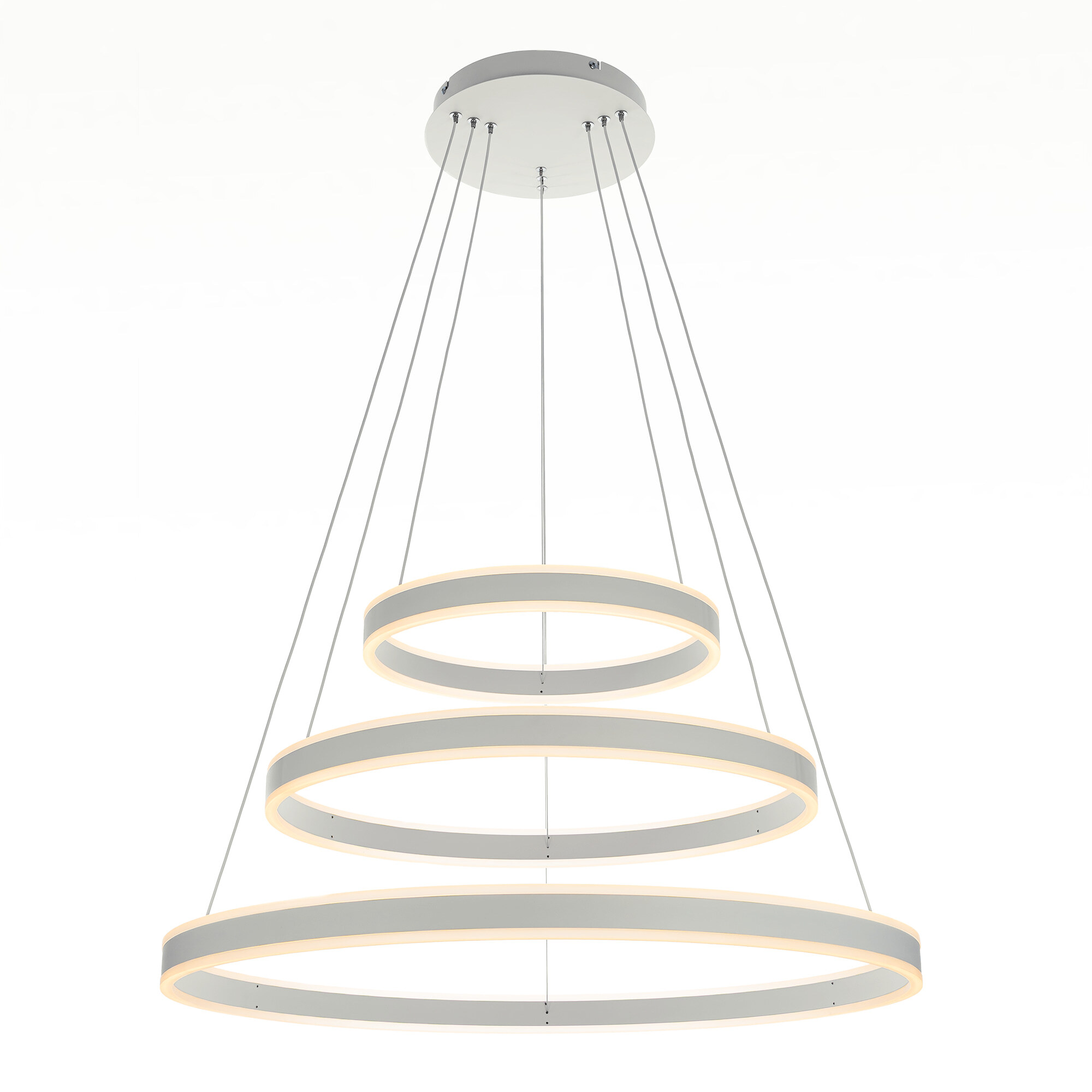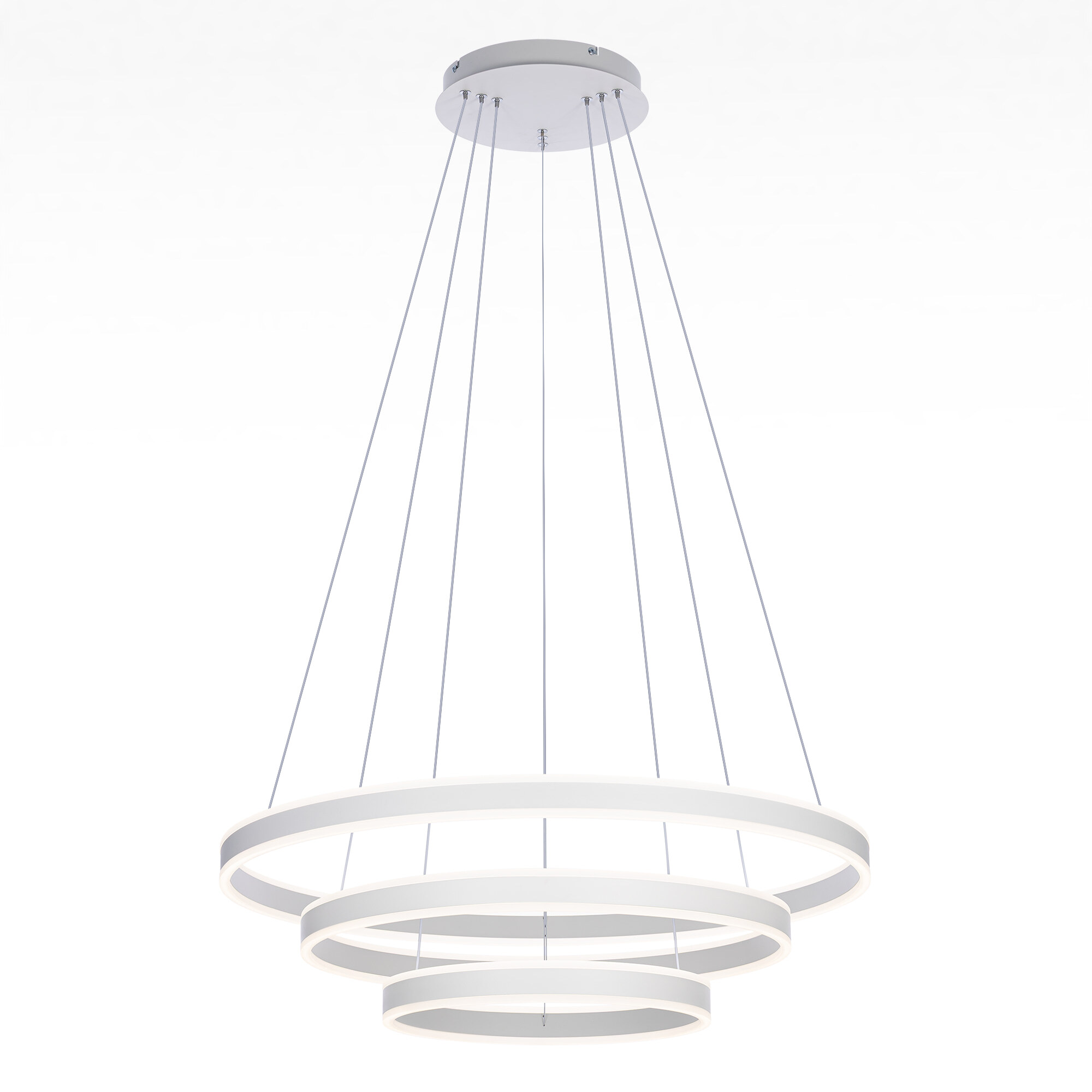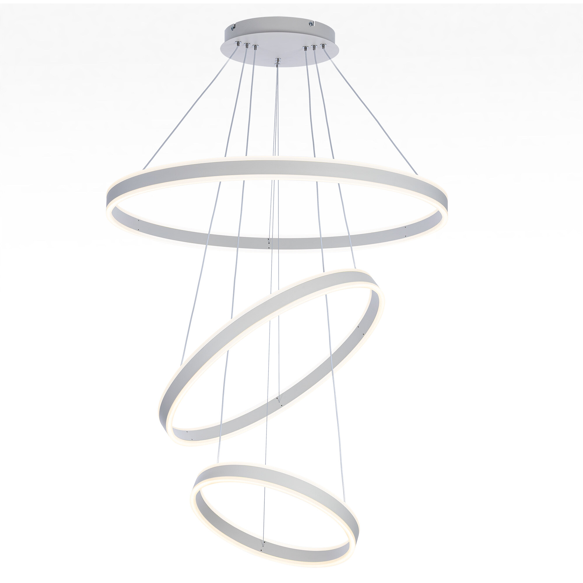 Светодиодная люстра Citilux Дуэт CL719680 выполнена в современном стиле, цвет белый. Люстра на тросах в форме каскада из трёх колец, высоту и угол наклона каждого из которых можно легко изменить. Кольца - светодиодные модули изготовлены из алюминиевого профиля, рассеиватель из оптического полимера. Наличие источников света с двух сторон профиля позволяет равномерно осветить всё помещение.