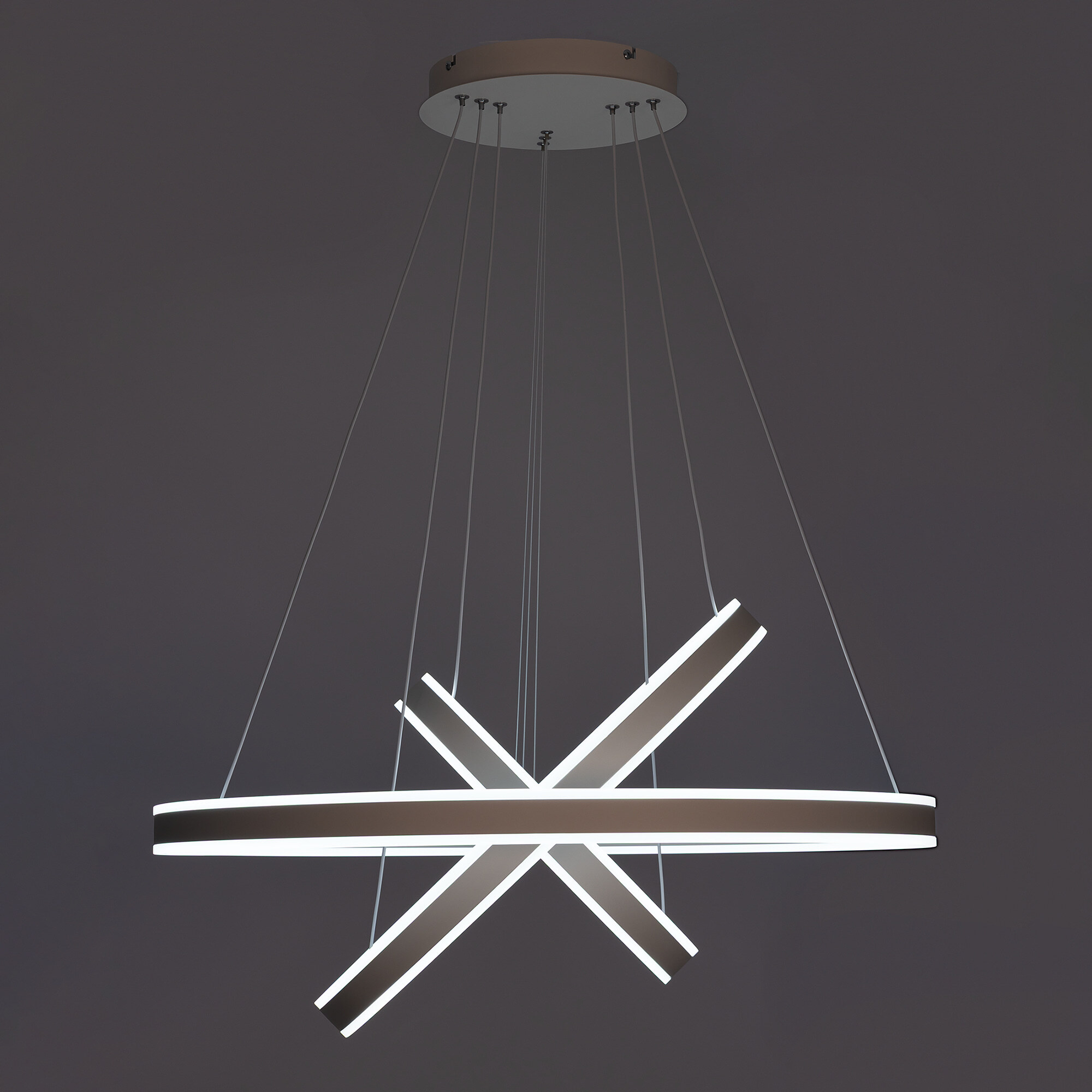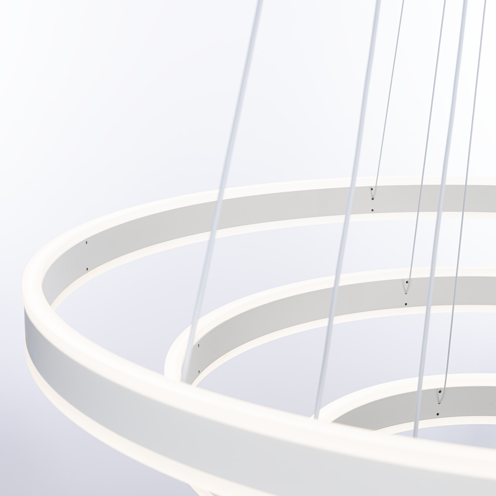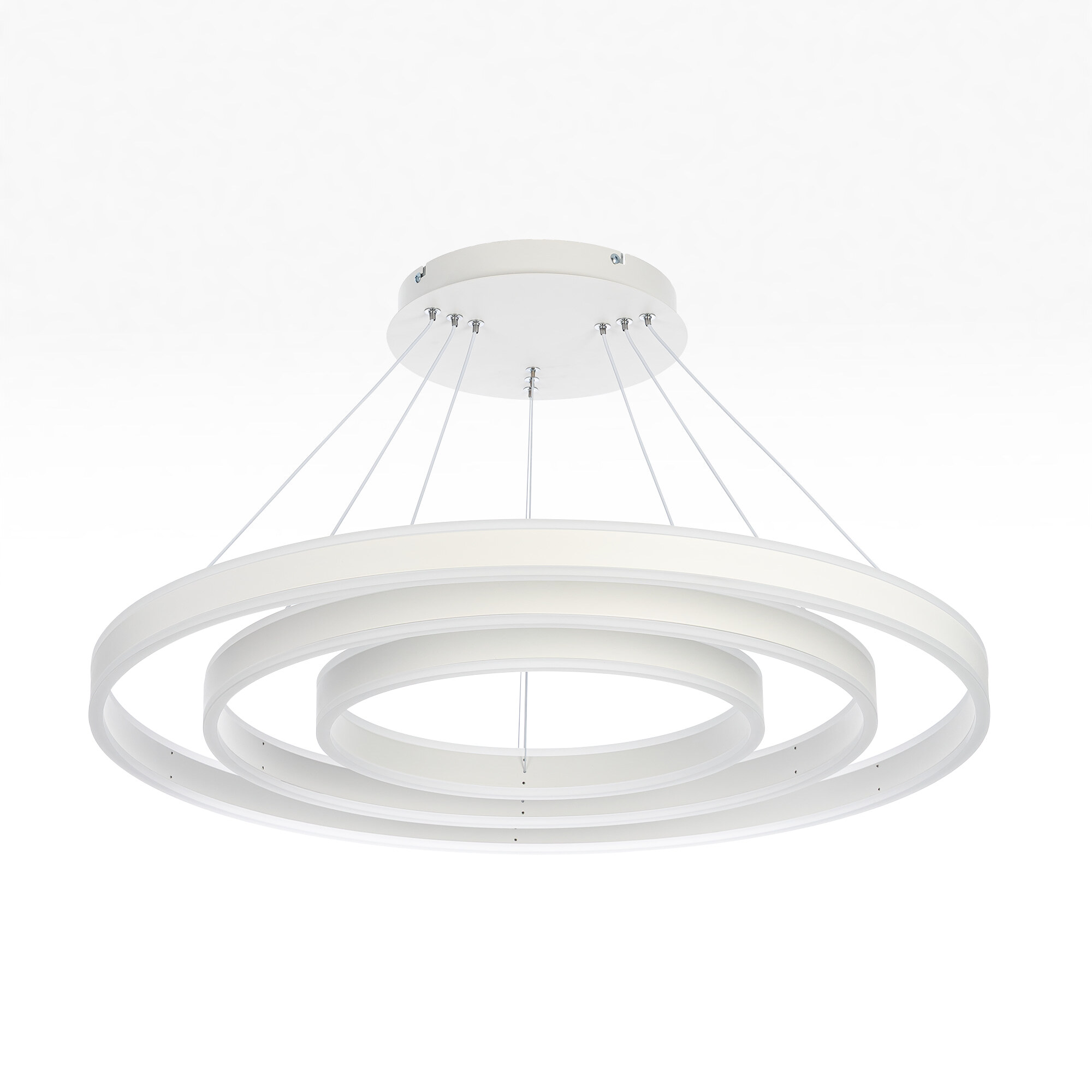 Светодиодная люстра Citilux Дуэт CL719680 выполнена в современном стиле, цвет белый. Люстра на тросах в форме каскада из трёх колец, высоту и угол наклона каждого из которых можно легко изменить. Кольца - светодиодные модули изготовлены из алюминиевого профиля, рассеиватель из оптического полимера. Наличие источников света с двух сторон профиля позволяет равномерно осветить всё помещение.