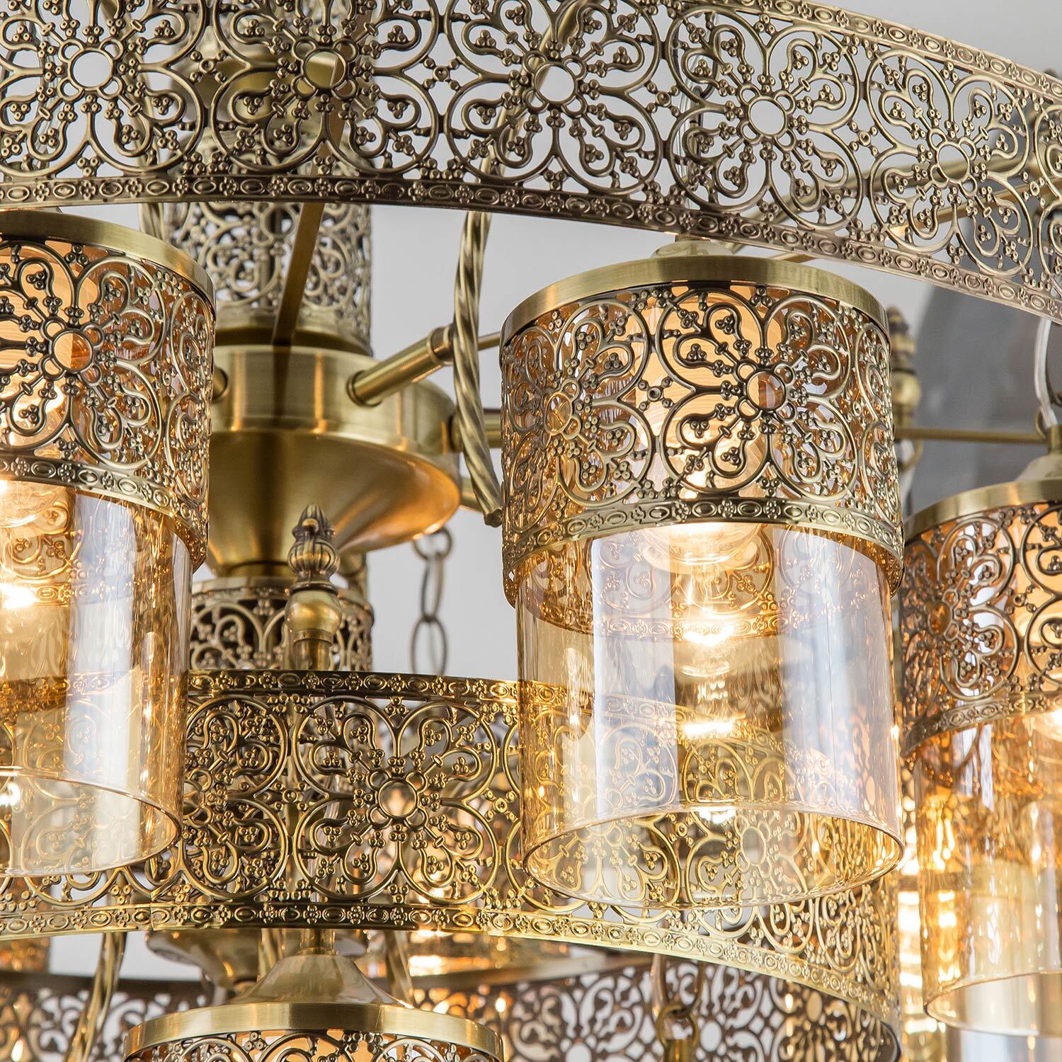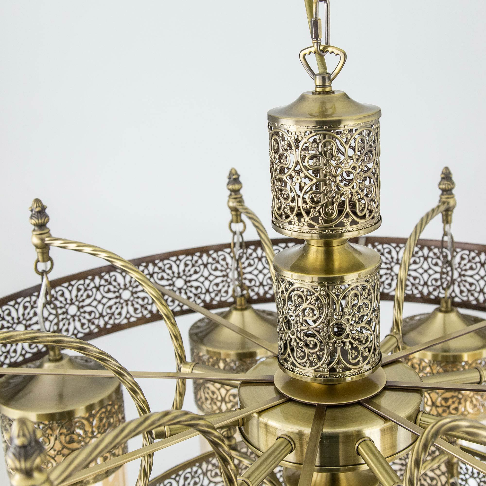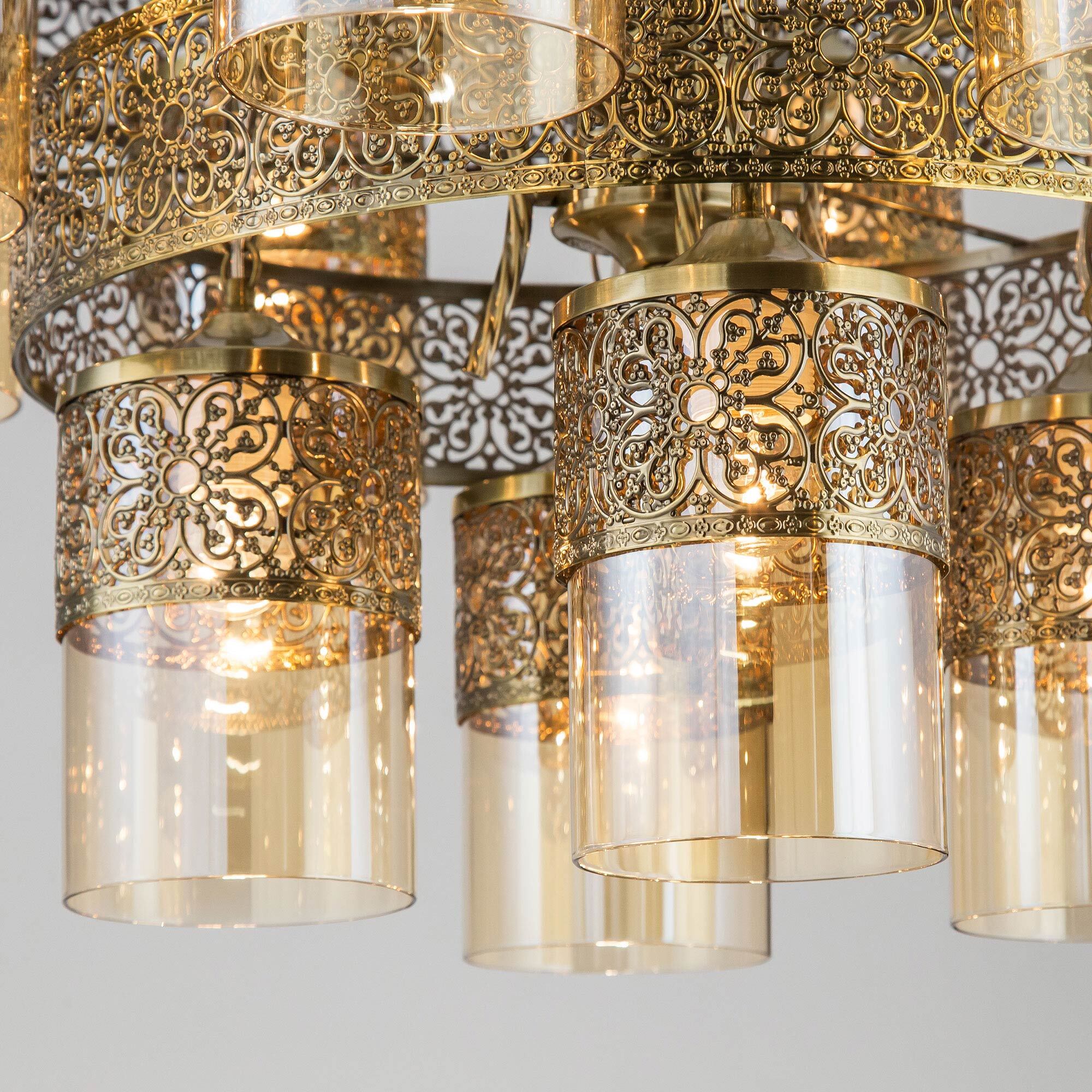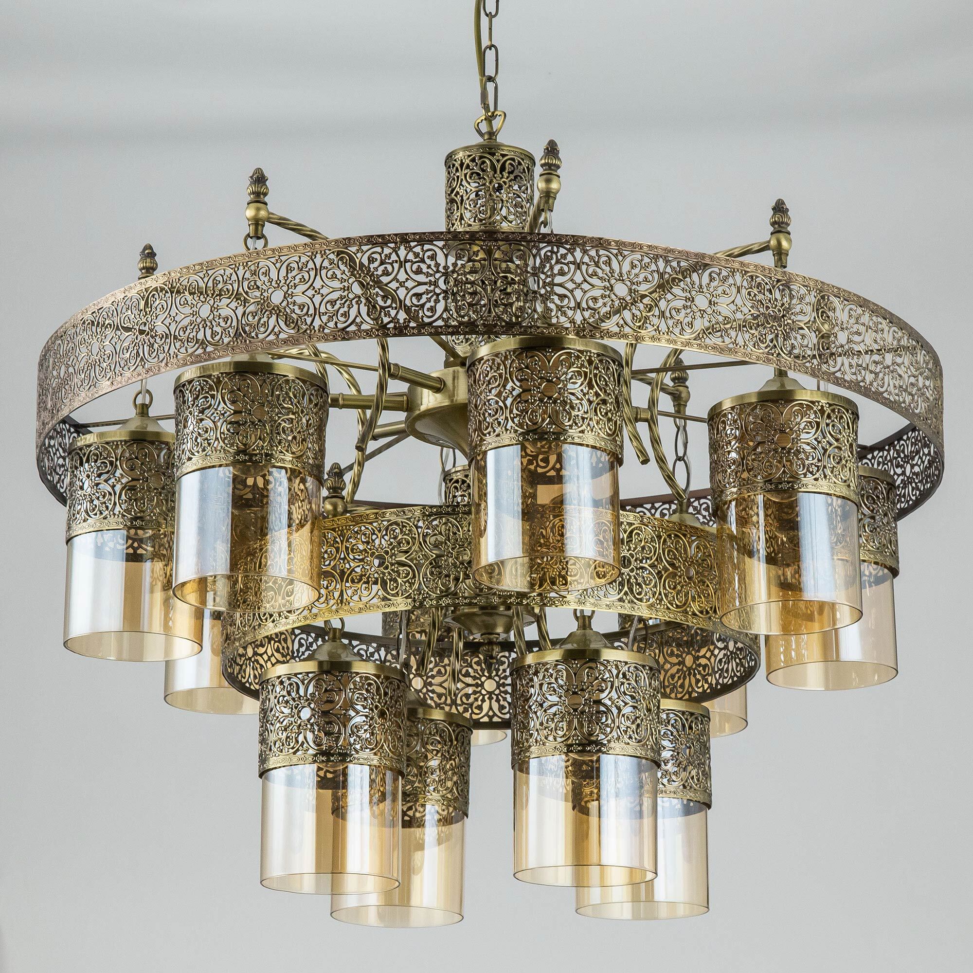 Потрясающая двухъярусная люстра с подвесными плафонами Citilux Эмир CL467193 выполнена в восточном стиле. Корпус металлический, благородного бронзового цвета. Плафоны цилиндрической формы изготовлены из прозрачного стекла оттенка шампань. Светильник искусно украшен ажурной чеканкой.