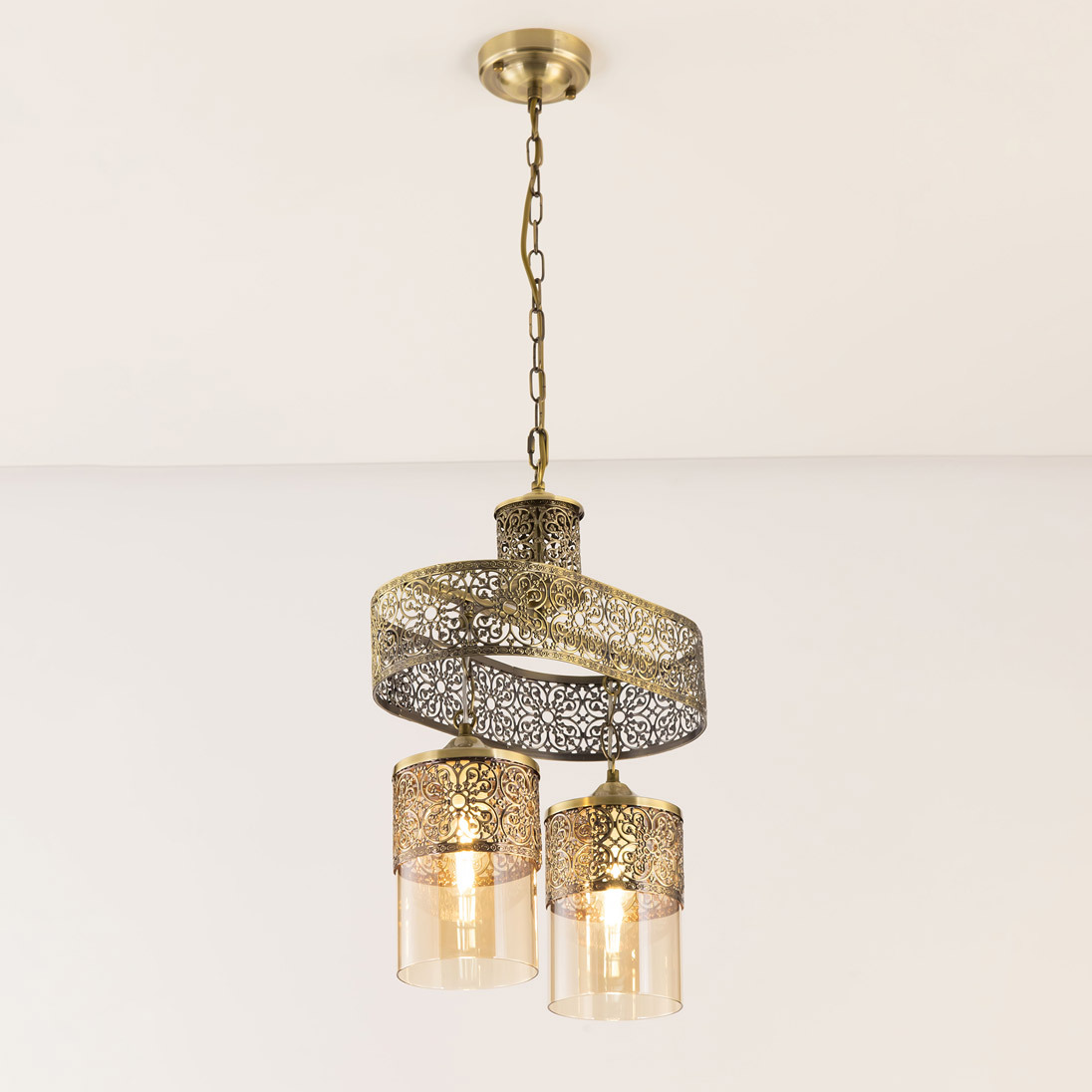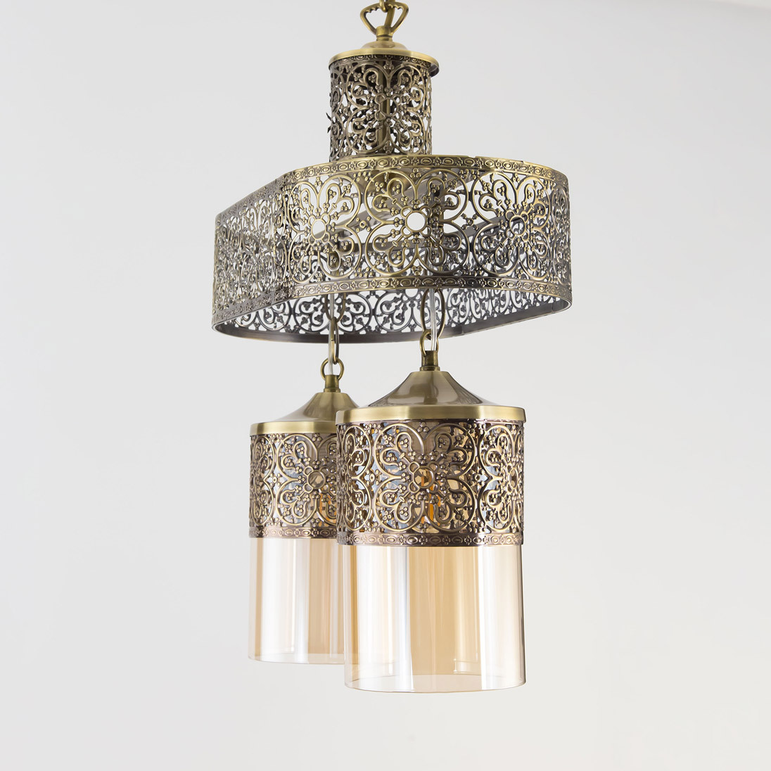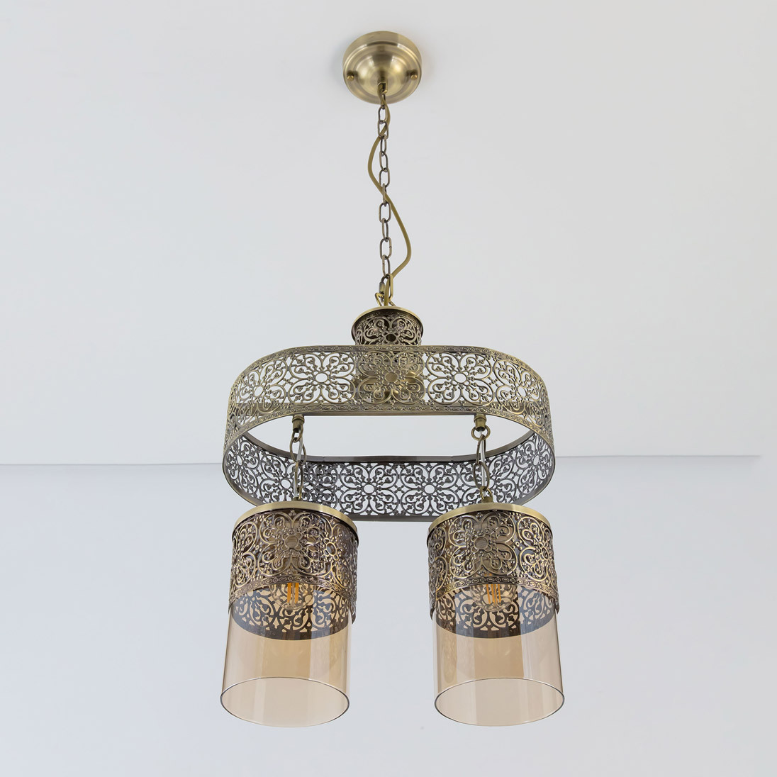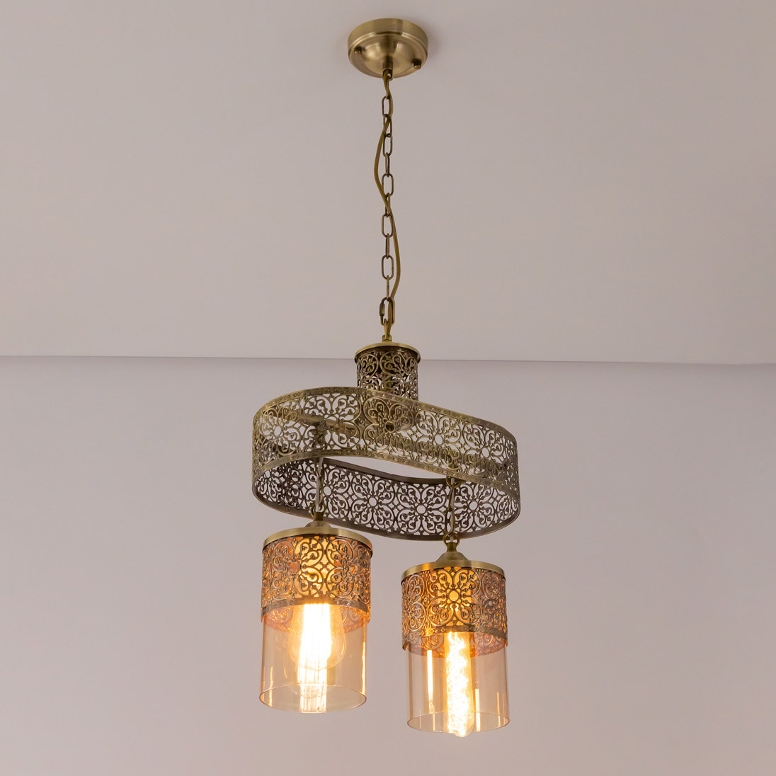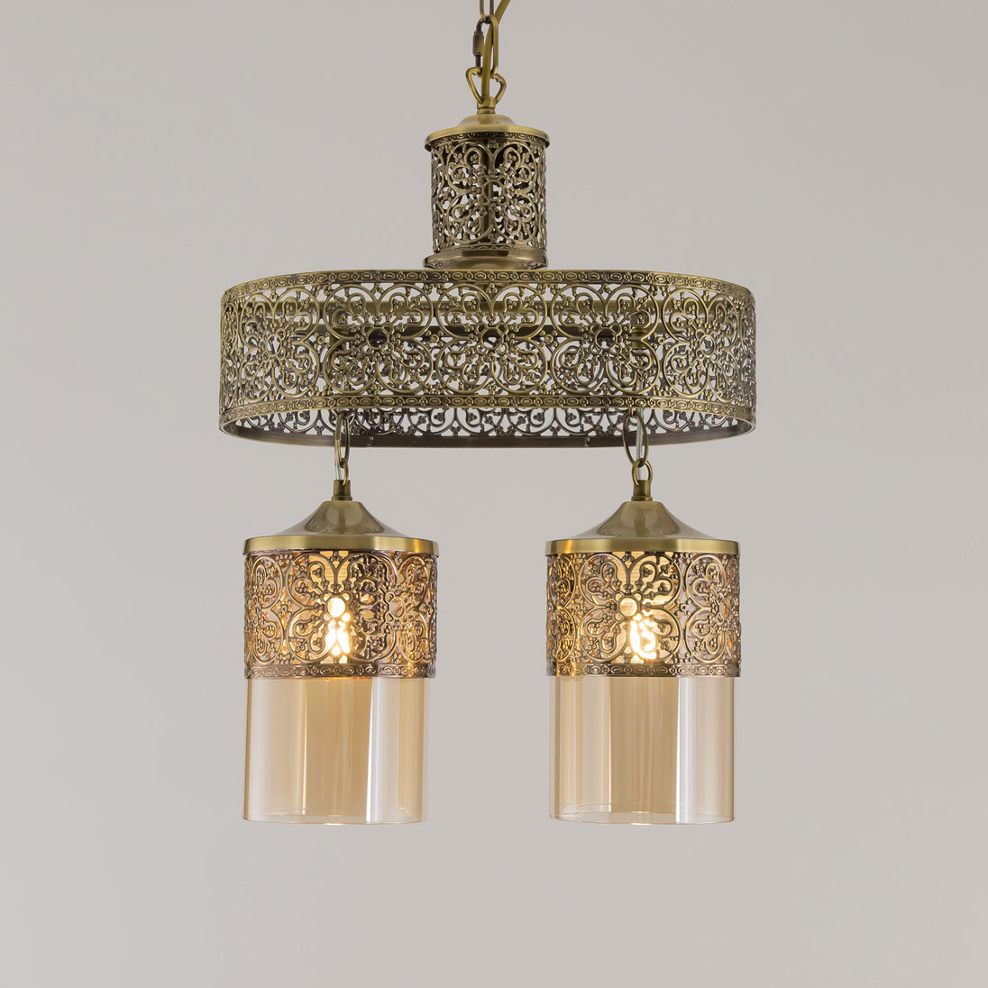 Люстра с двумя подвесными плафонами Citilux Эмир CL467223 выполнена в восточном стиле. Корпус металлический, благородного бронзового цвета. Плафоны цилиндрической формы изготовлены из прозрачного стекла оттенка шампань. Светильник искусно украшен ажурной чеканкой.
