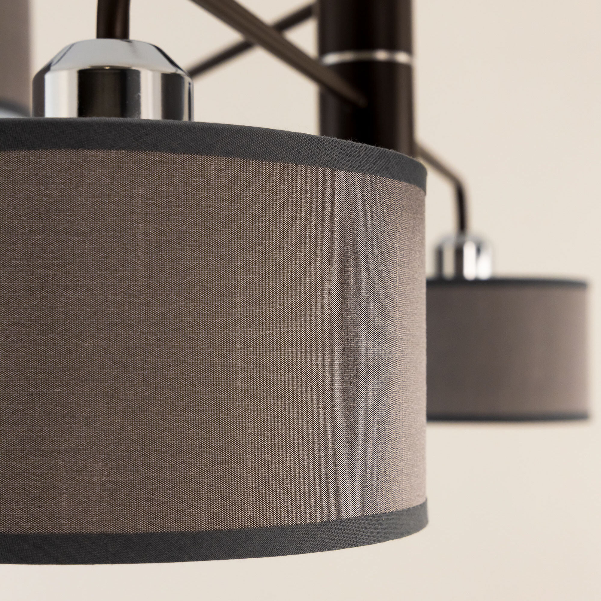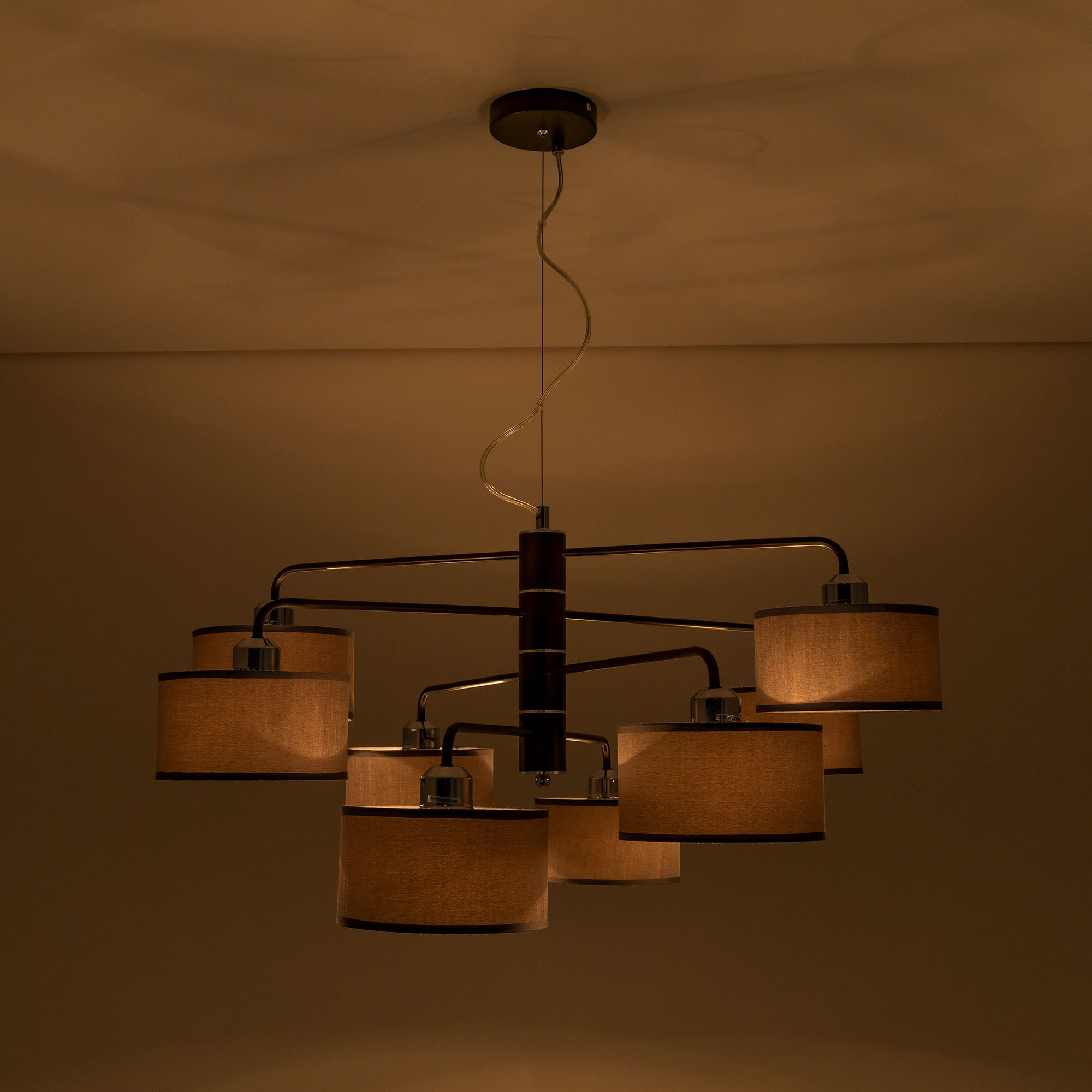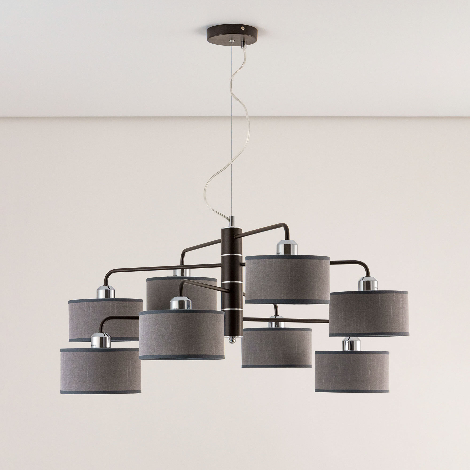 Подвесная люстра Citilux Форма CL428281 для современных интерьеров. Корпус светильника металлический, цвет венге (коричневый), с декоративными хромированными элементами. Абажуры цилиндрической формы, из текстурной ткани серого цвета, на подложке из оптического полимера. Размеры абажура: диаметр 12см, высота 10см. В изделии используются 8 ламп с цоколем Е27, максимальной мощностью для ламп накаливания 60Вт. Светодиодные лампы можно использовать более яркие. Осветит около 20м². Тип крепления к потолку – планка.Citilux CL428 FORMA: Вдохновение в каждом луче.