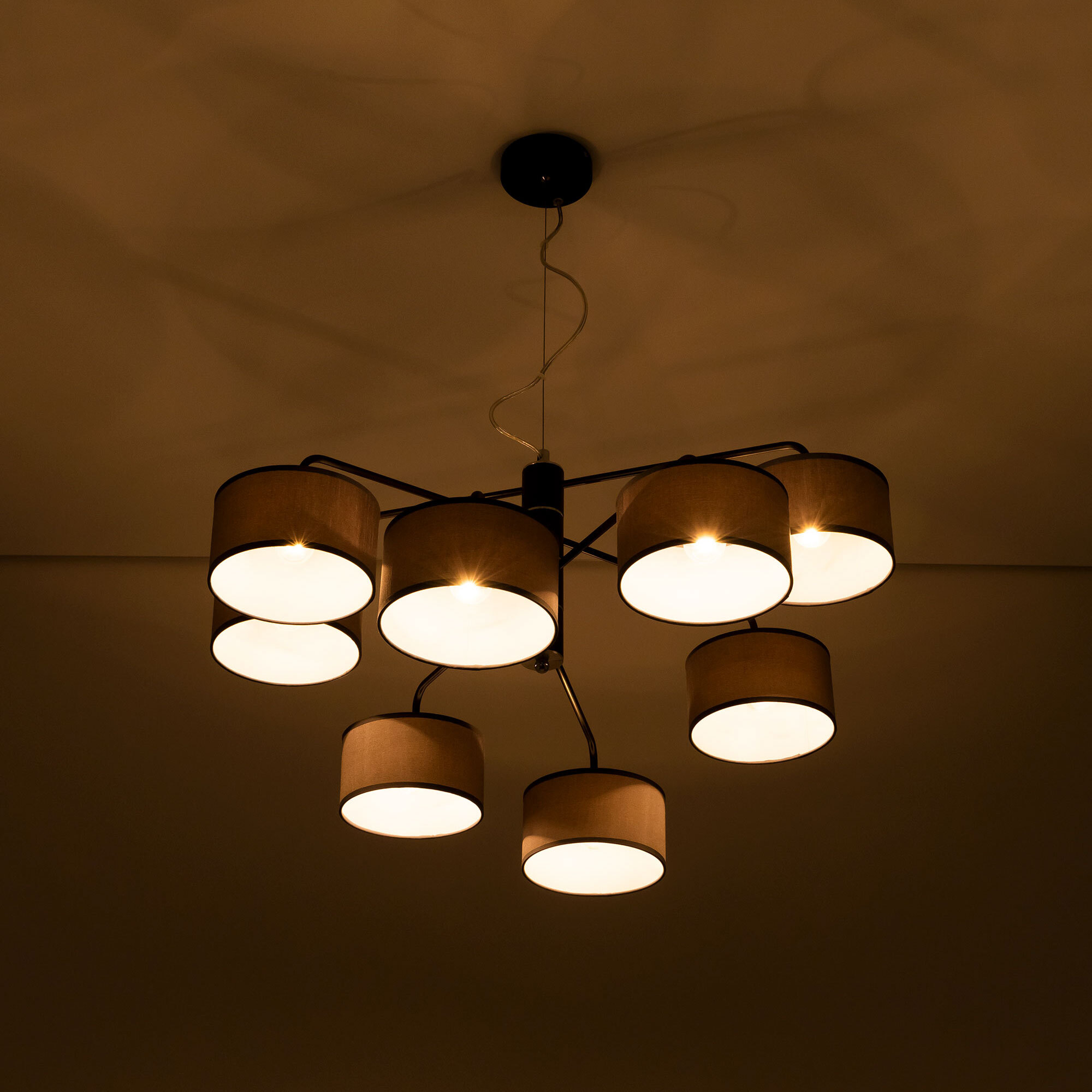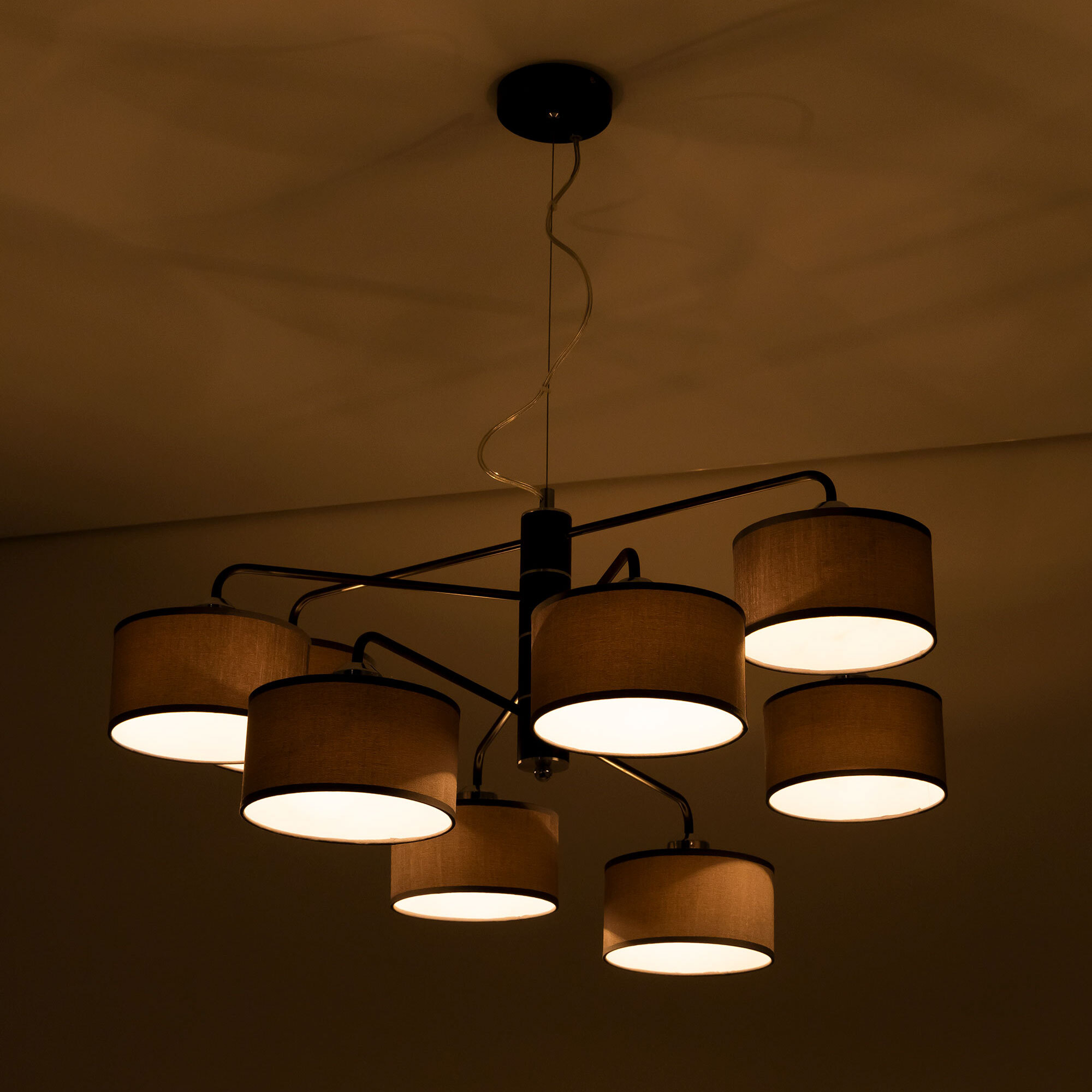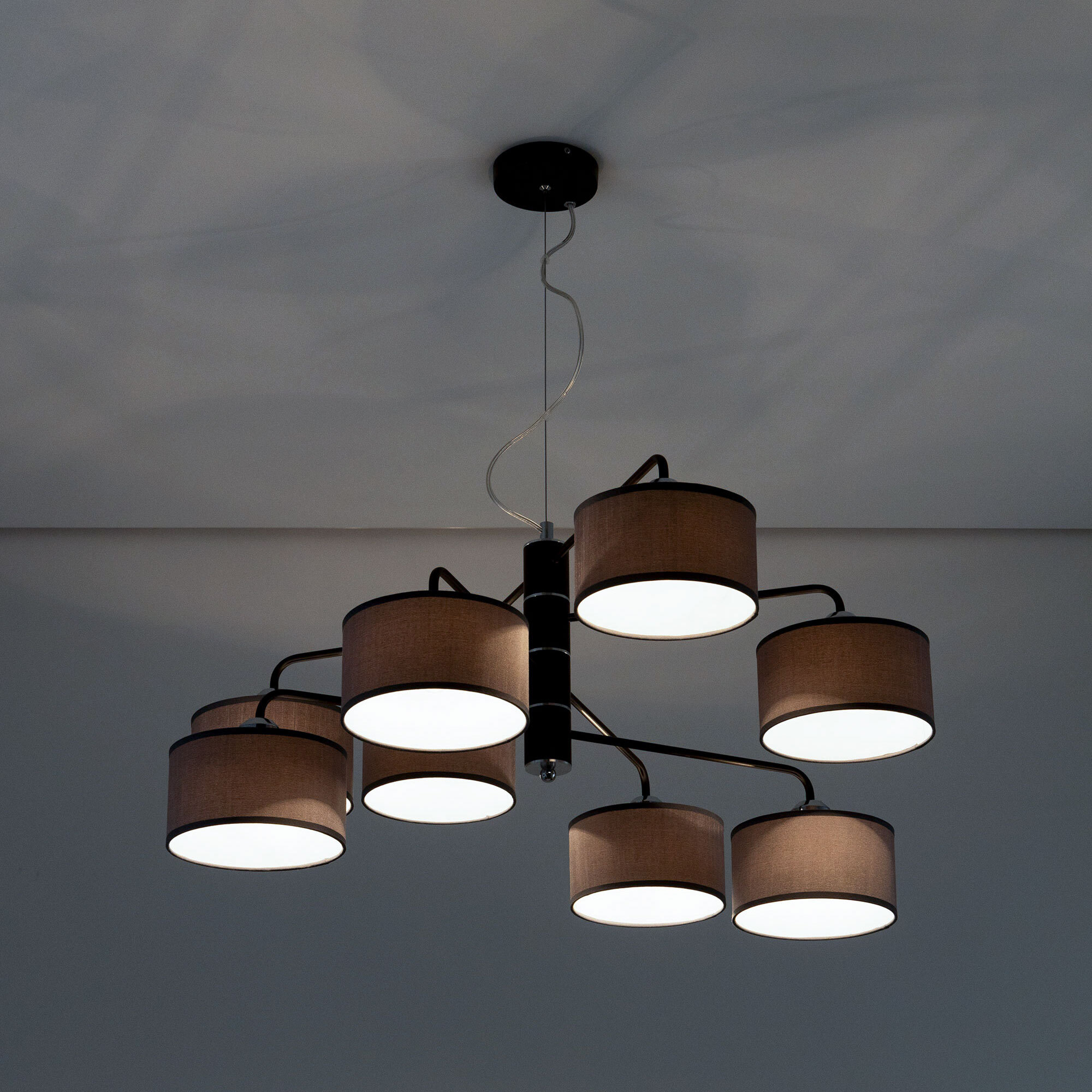 Подвесная люстра Citilux Форма CL428281 для современных интерьеров. Корпус светильника металлический, цвет венге (коричневый), с декоративными хромированными элементами. Абажуры цилиндрической формы, из текстурной ткани серого цвета, на подложке из оптического полимера. Размеры абажура: диаметр 12см, высота 10см. В изделии используются 8 ламп с цоколем Е27, максимальной мощностью для ламп накаливания 60Вт. Светодиодные лампы можно использовать более яркие. Осветит около 20м². Тип крепления к потолку – планка.Citilux CL428 FORMA: Вдохновение в каждом луче.