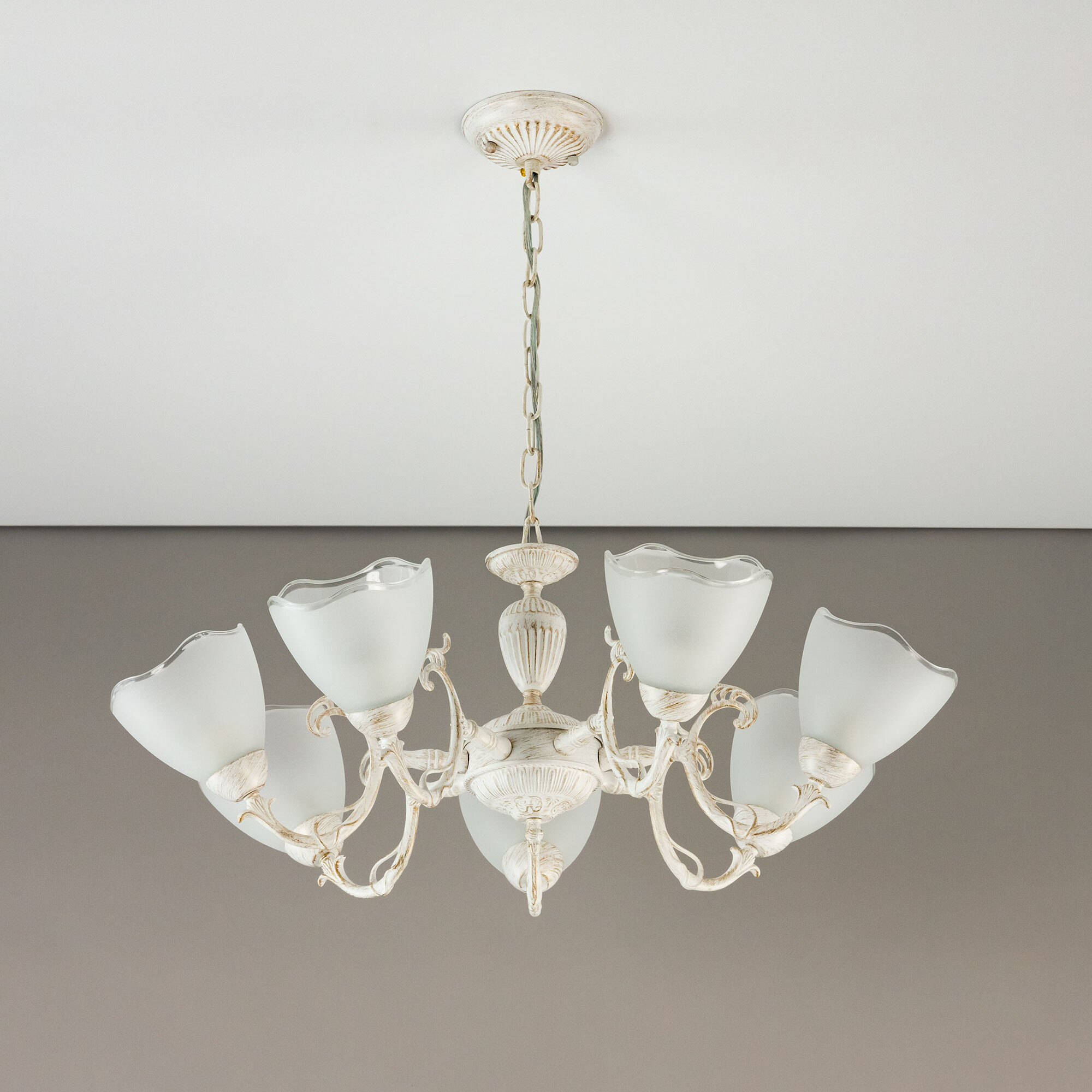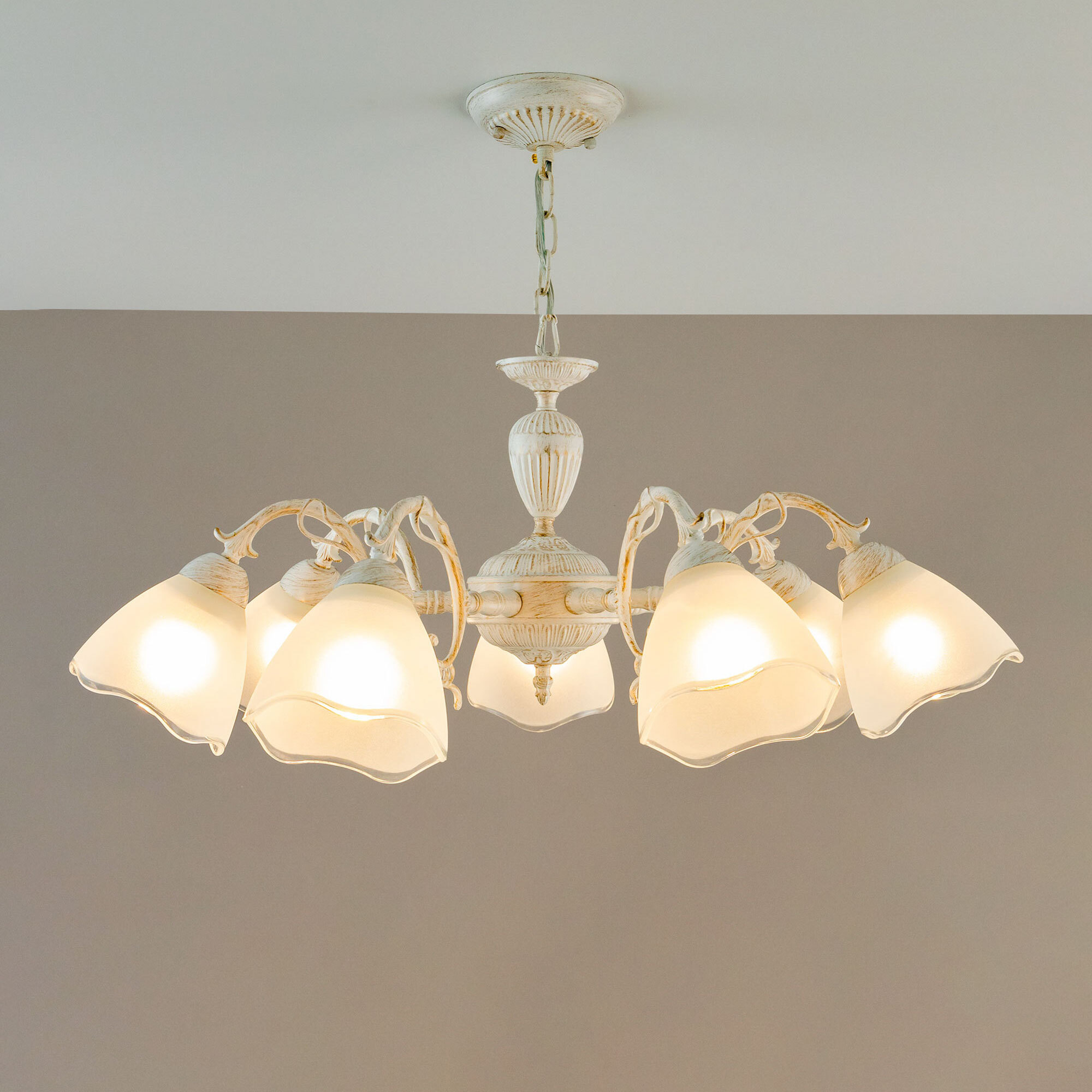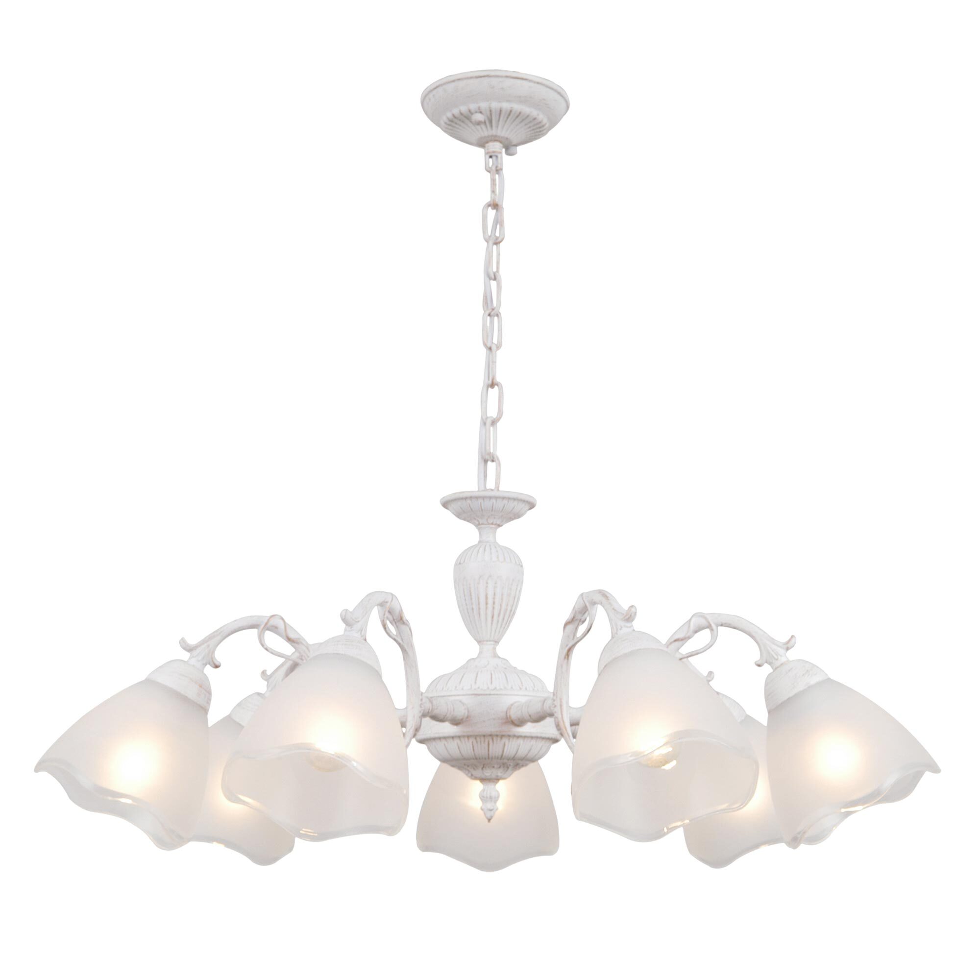 Люстра Citilux Латур CL413270 в классическом стиле. Корпус светильника металлический, с литыми рожками, цвет белый с золотистой патиной. Плафоны стеклянные, полуматовые, с прозрачным волнистым краем. Светильник поставляется в виде комплекта для самостоятельной сборки, с подробной инструкцией. Из данного набора, можно собрать подвесную люстру с плафонами, направленными вверх, дающую мягкий отраженный свет или более яркий вариант с плафонами вниз. Высоту модели можно изменить при установке, уменьшив длину подвесной цепи. Если в помещении низкие потолки, изделие можно собрать вообще без цепи, как потолочную люстру. Более того, на стадии сборки, вы можете подключить светильник для работы, как с одноклавишным, так и с двухклавишным выключателем. В модели используются 7 ламп с цоколем Е27 и максимальной мощностью для ламп накаливания 75Вт. Светодиодные лампы можно использовать более яркие. Тип крепления к потолку – планка.Citilux CL413 LATUR: Вдохновение в каждом луче.