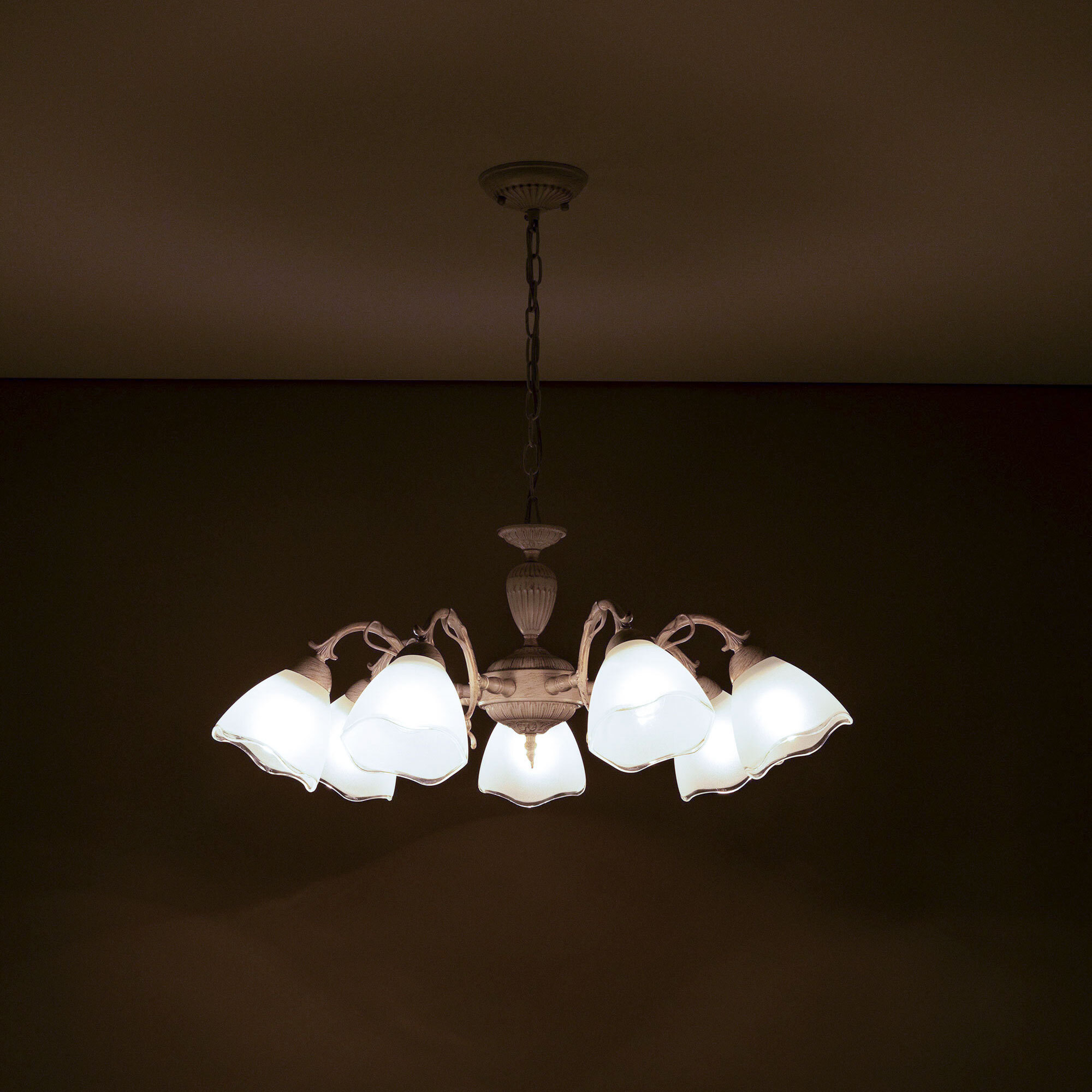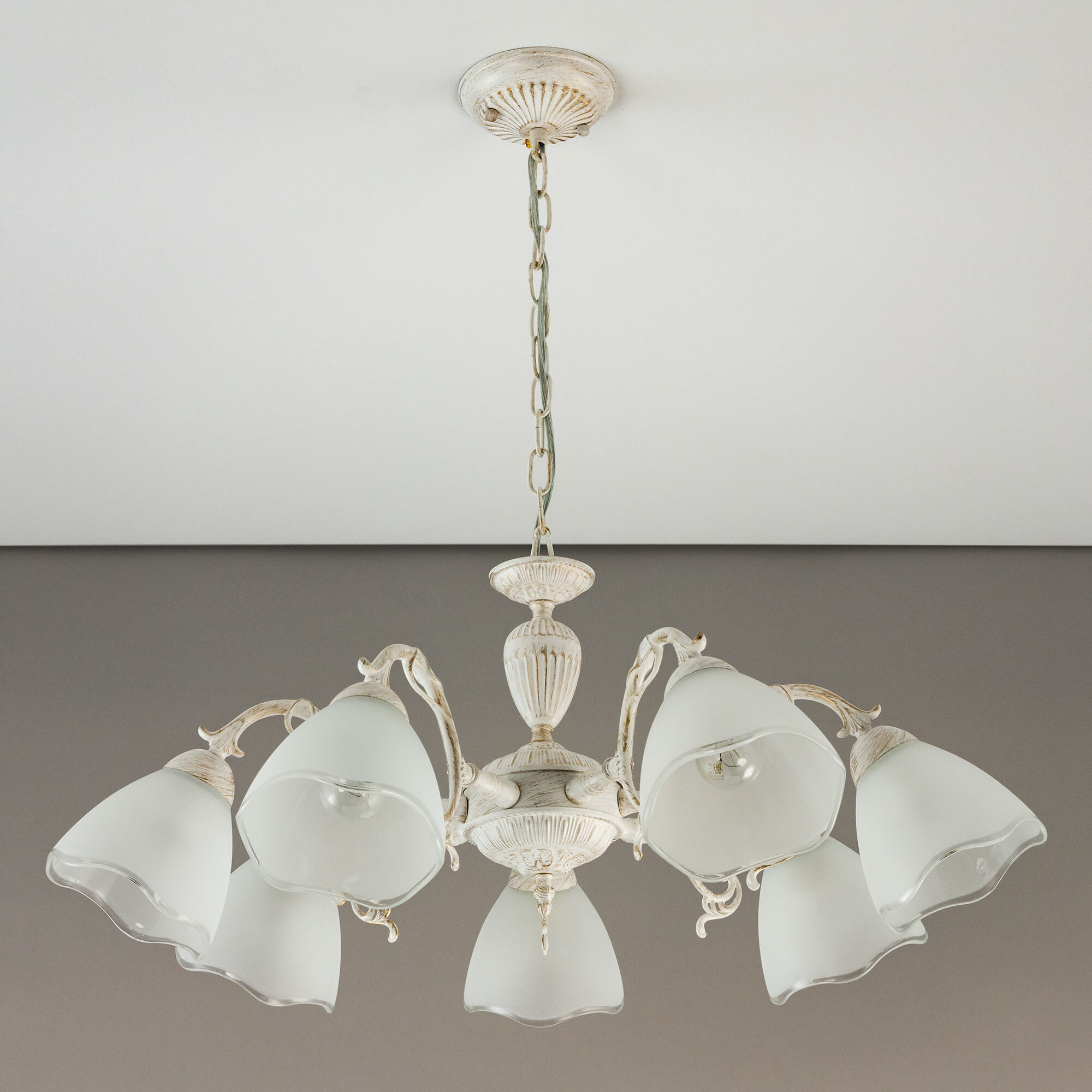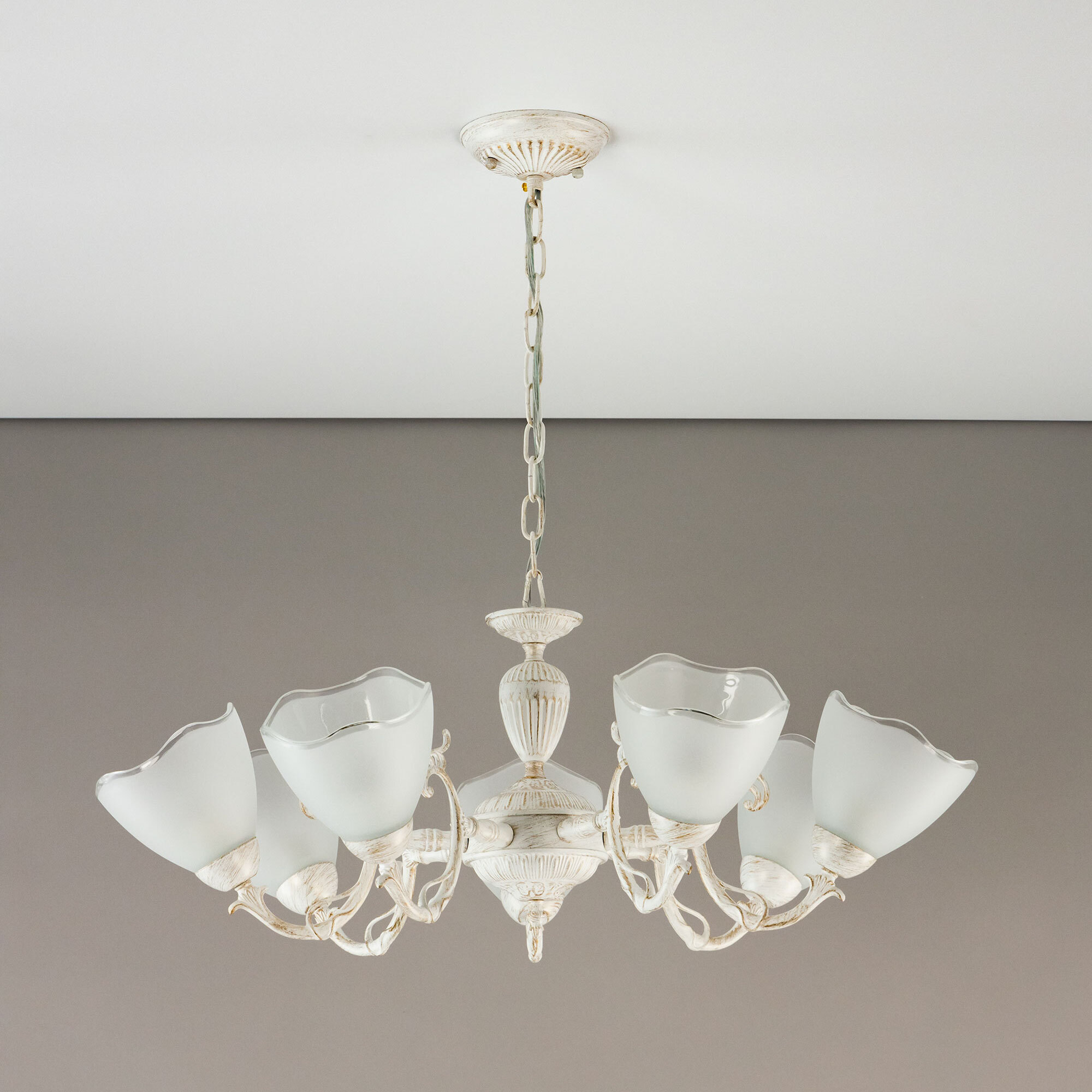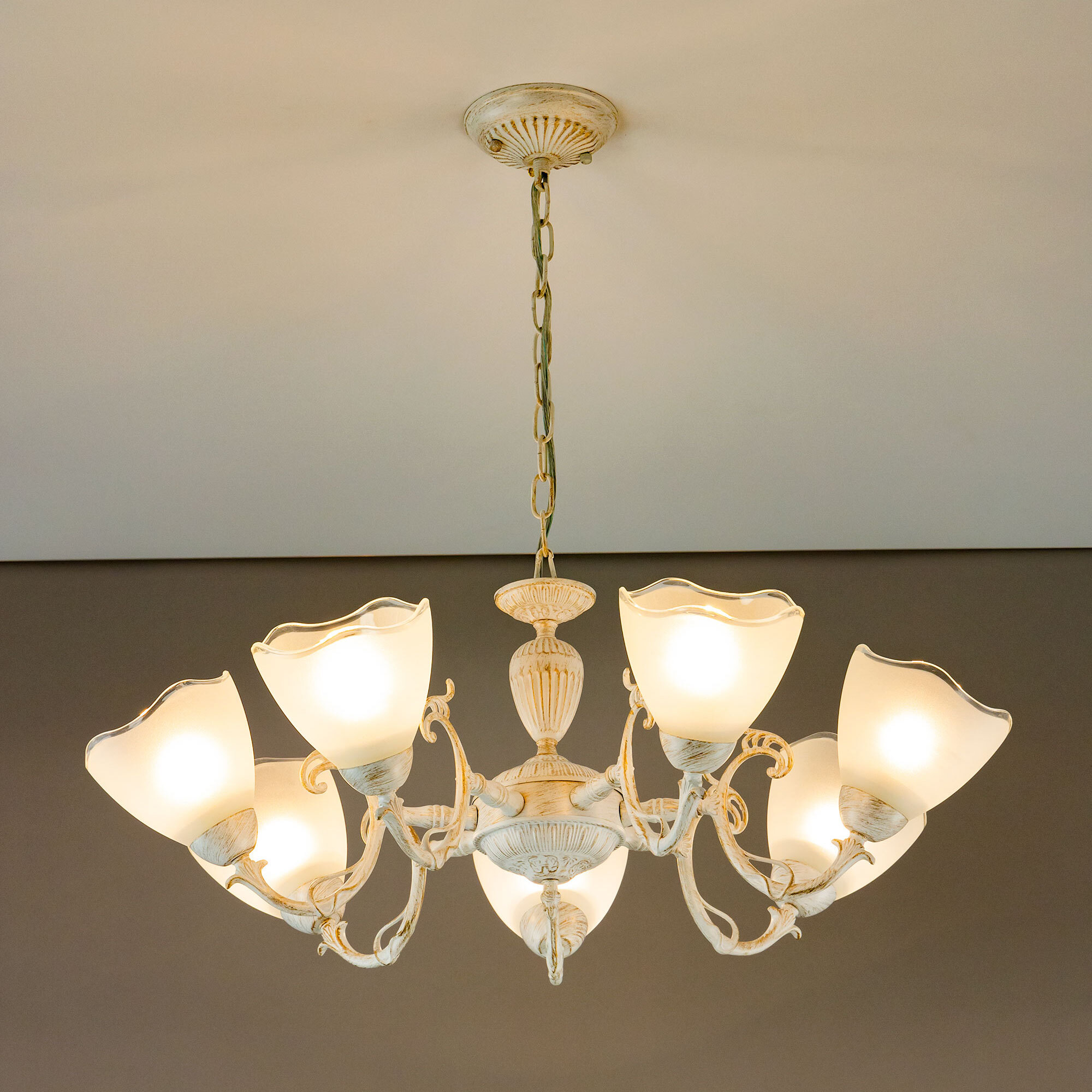Люстра Citilux Латур CL413270 в классическом стиле. Корпус светильника металлический, с литыми рожками, цвет белый с золотистой патиной. Плафоны стеклянные, полуматовые, с прозрачным волнистым краем. Светильник поставляется в виде комплекта для самостоятельной сборки, с подробной инструкцией. Из данного набора, можно собрать подвесную люстру с плафонами, направленными вверх, дающую мягкий отраженный свет или более яркий вариант с плафонами вниз. Высоту модели можно изменить при установке, уменьшив длину подвесной цепи. Если в помещении низкие потолки, изделие можно собрать вообще без цепи, как потолочную люстру. Более того, на стадии сборки, вы можете подключить светильник для работы, как с одноклавишным, так и с двухклавишным выключателем. В модели используются 7 ламп с цоколем Е27 и максимальной мощностью для ламп накаливания 75Вт. Светодиодные лампы можно использовать более яркие. Тип крепления к потолку – планка.Citilux CL413 LATUR: Вдохновение в каждом луче.