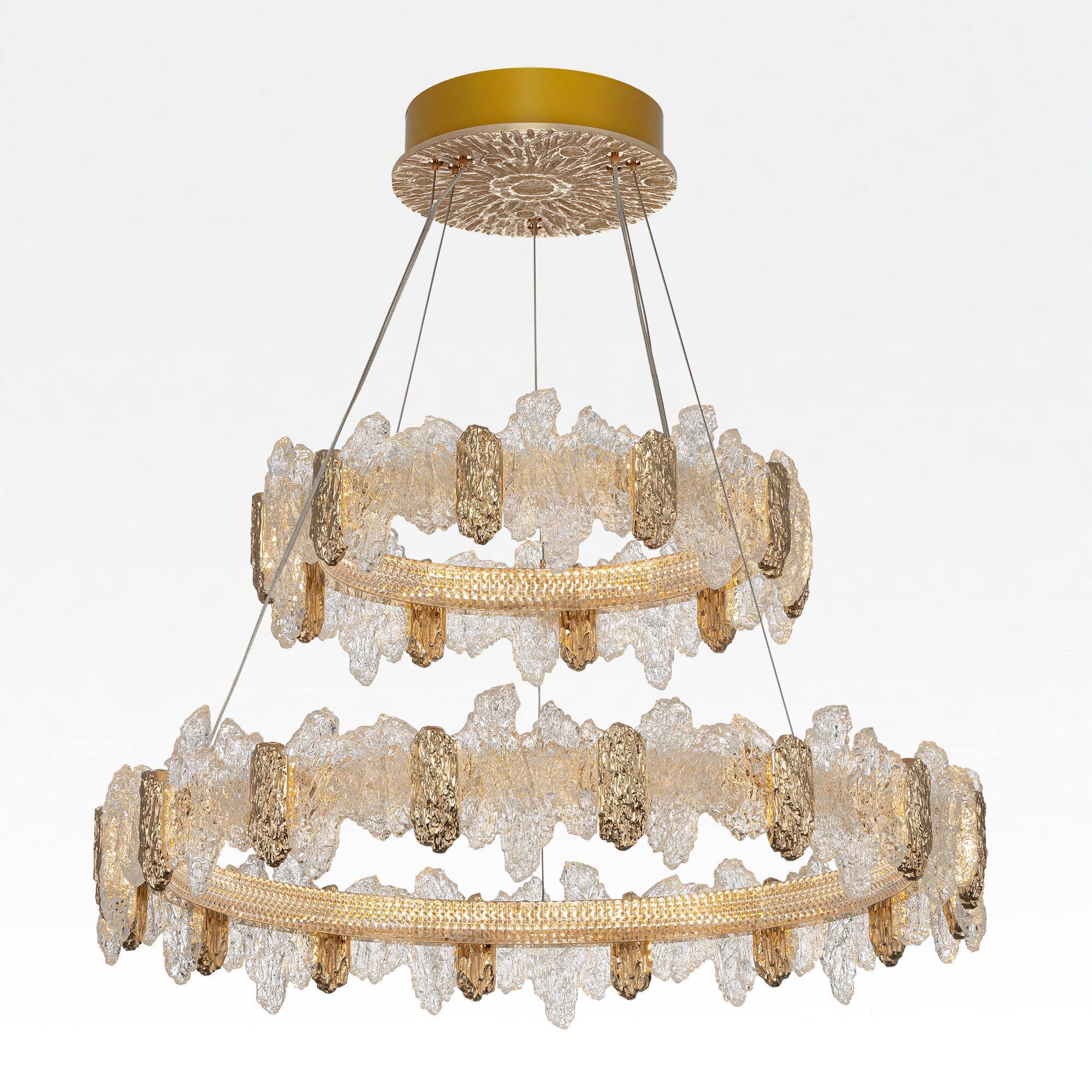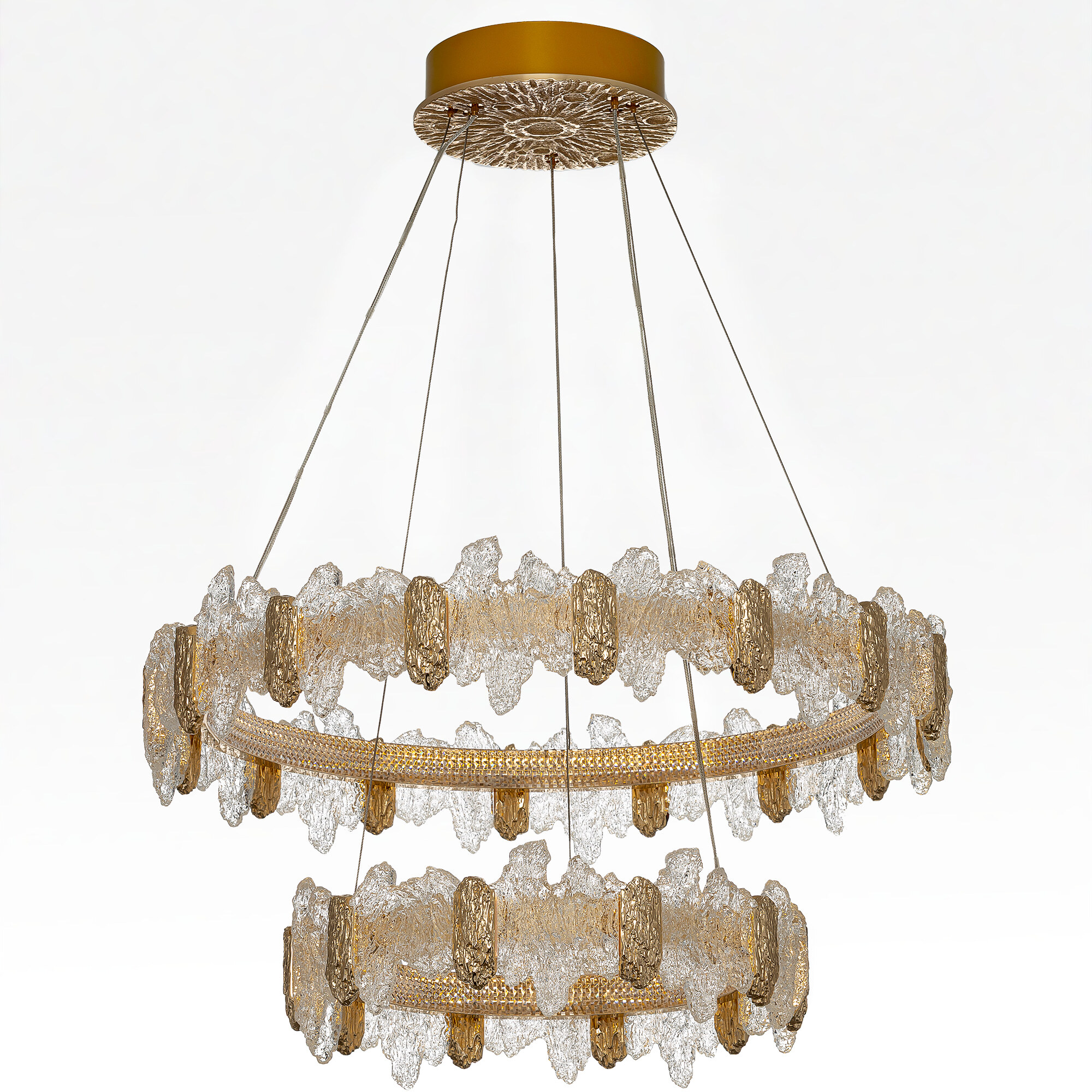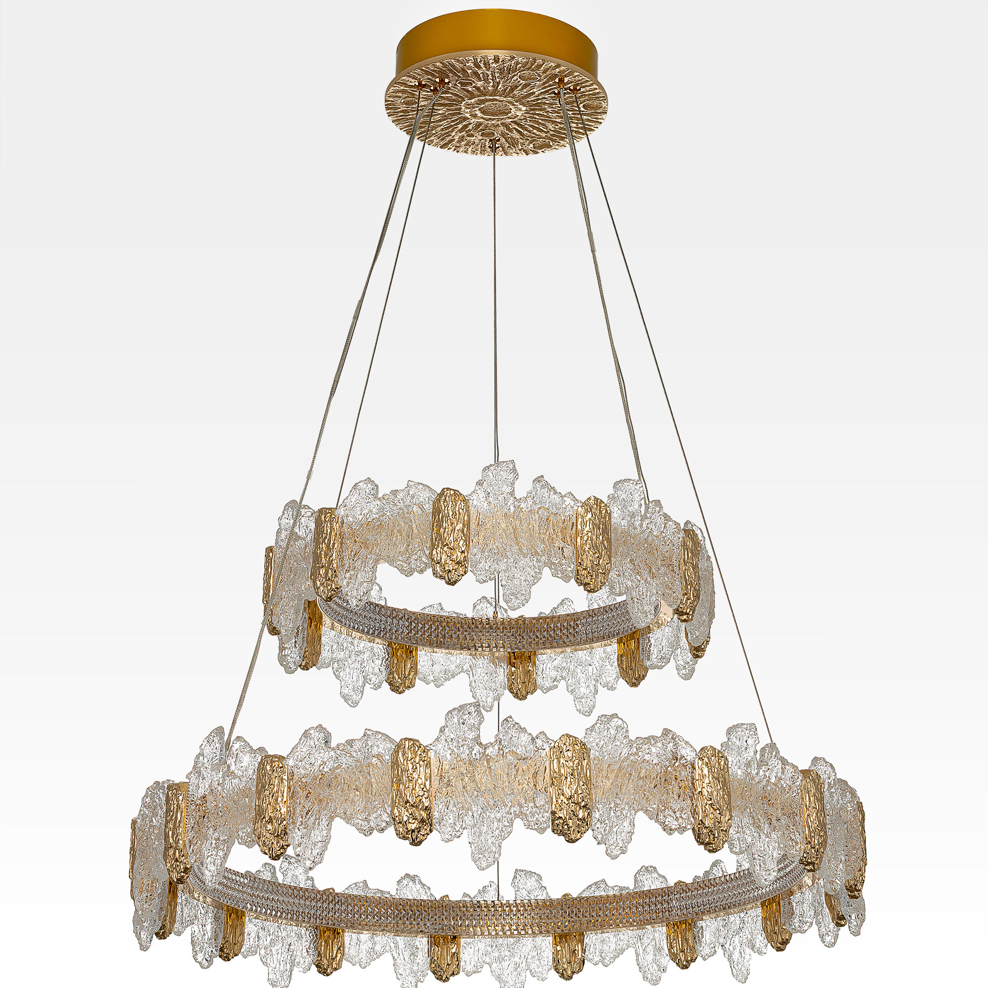 Каркас люстры — металлический, роскошного золотистого оттенка. Два подвесных кольца закреплены на тонких тросах и будто парят в воздухе. Рассеиватель из оптического полимера имеет оригинальную форму, напоминающую потоки застывшей лавы. Люстра подойдет к любому типу потолка, включая натяжные конструкции, высоту подвеса можно легко изменить.